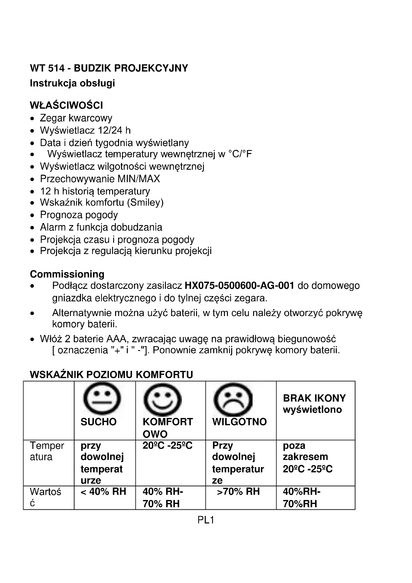 Zegar kwarcowy Wyświetlacz 12/24 h Data i dzień tygodnia wyświetlany Wyświetlacz temperatury wewnętrznej w °C/°F Wyświetlacz wilgotności wewnętrznej Przechowywanie MIN/MAX 12 h historią temperatury Wskaźnik komfortu (Smiley) Prognoza pogody Alarm z funkcja dobudzania Projekcja czasu i prognoza pogody Projekcja z regulacją kierunku projekcji Commissioning Podłącz dostarczony zasilacz HX075-0500600-AG-001 do domowego gniazdka elektrycznego i do tylnej części zegara. Alternatywnie można użyć baterii, w tym celu należy otworzyć pokrywę komory baterii. Włóż 2 baterie AAA, zwracając uwagę na prawidłową biegunowość [ oznaczenia "+" i " -"]. Ponownie zamknij pokrywę komory baterii.
