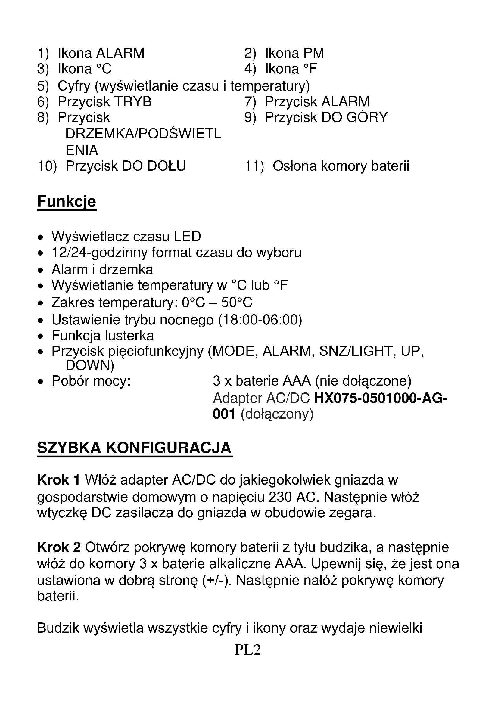 Po pierwszym podłączeniu do sieci zegar podświetli wyświetlacz LED i rozlegnie się sygnał dźwiękowy. Podświetlenie LED wyświetlacza pozostanie włączone, jeśli urządzenie jest zasilane adapterem.