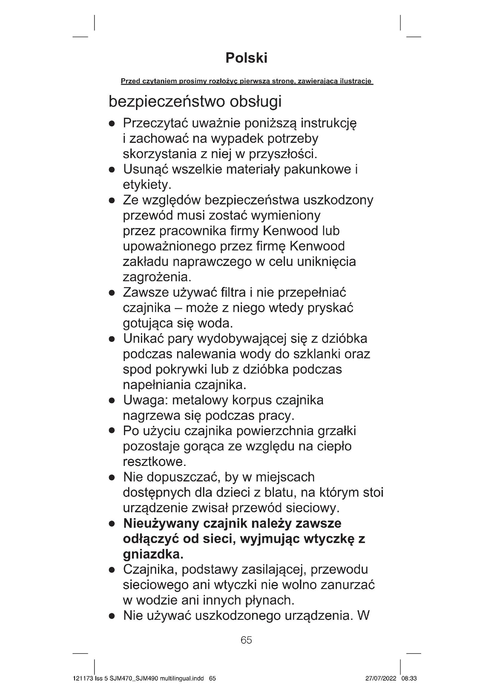 Nie używać uszkodzonego urządzenia. W Polski Przed czytaniem prosimy rozłożyç pierwszą stronę, zawierającą ilustracje 121173 Iss 5 SJM470_SJM490 multilingual.indd 65121173 Iss 5 SJM470_SJM490 multilingual.indd 65 27/07/2022 08:3327/07/2022 08:3366 razie awarii oddać je do sprawdzenia lub naprawy ( zob. ustęp pt. „serwis i punkty obsługi klienta”).