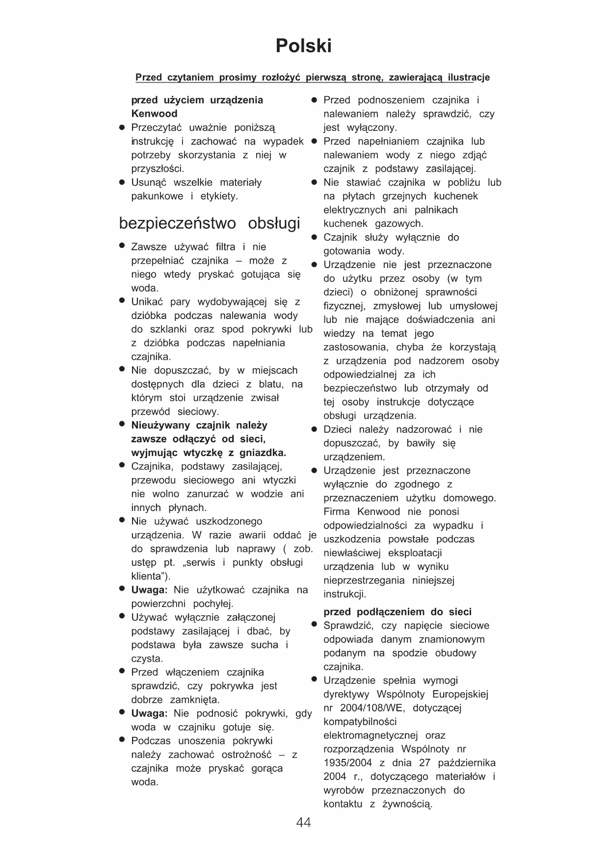 2002/96/WE. Po zakończeniu okresu użytkowania produktu nie wolno wyrzucać razem z innymi odpadami komunalnymi. Należy go dostarczyć do prowadzonego przez władze miejskie punktu zajmującego się segregacją odpadów lub zakładu oferującego tego rodzaju usługi. Osobne usuwanie sprzętu AGD pozwala uniknąć szkodliwego wpływu na środowisko naturalne i zdrowie ludzkie, wynikającego z nieodpowiedniego usuwania tego rodzaju sprzętu, oraz umożliwia odzyskiwanie materiałów, z których sprzęt ten został wykonany, a w konsekwencji znaczną oszczędność energii i zasobów naturalnych. O konieczności osobnego usuwania sprzętu AGD przypomina umieszczony na produkcie symbol przekreślonego pojemnika na śmieci. 47П еред использованием электроприбора Kenwood