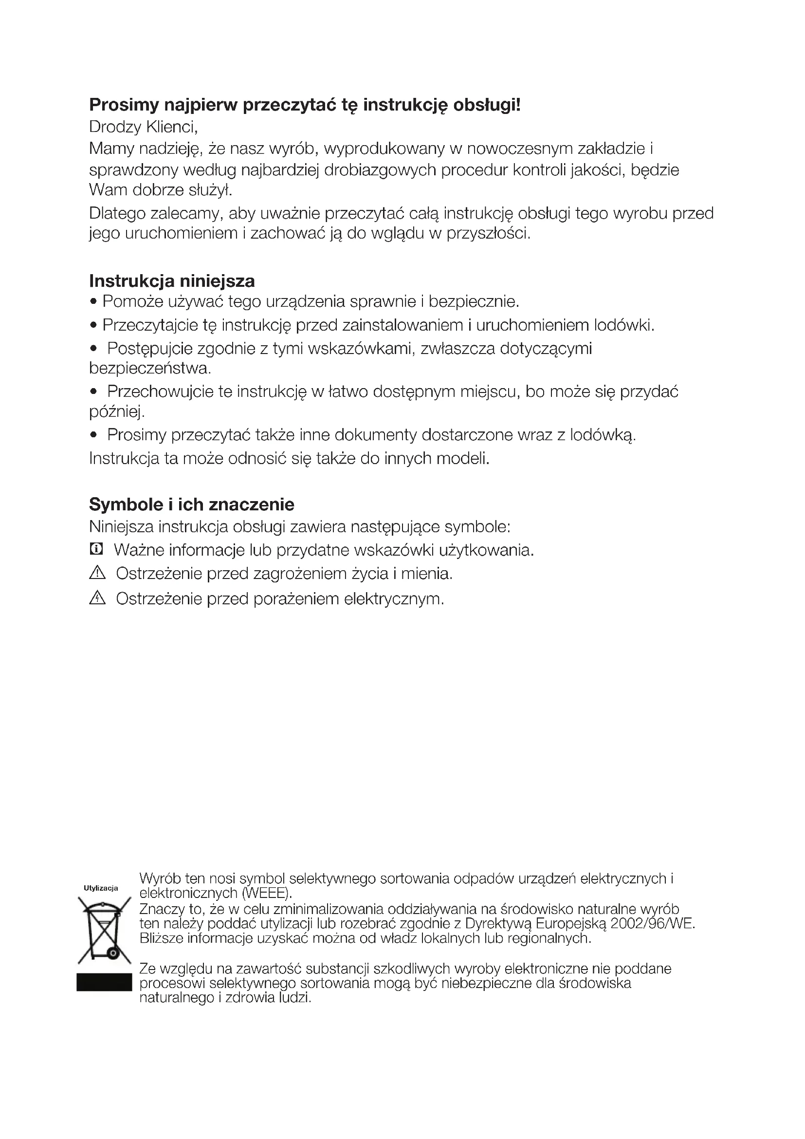 - Prosimy przeczytać także inne dokumenty dostarczone wraz z lodówką. Instrukcja ta może odnosić się także do innych modeli. Symbole i ich znaczenie Niniejsza instrukcja obsługi zawiera następujące symbole: C Ważne informacje lub przydatne wskazówki użytkowania. A Ostrzeżenie przed zagrożeniem życia i mienia. B Ostrzeżenie przed porażeniem elektrycznym. Wyrób ten nosi symbol selektywnego sortowania odpadów urządzeń elektrycznych i elektronicznych (WEEE). Znaczy to, że w celu zminimalizowania oddziaływania na środowisko naturalne wyrób ten należy poddać utylizacji lub rozebrać zgodnie z Dyrektywą Europejską 2002/96/WE. Bliższe informacje uzyskać można od władz lokalnych lub regionalnych. Ze względu na zawartość substancji szkodliwych wyroby elektroniczne nie poddane procesowi selektywnego sortowania mogą być niebezpieczne dla środowiska naturalnego i zdrowia ludzi. UtylizacjaPL