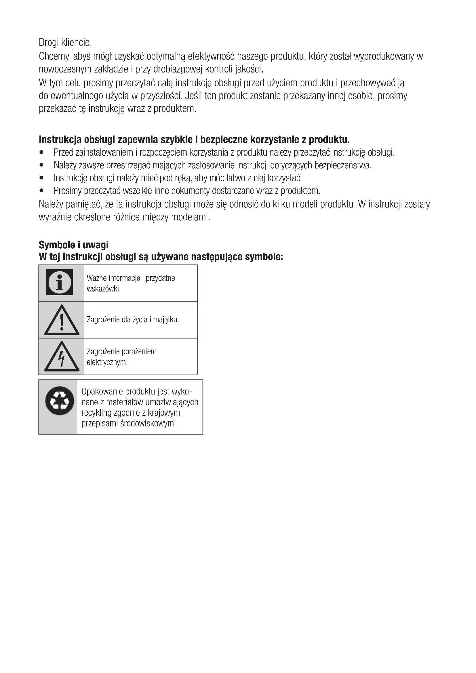 or an Authorized Service. Do not try to repair the product.Drogi kliencie, Chcemy, abyś mógł uzyskać optymalną efektywność naszego produktu, który został wyprodukowany w nowoczesnym zakładzie i przy drobiazgowej kontroli jakości. W tym celu prosimy przeczytać całą instrukcję obsługi przed użyciem produktu i przechowywać ją do ewentualnego użycia w przyszłości. Jeśli ten produkt zostanie przekazany innej osobie, prosimy przekazać tę instrukcję wraz z produktem. Instrukcja obsługi zapewnia szybkie i bezpieczne korzystanie z produktu. t Przed zainstalowaniem i rozpoczęciem korzystania z produktu należy przeczytać instrukcję obsługi. t Należy zawsze przestrzegać mających zastosowanie instrukcji dotyczących bezpieczeństwa. t Instrukcję obsługi należy mieć pod ręką, aby móc łatwo z niej korzystać. t Prosimy przeczytać wszelkie inne dokumenty dostarczane wraz z produktem. Należy pamiętać, że ta instrukcja obsługi może się odnosić do kilku modeli produktu. W instrukcji zostały wyraźnie określone różnice między modelami. Symbole i uwagi W tej instrukcji obsługi są używane następujące symbole: