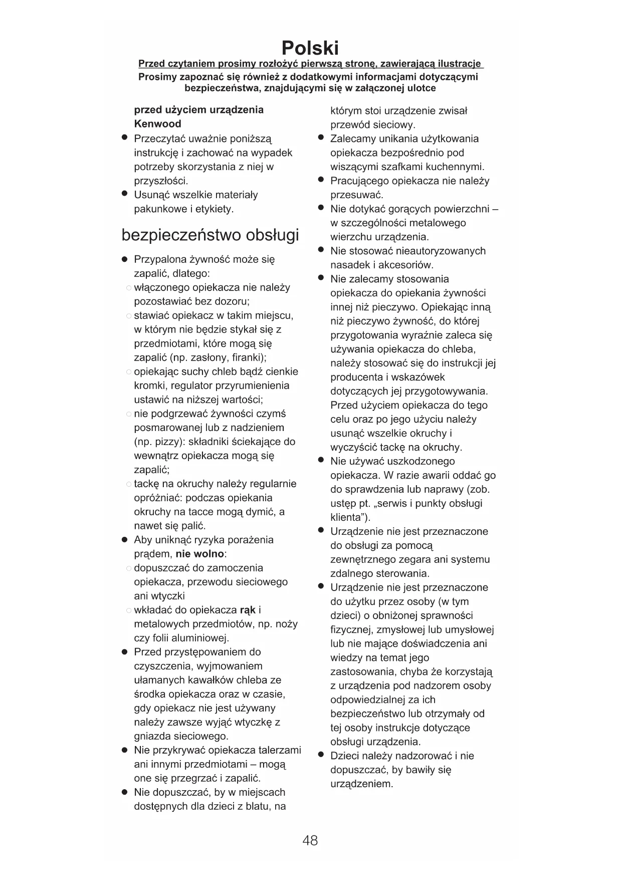 Polski Przed czytaniem prosimy roz¢o¯yç pierwszå stronë, zawierajåcå ilustracje Prosimy zapoznać się również z dodatkowymi informacjami dotyczącymi bezpieczeństwa, znajdującymi się w załączonej ulotce● Urządzenie jest przeznaczone wyłącznie do zgodnego z przeznaczeniem użytku domowego. Firma Kenwood nie ponosi odpowiedzialności za wypadki i uszkodzenia powstałe podczas niewłaściwej eksploatacji urządzenia lub w wyniku nieprzestrzegania niniejszej instrukcji. przed podłączeniem do sieci