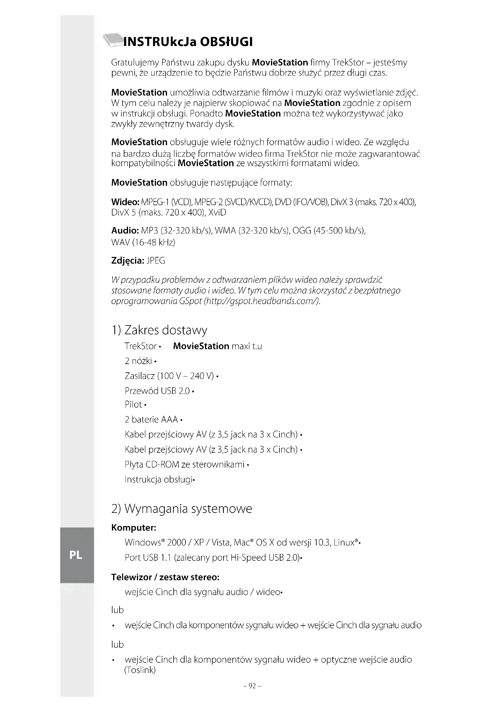 – 93 – INSTRUkcJa OBSłUGI Gratulujemy Państwu zakupu dysku MovieStation firmy TrekStor – jesteśmy pewni, że urządzenie to będzie Państwu dobrze służyć przez długi czas. MovieStation umożliwia odtwarzanie filmów i muzyki oraz wyświetlanie zdjęć. W tym celu należy je najpierw skopiować na MovieStation zgodnie z opisem w instrukcji obsługi. Ponadto MovieStation można też wykorzystywać jako zwykły zewnętrzny twardy dysk. MovieStation obsługuje wiele różnych formatów audio i wideo. Ze względu na bardzo dużą liczbę formatów wideo firma TrekStor nie może zagwarantować kompatybilności MovieStation ze wszystkimi formatami wideo. MovieStation obsługuje następujące formaty: Wideo: MPEG-1 (VCD), MPEG-2 (SVCD/KVCD), DVD (IFO/VOB), DivX 3 (maks. 720 x 400), DivX 5 (maks. 720 x 400), XviD Audio: MP3 (32-320 kb/s), WMA (32-320 kb/s), OGG (45-500 kb/s), WAV (16-48 kHz) Zdjęcia: JPEG W przypadku problemów z odtwarzaniem plików wideo należy sprawdzić stosowane formaty audio i wideo. W tym celu można skorzystać z bezpłatnego oprogramowania GSpot (http://gspot.headbands.com/).