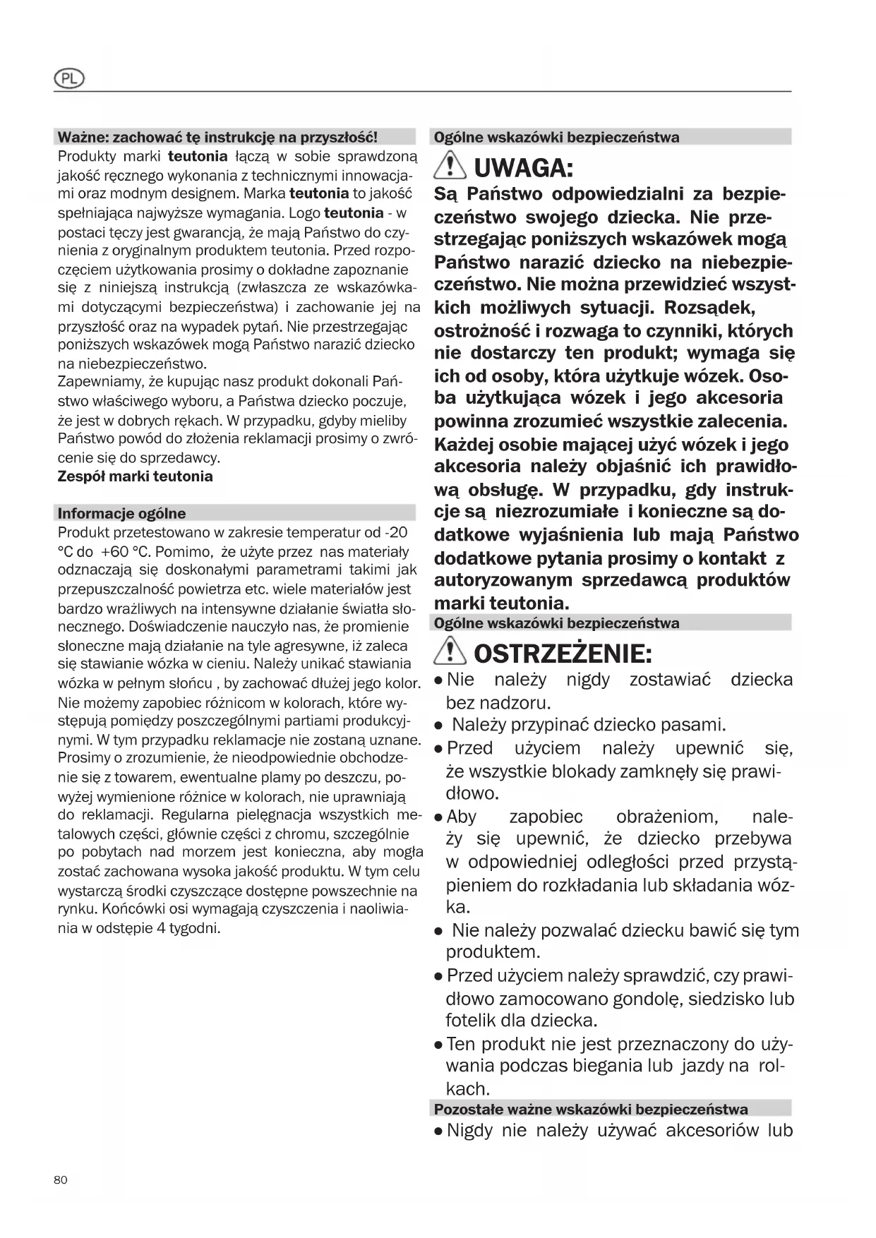 POZOR: Při potahování sedadla veďte konec 5bodo- vého popruhu zpět příslušnými otvory a dbejte, aby se nepřekroutil. Sundání a upevnění potahu loketní opěrky Potah loketní opěrky upevněte v opačném pořadí úko- nů. Čištění textilních částí Malé skvrny můžete jemně odstranit pomocí hadříku a čisté vody. Vyhněte se silnému tlaku, zvláště pokud je potah tmavé barvy. Všechny odnímatelné části můžete prát v pračce na 30°C (šetrný cyklus), použijte jemný prací prostředek bez optických zjasňovačů. Sledujte instrukce na textilních částech. Sundání a omytí boudy Vyjměte tyče z boudy: uvolněte stiskací knoflíky a vytáh- něte tyče krytu z kloubu a z boudy. Po omytí smontujte v opačném pořadí úkonů. Povolte šroub pomocí šroubováku a odstraňte patentní knoflík. Nyní vytáhněte z kloubu a ze zakrývacího po- tahu vzpěry. Po vyprání proveďte montáž v opačném pořadí. Dbejte nato, aby byly vzpěry zasunuty do obou prošitých vedení. Přední a zadní vzpěra nesmí být zaměněna. Sundání a upevnění potahu opěrky hlavy Potah opěrky hlavy upevněte v opačném pořadí úkonů.80 Ważne: zachować tę instrukcję na przyszłość! Produkty marki teutonia łączą w sobie sprawdzoną jakość ręcznego wykonania z technicznymi innowacja- mi oraz modnym designem. Marka teutonia to jakość spełniająca najwyższe wymagania. Logo teutonia - w postaci tęczy jest gwarancją, że mają Państwo do czy- nienia z oryginalnym produktem teutonia. Przed rozpo- częciem użytkowania prosimy o dokładne zapoznanie się z niniejszą instrukcją (zwłaszcza ze wskazówka- mi dotyczącymi bezpieczeństwa) i zachowanie jej na przyszłość oraz na wypadek pytań. Nie przestrzegając poniższych wskazówek mogą Państwo narazić dziecko na niebezpieczeństwo. Zapewniamy, że kupując nasz produkt dokonali Pań- stwo właściwego wyboru, a Państwa dziecko poczuje, że jest w dobrych rękach. W przypadku, gdyby mieliby Państwo powód do złożenia reklamacji prosimy o zwró- cenie się do sprzedawcy. Zespół marki teutonia Informacje ogólne Produkt przetestowano w zakresie temperatur od -20 °C do +60 °C. Pomimo, że użyte przez nas materiały odznaczają się doskonałymi parametrami takimi jak przepuszczalność powietrza etc. wiele materiałów jest bardzo wrażliwych na intensywne działanie światła sło- necznego. Doświadczenie nauczyło nas, że promienie słoneczne mają działanie na tyle agresywne, iż zaleca się stawianie wózka w cieniu. Należy unikać stawiania wózka w pełnym słońcu , by zachować dłużej jego kolor. Nie możemy zapobiec różnicom w kolorach, które wy- stępują pomiędzy poszczególnymi partiami produkcyj- nymi. W tym przypadku reklamacje nie zostaną uznane. Prosimy o zrozumienie, że nieodpowiednie obchodze- nie się z towarem, ewentualne plamy po deszczu, po- wyżej wymienione różnice w kolorach, nie uprawniają do reklamacji. Regularna pielęgnacja wszystkich me- talowych części, głównie części z chromu, szczególnie po pobytach nad morzem jest konieczna, aby mogła zostać zachowana wysoka jakość produktu. W tym celu wystarczą środki czyszczące dostępne powszechnie na rynku. Końcówki osi wymagają czyszczenia i naoliwia- nia w odstępie 4 tygodni. Ogólne wskazówki bezpieczeństwa UWAGA: Są Państwo odpowiedzialni za bezpie- czeństwo swojego dziecka. Nie prze- strzegając poniższych wskazówek mogą Państwo narazić dziecko na niebezpie- czeństwo. Nie można przewidzieć wszyst- kich możliwych sytuacji. Rozsądek, ostrożność i rozwaga to czynniki, których nie dostarczy ten produkt; wymaga się ich od osoby, która użytkuje wózek. Oso- ba użytkująca wózek i jego akcesoria powinna zrozumieć wszystkie zalecenia. Każdej osobie mającej użyć wózek i jego akcesoria należy objaśnić ich prawidło- wą obsługę. W przypadku, gdy instruk- cje są niezrozumiałe i konieczne są do- datkowe wyjaśnienia lub mają Państwo dodatkowe pytania prosimy o kontakt z autoryzowanym sprzedawcą produktów marki teutonia. Ogólne wskazówki bezpieczeństwa OSTRZEŻENIE: ● Nie należy nigdy zostawiać dziecka bez nadzoru. ● Należy przypinać dziecko pasami. ● Przed użyciem należy upewnić się, że wszystkie blokady zamknęły się prawi- dłowo. ● Aby zapobiec obrażeniom, nale- ży się upewnić, że dziecko przebywa w odpowiedniej odległości przed przystą- pieniem do rozkładania lub składania wóz- ka. ● Nie należy pozwalać dziecku bawić się tym produktem. ● Przed użyciem należy sprawdzić, czy prawi- dłowo zamocowano gondolę, siedzisko lub fotelik dla dziecka. ● Ten produkt nie jest przeznaczony do uży- wania podczas biegania lub jazdy na rol- kach. Pozostałe ważne wskazówki bezpieczeństwa ● Nigdy nie należy używać akcesoriów lub81 należy zawsze umieszczać po środku ko- sza na zakupy. ● Należy uważać podczas składania i rozkła- dania stelaża, aby nie przytrzasnąć siebie lub innych. ● Podczas przenoszenia wózka przez prze- szkody (np. schody) zwrócić uwagę na to, by żadna z blokad nie została odbezppie- czona. ● Podczas dokonywania regulacji należy zwrócić uwagę na to, by Państwa dziecko nie znalazło się w zasięgu ruchomych czę- ści. ● Zbyt duże obciążenie, nieprawidłowe skła- danie lub użytkowanie z niedozwolonymi akcesoriami może być przyczyną uszko- dzenia lub zniszczenia wózka. ● Podnóżek nie został przewidziany do trans- portu ciężarów lub drugiego dziecka. ● Przed pierwszym użyciem wózka należy: usunąć wszystkie naklejki i zawieszki, któ- re NIE zawierają wskazówek bezpieczeń- stwa. ● Nie należy nigdy używać podnóżka lub pa- łąka ochronnego do podnoszenia lub prze- noszenia wózka. ● Dla dzieci w wieku do 6 miesięcy zaleca się korzystanie tylko z oparcia w najniższym położeniu. ● Jeśli odwracają Państwo b