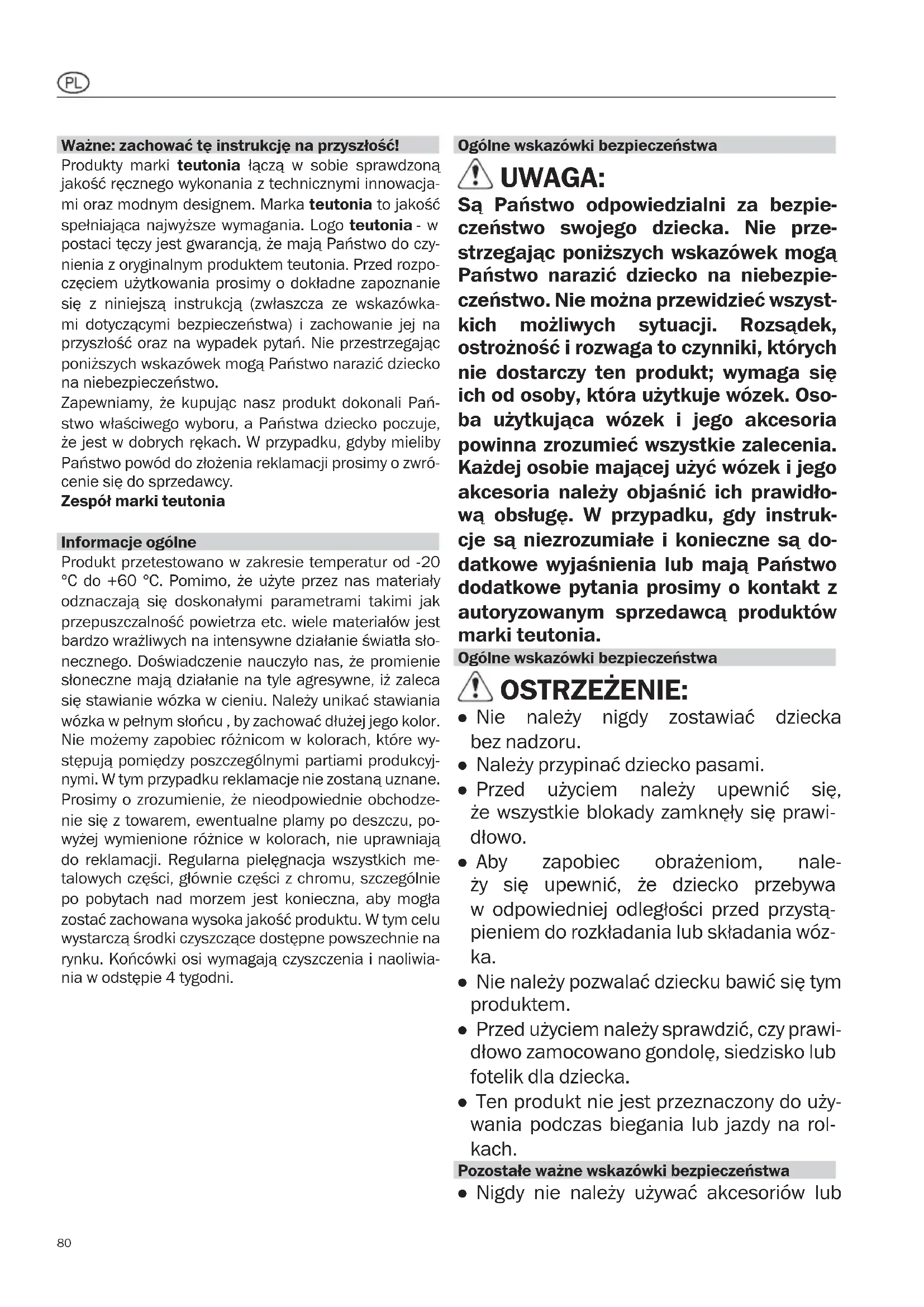 Sa Panstwo odpowiedzialni za bezpieczentwo swojejego danecka. Nie przystrzejagac ponieszych wskazowej moga Paanstwo narazić danecko na niebezpieczentwo. Nie mayna przywidziec wsystkich moziwych sytuaci. Rozsagynek, ostrożnosć i rozwaga to czynniki, krórych nie dostarczy ten produkt; wymaga sie ich od osoby, która uzytkuje wozek. Osoba uzytkujaca wozek i和他的 akcesoria powinna zrozumiec wsystkie zalecenia. Kaźdej osobie majacej uzyc wozek i seinen akcesoria naleźny objasnic ich prawidłowā obstuge. W przypadku, gdy instrukcje są niedrozumiale i konieczne są dodatkowe wyjasnienia lub majora Paanstwo dodatkowe pytania prosimy okontakt z autoryzowanym sprezdawca produktów marki teutonia.