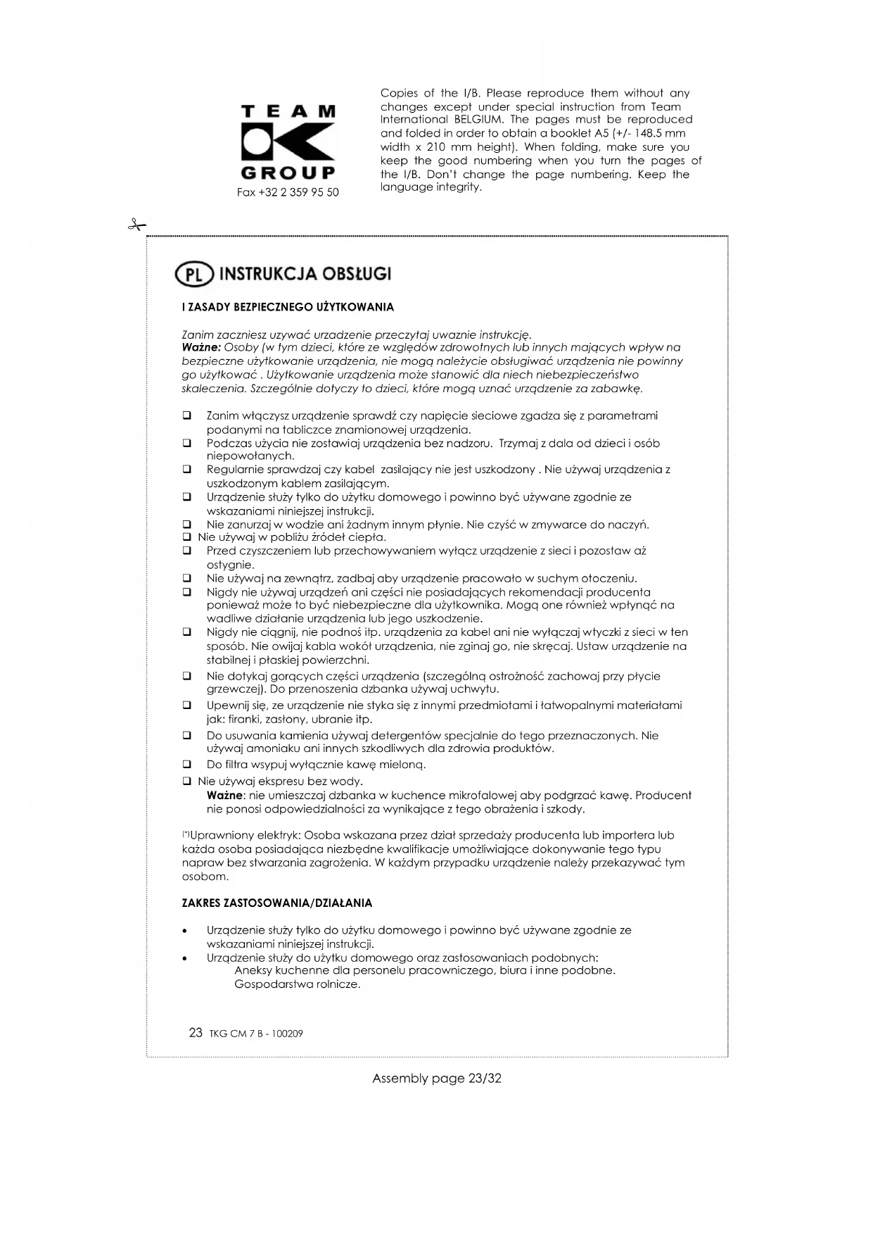 Symbol na tabliczce znamionowej urządzenia oznacza, że produktu nie wolno wyrzucać razem z innymi odpadami z gospodarstw domowych. Polskie prawo zabrania pod karą grzywny łączenia zużytego sprzętu elektrycznego i elektronicznego wraz z innymi odpadami. Dbając o pozbycie się produktu w należyty sposób, można zapobiec potencjalnym negatywnym skutkom dla środowiska naturalnego i zdrowia ludzkiego, jakie mogłyby wyniknąć z niewłaściwego postępowania z odpadami powstałymi ze zużytego sprzętu elektronicznego. Copies of the I/B. Please reproduce them without any changes except under special instruction from Team International BELGIUM. The pages must be reproduced and folded in order to obtain a booklet A5 (+/- 148.5 mm width x 210 mm height). When folding, make sure you keep the good numbering when you turn the pages of the I/B. Don’t change the page numbering. Keep the language integrity.