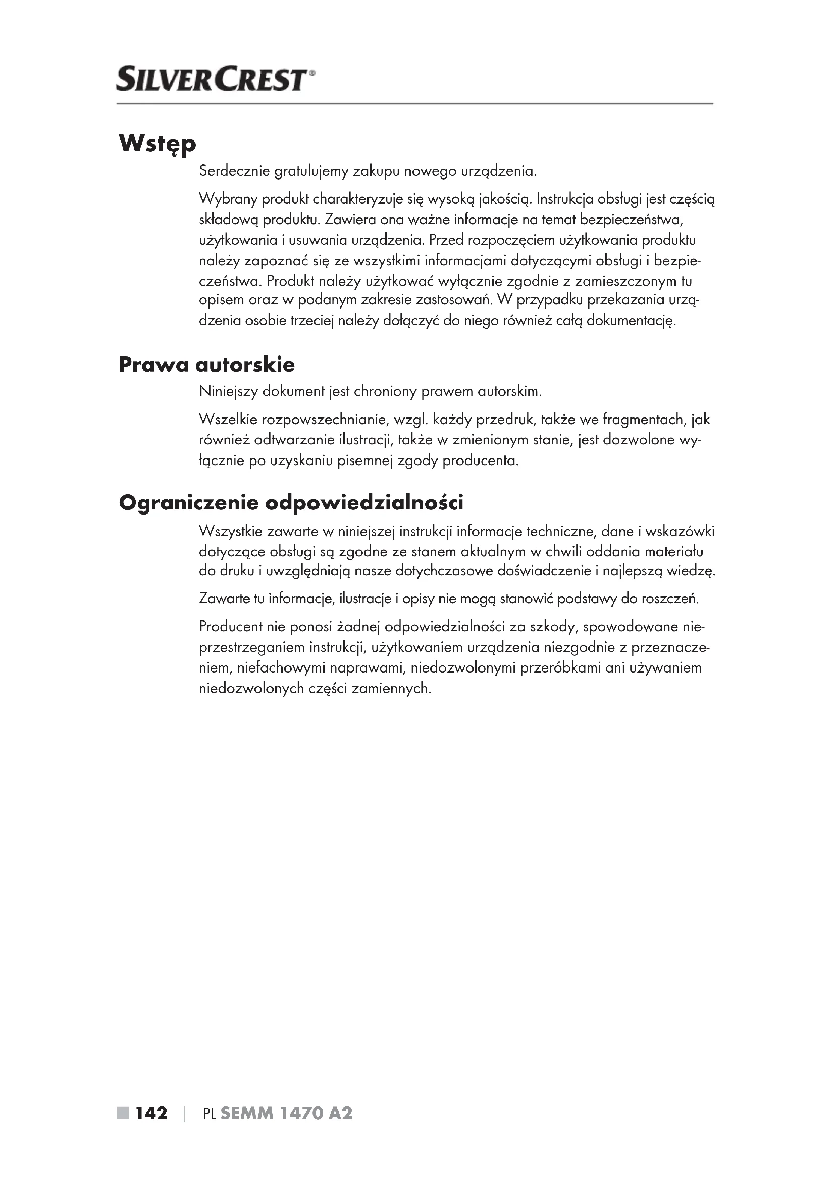 Wstęp Serdecznie gratulujemy zakupu nowego urządzenia. Wybrany produkt charakteryzuje się wysoką jakością. Instrukcja obsługi jest częścią składową produktu. Zawiera ona ważne informacje na temat bezpieczeństwa, użytkowania i usuwania urządzenia. Przed rozpoczęciem użytkowania produktu należy zapoznać się ze wszystkimi informacjami dotyczącymi obsługi i bezpie- czeństwa. Produkt należy użytkować wyłącznie zgodnie z zamieszczonym tu opisem oraz w podanym zakresie zastosowań. W przypadku przekazania urzą- dzenia osobie trzeciej należy dołączyć do niego również całą dokumentację. Prawa autorskie Niniejszy dokument jest chroniony prawem autorskim. Wszelkie rozpowszechnianie, wzgl. każdy przedruk, także we fragmentach, jak również odtwarzanie ilustracji, także w zmienionym stanie, jest dozwolone wy- łącznie po uzyskaniu pisemnej zgody producenta. Ograniczenie odpowiedzialności Wszystkie zawarte w niniejszej instrukcji informacje techniczne, dane i wskazówki dotyczące obsługi są zgodne ze stanem aktualnym w chwili oddania materiału do druku i uwzględniają nasze dotychczasowe doświadczenie i najlepszą wiedzę. Zawarte tu informacje, ilustracje i opisy nie mogą stanowić podstawy do roszczeń. Producent nie ponosi żadnej odpowiedzialności za szkody, spowodowane nie- przestrzeganiem instrukcji, użytkowaniem urządzenia niezgodnie z przeznacze- niem, niefachowymi naprawami, niedozwolonymi przeróbkami ani używaniem niedozwolonych części zamiennych. IB_341821_SEMM1470A2_LB8.indb 142 05.05.2020 15:12:01PL