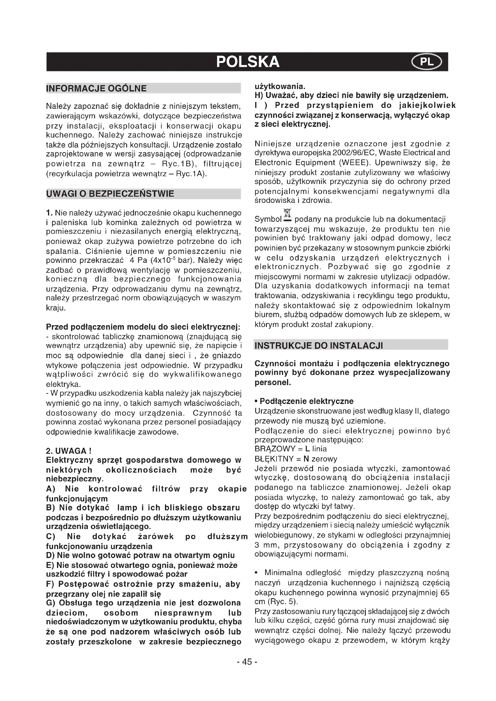 Elektryczny sprzęt gospodarstwa domowego w niektórych okolicznościach może być niebezpieczny. A) Nie kontrolować filtrów przy okapie funkcjonującym B) Nie dotykać lamp i ich bliskiego obszaru podczas i bezpośrednio po dłuższym użytkowaniu urządzenia oświetlającego. C) Nie dotykać żarówek po dłuższym funkcjonowaniu urządzenia D) Nie wolno gotować potraw na otwartym ogniu E) Nie stosować otwartego ognia, ponieważ może uszkodzić filtry i spowodować pożar F) Postępować ostrożnie przy smażeniu, aby przegrzany olej nie zapalił się G) Obsługa tego urządzenia nie jest dozwolona dzieciom, osobom niesprawnym lub niedoświadczonym w użytkowaniu produktu, chyba że są one pod nadzorem właściwych osób lub zostały przeszkolone w zakresie bezpiecznego użytkowania. H) Uważać, aby dzieci nie bawiły się urządzeniem. I ) Przed przystąpieniem do jakiejkolwiek czynności związanej z konserwacją, wyłączyć okap z sieci elektrycznej. Niniejsze urządzenie oznaczone jest zgodnie z dyrektywa europejska 2002/96/EC, Waste Electrical and Electronic Equipment (WEEE). Upewniwszy się, że niniejszy produkt zostanie zutylizowany we właściwy sposób, użytkownik przyczynia się do ochrony przed potencjalnymi konsekwencjami negatywnymi dla środowiska i zdrowia. Symbol podany na produkcie lub na dokumentacji towarzyszącej mu wskazuje, że produktu ten nie powinien być traktowany jaki odpad domowy, lecz powinien być przekazany w stosownym punkcie zbiórki w celu odzyskania urządzeń elektrycznych i elektronicznych. Pozbywać się go zgodnie z miejscowymi normami w zakresie utylizacji odpadów. Dla uzyskania dodatkowych informacji na temat traktowania, odzyskiwania i recyklingu tego produktu, należy skontaktować się z odpowiednim lokalnym biurem, służbą odpadów domowych lub ze sklepem, w którym produkt został zakupiony.