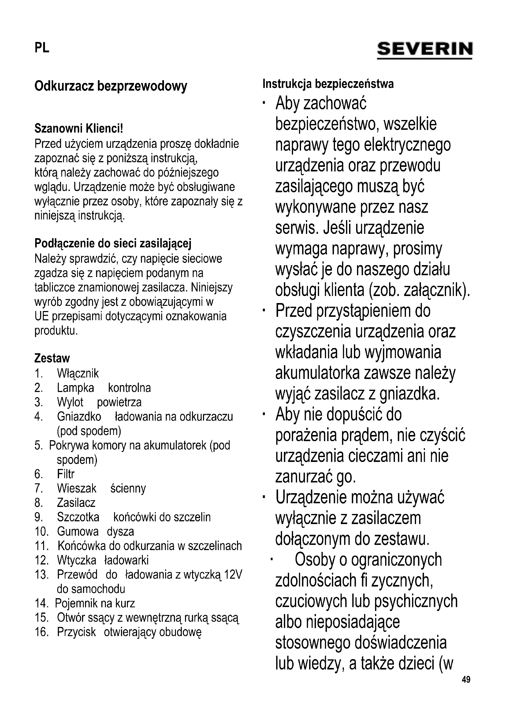 stosownego doświadczenia lub wiedzy, a także dzieci (w PL50 wieku co najmniej 8 lat), mogą korzystać z urządzenia, pod warunkiem że znajdują się pod nadzorem lub zostały poinstruowane, jak używać urządzenia i są w pełni świadome wszelkich zagrożeń i wymaganych środków ostrożności. ∙ Nie dopuszczać do używania urządzenia jako zabawki przez dzieci. ∙ Nie wolno pozwalać dzieciom na wykonywanie jakichkolwiek prac związanych bezpośrednio z konserwacją lub czyszczeniem urządzenia bez nadzoru osoby dorosłej. ∙ Nie dopuszczać do urządzenia i jego przewodu zasilającego dzieci poniżej 8 lat. ∙ Uwaga: Nie pozwalać, aby dzieci miały dostęp do elementów opakowania, ponieważ mogą one spowodować zagrożenie, np. uduszenia. ∙ Nie należy uruchamiać odkurzacza bez fi ltra. ∙ Przed użyciem należy dokładnie sprawdzić, czy główny korpus urządzenia i wszystkie elementy czynnościowe są sprawne i nie noszą śladów uszkodzenia. Jeżeli urządzenie np. spadło na twardą powierzchnię albo przewód zasilający został narażony na zbyt silne szarpnięcie, nie nadaje się ono do dalszego użytku: nawet najmniejsza, niewidoczna usterka powstała z tego powodu, może mieć ujemny wpływ na działanie urządzenia i bezpieczeństwo użytkownika. ∙ Przewód zasilający nie może być skręcony ani mocno zagięty i należy ułożyć go w taki sposób, aby nikt nie mógł się o niego potknąć. ∙ Nie wolno używać urządzenia do odkurzania gorących powierzchni i nie wolno dopuścić, aby wsysało ono substancje kwasowe lub łatwopalne. Nie odkurzać bardzo drobnego pyłu, jak mąka czy toner w proszku. ∙ Urządzenie oraz przewód sieciowy nie mogą stykać się z gorącymi powierzchniami, ani też być poddawane działaniu wysokich temperatur. ∙ W żadnym wypadku nie podejmować prób rozebrania akumulatorka; nie narażać go na działanie wysokiej temperatury (np. zostawiając w nasłonecznionym miejscu) ani nie wrzucać do ognia. ∙ Nie spinać na krótko dwóch biegunów akumulatorka, tj. nie dotykać jednocześnie obu końcówek, zwłaszcza przedmiotami przewodzącymi prąd. Akumulatorek należy przechowywać w taki sposób, aby nie mogło dojść do przypadkowego spięcia przez metalowy przedmiot albo kontaktu z innymi akumulatorkami lub bateriami. ∙ Nie należy używać uszkodzonego akumulatorka. Wyjąć ostrożnie akumulatorek z urządzenia i zutylizować go zgodnie z przepisami. Nie dopuszczać do kontaktu skóry z jakąkolwiek wyciekającą cieczą.51 ∙ Za szkody wynikłe z nieprawidłowego używania sprzętu lub użytkowania niezgodnego z instrukcją obsługi winę ponosi wyłącznie użytkownik. ∙ Urządzenie przeznaczone jest do zastosowań domowych lub podobnych, jak np. w - kuchniach biurowych lub innych miejscach pracy; - agroturystyce; - hotelach, motelach itp. oraz innych podobnych lokalach (przez klientów); - pensjonatach. Zawieszenie na ścianie Wieszak ścienny przeznaczony jest do przechowywania i ładowania urządzenia. Najpierw należy włożyć wtyczkę przewodu zasilającego do wieszaka, skierowanego w górę. Za pomocą śrubek znajdujących się w komplecie należy przytwierdzić uchwyt do ściany w pozycji pionowej w pobliżu gniazdka elektrycznego. Końcówkę do szczelin wraz ze szczotką oraz gumową dyszę można przechowywać na zaczepach z lewej i prawej strony urządzenia. Podłączanie akumulatorka Komora na akumulatorek mieści się w dolnej ściance urządzenia. Otworzyć komorę odkręcając wkrętakiem śrubkę w jej pokrywie. Wyjąć akumulatorek i połączyć ze sobą obydwa złącza (przewodu w komorze i przewodu akumulatorka) w taki sposób, aby zaczep zahaczył się o ogranicznik. Włożyć akumulatorek do urządzenia i założyć złącza wzdłuż akumulatorka. Nałożyć z powrotem pokrywę komory baterii i przykręcić ją śrubką. Ładowanie akumulatorka Przed użyciem odkurzacza po raz pierwszy, baterie należy ładować przez około 10 godzin. ∙ Podłączyć zasilacz do gniazdka elektrycznego. ∙ Ustawić przełącznik On/Off w pozycji Off. ∙ Wstawić odkurzacz do wieszaka zamontowanego na ścianie. Proces ładowania rozpocznie się automatycznie a lampka kontrolna zapali się na czerwono. Wyłączenie się lampki kontrolnej oznacza, że urządzenie jest gotowe do użytku. ∙ Urządzenie możne się ładować przez czas nieokreślony. Nie stwarza to żadnego zagrożenia ani nie powoduje uszkodzeń, a odkurzacz będzie w każdej chwili gotowy do użytku. ∙ Po każdorazowym użyciu odkurzacza, należy go ponownie połączyć z zasilaczem, aby naładować akumulatorek. Odkurzacz można ładować nieprzerwanie przez czas nieokreślony i nie stanowi to żadnego zagrożenia ani nie powoduje uszkodzeń. W trakcie ładowania, zasilacz nagrzewa się. Jest to zupełnie normalne i nie oznacza awarii lub niebezpieczeństwa. ∙ Pojemność akumulatorka może się obniżyć, jeśli odkurzacz nie jest przez dłuższy czas używany. Akumulatorek odzyska pełną pojemność po kilku cyklach ładowania i rozładowywania. Instrukcja obsługi wtyczki 12V ∙ Dzięki wtyczce 12 V akumulatorek można ładować za pomocą samochodowego gniazdka zapalniczki. ∙ W łożyć małą wtyczkę przewodu zasilającego do 12V gniazdka w52 odkurzaczu a większą wtyczkę do gniazdka zapalniczki w samochodzie. ∙ Zasilanie jest wówczas podawane bezpośrednio z obwodu elektrycznego w samochodzie; lampka kontrolna świeci na czerwono. Zbieranie substancji płynnych Przed przystąpieniem do zbierania substancji płynnej należy sprawdzić, czy dysza gumowa jest prawidłowo umieszczona w otworze ssącym. Końcówka do odkurzania w szczelinach Służy do odkurzania w szczelinach, zagłębieniach i innych trudno dostępnych miejscach. Szczotka końcówki do szczelin Można ją nałożyć na końcówkę do szczelin, dzięki czemu łatwiej odkurza się nie równe powierzchnie, takie jak np. klawiaturę. Instrukcja u