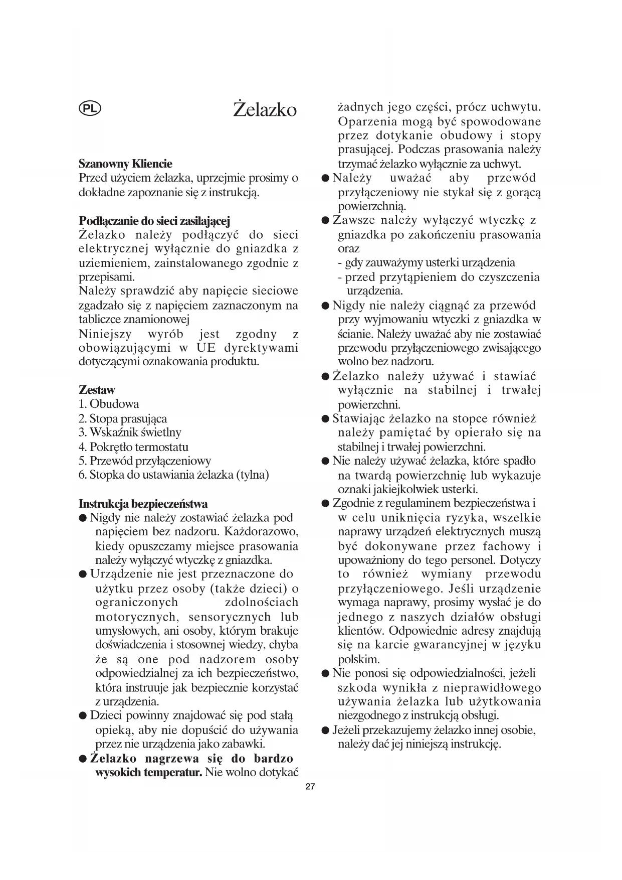 Instrukcja bezpieczeństwa ● Nigdy nie należy zostawiać żelazka pod napięciem bez nadzoru. Każdorazowo, kiedy opuszczamy miejsce prasowania należy wyłączyć wtyczkę z gniazdka. ● Urządzenie nie jest przeznaczone do użytku przez osoby (także dzieci) o ograniczonych zdolnościach motorycznych, sensorycznych lub umysłowych, ani osoby, którym brakuje doświadczenia i stosownej wiedzy, chyba że są one pod nadzorem osoby odpowiedzialnej za ich bezpieczeństwo, która instruuje jak bezpiecznie korzystać z urządzenia. ● Dzieci powinny znajdować się pod stałą opieką, aby nie dopuścić do używania przez nie urządzenia jako zabawki. ● Żelazko nagrzewa się do bardzo wysokich temperatur. Nie wolno dotykać żadnych jego części, prócz uchwytu. Oparzenia mogą być spowodowane przez dotykanie obudowy i stopy prasującej. Podczas prasowania należy trzymać żelazko wyłącznie za uchwyt. ● Należy uważać aby przewód przyłączeniowy nie stykał się z gorącą powierzchnią. ● Zawsze należy wyłączyć wtyczkę z gniazdka po zakończeniu prasowania oraz - gdy zauważymy usterki urządzenia - przed przytąpieniem do czyszczenia urządzenia. ● Nigdy nie należy ciągnąć za przewód przy wyjmowaniu wtyczki z gniazdka w ścianie. Należy uważać aby nie zostawiać przewodu przyłączeniowego zwisającego wolno bez nadzoru. ● Żelazko należy używać i stawiać wyłącznie na stabilnej i trwałej powierzchni. ● Stawiając żelazko na stopce również należy pamiętać by opierało się na stabilnej i trwałej powierzchni. ● Nie należy używać żelazka, które spadło na twardą powierzchnię lub wykazuje oznaki jakiejkolwiek usterki. ● Zgodnie z regulaminem bezpieczeństwa i w celu uniknięcia ryzyka, wszelkie naprawy urządzeń elektrycznych muszą być dokonywane przez fachowy i upoważniony do tego personel. Dotyczy to również wymiany przewodu przyłączeniowego. Jeśli urządzenie wymaga naprawy, prosimy wysłać je do jednego z naszych działów obsługi klientów. Odpowiednie adresy znajdują się na karcie gwarancyjnej w języku polskim. ● Nie ponosi się odpowiedzialności, jeżeli szkoda wynikła z nieprawidłowego używania żelazka lub użytkowania niezgodnego z instrukcją obsługi. ● Jeżeli przekazujemy żelazko innej osobie, należy dać jej niniejszą instrukcję.