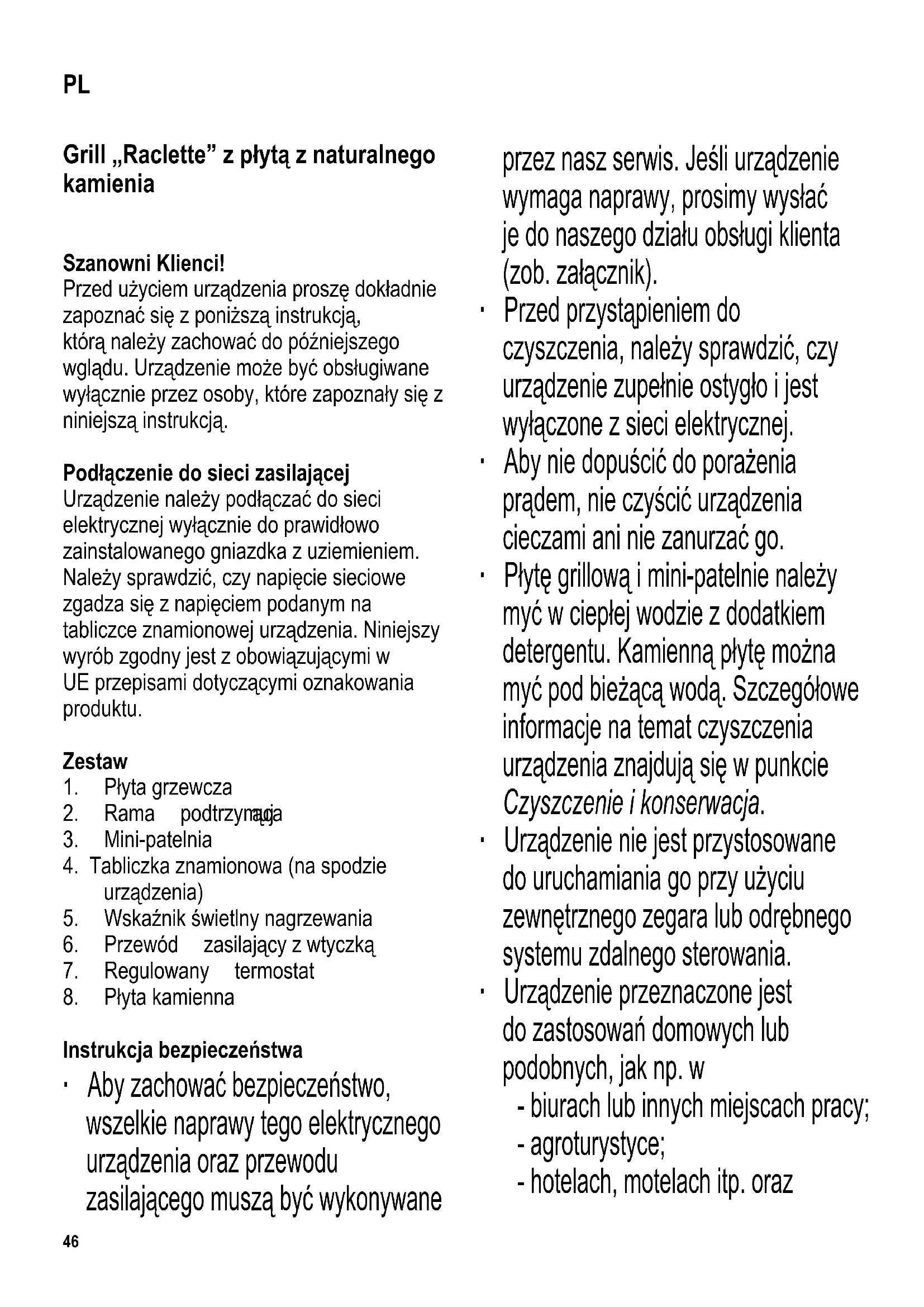 Instrukcja bezpieczeństwa ∙ Aby zachować bezpieczeństwo, wszelkie naprawy tego elektrycznego urządzenia oraz przewodu zasilającego muszą być wykonywane przez nasz serwis. Jeśli urządzenie wymaga naprawy, prosimy wysłać je do naszego działu obsługi klienta (zob. załącznik). ∙ Przed przystąpieniem do czyszczenia, należy sprawdzić, czy urządzenie zupełnie ostygło i jest wyłączone z sieci elektrycznej. ∙ Aby nie dopuścić do porażenia prądem, nie czyścić urządzenia cieczami ani nie zanurzać go. ∙ P łytę grillową i mini-patelnie należy myć w ciepłej wodzie z dodatkiem detergentu. Kamienną płytę można myć pod bieżącą wodą. Szczegółowe informacje na temat czyszczenia urządzenia znajdują się w punkcie Czyszczenie i konserwacja. ∙ Urządzenie nie jest przystosowane do uruchamiania go przy użyciu zewnętrznego zegara lub odrębnego systemu zdalnego sterowania. ∙ Urządzenie przeznaczone jest do zastosowań domowych lub podobnych, jak np. w - biurach lub innych miejscach pracy; - agroturystyce; - hotelach, motelach itp. oraz PL47 innych podobnych lokalach (przez klientów); - pensjonatach. ∙ Osoby o ograniczonych zdolnościach fi zycznych, czuciowych lub psychicznych albo nieposiadające stosownego doświadczenia lub wiedzy, a także dzieci (w wieku co najmniej 8 lat), mogą korzystać z urządzenia, pod warunkiem że znajdują się pod nadzorem lub zostały poinstruowane, jak używać urządzenia i są w pełni świadome wszelkich zagrożeń i wymaganych środków ostrożności. ∙ Nie dopuszczać do używania urządzenia jako zabawki przez dzieci. ∙ Nie wolno pozwalać dzieciom na wykonywanie jakichkolwiek prac związanych bezpośrednio z konserwacją lub czyszczeniem urządzenia, a jeżeli już, to dziecko musi mieć co najmniej 8 lat i być nadzorowane przez osobę doros łą. ∙ Nie dopuszczać do urządzenia i jego przewodu zasilającego dzieci poniżej 8 lat. ∙ Ostrzeżenie: Nie pozwalać, aby dzieci miały dostęp do elementów opakowania, ponieważ mogą one spowodować zagrożenie, np. uduszenia. ∙ Przed użyciem urządzenia należy dokładnie sprawdzić, czy korpus, przewód zasilający oraz inne elementy są sprawne i wolne od wad. Jeżeli urządzenie np. spadło na twardą powierzchnię albo przewód zasilający został narażony na zbyt silne szarpnięcie, nie nadaje się ono do dalszego użytku: nawet najmniejsza, niewidoczna usterka powstała z tego powodu, może mieć ujemny wpływ na działanie urządzenia i bezpieczeństwo użytkownika. ∙ Przewód zasilający nie powinien zwisać swobodnie i należy uważać, aby znajdował się w bezpiecznej odległości od gorących elementów urządzenia. ∙ Ostrzeżenie: Dotknięcie grozi oparzeniem. W trakcie pracy urządzenia jego obudowa, powierzchnie grillowania i mini-patelnie rozgrzewają się do wysokiej temperatury. ∙ Nie zostawiać włączonego urządzenia bez nadzoru. ∙ W czasie pracy urządzenie musi być umieszczone na powierzchni odpornej na wysokie temperatury, plamy i rozgrzany tłuszcz. Podczas opiekania żywności z dużą zawartością tłuszczu nie zawsze można uniknąć odprysków. ∙ Nie stawiać grilla w rogu ani nie opierać go o ścianę. Upewnić się, czy w pobliżu nie znajdują się żadne materiały łatwopalne. ∙ Przed uruchomieniem urządzenia należy założyć nad elementem grzejnym płytę kamienną i płytę grzewczą. ∙ Ostrzeżenie: Urządzenie nie nadaje się do użytku na zewnątrz.48 ∙ Wtyczkę należy wyjąć z gniazdka elektrycznego: - po zakończeniu pracy; - w przypadku stwierdzenia usterki urządzenia; - i przed przystąpieniem do czyszczenia. ∙ Wyjmując wtyczkę z gniazdka nigdy nie należy szarpać za przewód. ∙ Urządzenie można używać wyłącznie w połączeniu z akcesoriami producenta, zgodnie z ich przeznaczeniem. ∙ Przed przystąpieniem do zdejmowania płyty kamiennej i płyty grzewczej, czyszczenia lub składania urządzenia odczekać, aż wystarczająco ostygnie. ∙ Za szkody wynikłe z nieprawidłowego używania sprzętu lub użytkowania niezgodnego z instrukcją obsługi winę ponosi wy łącznie użytkownik. Obsługa Przed pierwszym użyciem Zdjąć wszystkie elementy opakowania. Przed pierwszym włączeniem urządzenia wyczyścić płytę kamienną, płytę grzewczą i mini-patelnie wilgotną ściereczką. Zaleca się rozgrzanie urządzenia wraz z patelniami na około 10 minut, bez żywności, aby pozbyć się zapachu typowego dla pierwszego uruchomienia grilla. Ponieważ z urządzenia może wydobyć się niewielka ilość dymu, w czasie wykonywania tej czynności należy zapewnić odpowiednią wentylację w pomieszczeniu. Kamienna płyta ∙ Położyć kamienną płytę na elemencie grzejnym gładką stroną do góry. Grubsza, środkowa część płyty musi spoczywać pomiędzy dwiema szynami ramy, które utrzymają płytę w bezpiecznej i stabilnej pozycji. ∙ Uwaga: nie należy kłaść zimnej płyty na gorącym elemencie grzejnym. ∙ Kamienną płytę można używać do pieczenia/smażenia warzyw, plasterków mięsa, ryb itp. ∙ Płyta kamienna wykonana jest z naturalnego materiału. Niewielkie pęknięcia wynikające z naturalnego rozkurczania i kurczenia się płyty podczas ogrzewania i stygnięcia urządzenia są zjawiskiem normalnym, podobnie jak zmiana barwy na ciemniejszą. Nie ma to negatywnego wpływu na pracę urządzenia. ∙ Na płycie kamiennej nie należy umieszczać zamrożonej żywności ani produktów zawierających cukier (jak np. korniszony czy musztarda). Płyta grzewcza Przed włączeniem urządzenia ustawić płytę na górze, nad elementem grzejnym, żeberkowaną stroną skierowaną w górę w taki sposób, aby rowki na spodzie płyty wpasowały się w ramę, unieruchamiając całkowicie płytę. ∙ Płyta grzewcza przeznaczona jest do grillowania warzyw, mięsa i ryb. Regulowany termostat ∙ Regulowany termostat steruje czasem pracy elementu grzejnego, o k