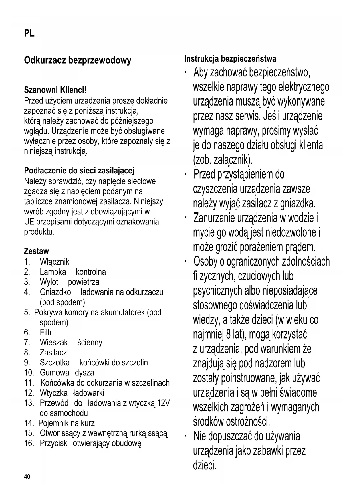 Instrukcja bezpieczeństwa ∙ Aby zachować bezpieczeństwo, wszelkie naprawy tego elektrycznego urządzenia muszą być wykonywane przez nasz serwis. Jeśli urządzenie wymaga naprawy, prosimy wysłać je do naszego działu obsługi klienta (zob. załącznik). ∙ Przed przystąpieniem do czyszczenia urządzenia zawsze należy wyjąć zasilacz z gniazdka. ∙ Zanurzanie urządzenia w wodzie i mycie go wodą jest niedozwolone i może grozić porażeniem prądem. ∙ Osoby o ograniczonych zdolnościach fi zycznych, czuciowych lub psychicznych albo nieposiadające stosownego doświadczenia lub wiedzy, a także dzieci (w wieku co najmniej 8 lat), mogą korzystać z urządzenia, pod warunkiem że znajdują się pod nadzorem lub zostały poinstruowane, jak używać urz ądzenia i są w pełni świadome wszelkich zagrożeń i wymaganych środków ostrożności. ∙ Nie dopuszczać do używania urządzenia jako zabawki przez dzieci. PL41 ∙ Nie wolno pozwalać dzieciom na wykonywanie jakichkolwiek prac związanych bezpośrednio z konserwacją lub czyszczeniem urządzenia bez nadzoru osoby dorosłej. ∙ Nie dopuszczać do urządzenia i jego przewodu zasilającego dzieci poniżej 8 lat. ∙ Uwaga: Nie pozwalać, aby dzieci miały dostęp do elementów opakowania, ponieważ mogą one spowodować zagrożenie, np. uduszenia. ∙ Nie należy uruchamiać odkurzacza bez fi ltra. ∙ Przed użyciem należy dokładnie sprawdzić, czy główny korpus urządzenia i wszystkie elementy czynnościowe są sprawne i nie noszą śladów uszkodzenia. Jeżeli urządzenie np. spadło na twardą powierzchnię albo przewód zasilający został narażony na zbyt silne szarpnięcie, nie nadaje się ono do dalszego użytku: nawet najmniejsza, niewidoczna usterka powstała z tego powodu, może mieć ujemny wpływ na działanie urządzenia i bezpieczeństwo użytkownika. ∙ Nie wolno używać urządzenia do odkurzania gorących powierzchni i nie wolno dopuścić, aby wsysało ono substancje kwasowe lub łatwopalne. ∙ Za szkody wynikłe z nieprawidłowego używania sprzętu lub użytkowania niezgodnego z instrukcją obsługi winę ponosi wyłącznie użytkownik. ∙ Urządzenie przeznaczone jest do zastosowań domowych lub podobnych, jak np. w - biurach lub innych miejscach pracy; - agroturystyce; - hotelach, motelach itp. oraz innych podobnych lokalach (przez klientów); - pensjonatach. Zawieszenie na ścianie Wieszak ścienny przeznaczony jest do przechowywania i ładowania urządzenia. Najpierw należy włożyć wtyczkę przewodu zasilającego do wieszaka, skierowanego w górę. Za pomocą śrubek znajdujących się w komplecie należy przytwierdzić uchwyt do ściany w pozycji pionowej w pobliżu gniazdka elektrycznego. Końcówkę do szczelin wraz ze szczotką oraz gumową dyszę można przechowywać na zaczepach z lewej i prawej strony urządzenia. Ładowanie akumulatorka Przed użyciem odkurzacza po raz pierwszy, baterie należy ładować przez około 10 godzin. ∙ Podłączyć zasilacz do gniazdka elektrycznego. ∙ Ustawić przełącznik On/Off w pozycji Off. ∙ Wstawić odkurzacz do wieszaka zamontowanego na ścianie. Proces ładowania rozpocznie się automatycznie a lampka kontrolna zapali się na czerwono. Wyłączenie się lampki kontrolnej oznacza, że urządzenie jest gotowe do użytku. ∙ Urządzenie możne się ładować przez czas nieokreślony. Nie stwarza to żadnego zagrożenia ani nie powoduje uszkodzeń, a odkurzacz będzie w każdej chwili gotowy do użytku. ∙ Po każdorazowym użyciu odkurzacza, należy go ponownie połączyć z zasilaczem, aby naładować42 akumulatorek. Odkurzacz można ładować nieprzerwanie przez czas nieokreślony i nie stanowi to żadnego zagrożenia ani nie powoduje uszkodzeń. W trakcie ładowania, zasilacz nagrzewa się. Jest to zupełnie normalne i nie oznacza awarii lub niebezpieczeństwa. ∙ Pojemność akumulatorka może się obniżyć, jeśli odkurzacz nie jest przez dłuższy czas używany. Akumulatorek odzyska pełną pojemność po kilku cyklach ładowania i rozładowywania. Instrukcja obsługi wtyczki 12V ∙ Dzięki wtyczce 12 V akumulatorek można ładować za pomocą samochodowego gniazdka zapalniczki. ∙ W łożyć małą wtyczkę przewodu zasilającego do 12V gniazdka w odkurzaczu a większą wtyczk ę do gniazdka zapalniczki w samochodzie. ∙ Zasilanie jest wówczas podawane bezpośrednio z obwodu elektrycznego w samochodzie; lampka kontrolna świeci na czerwono. Zbieranie substancji płynnych Przed przystąpieniem do zbierania substancji płynnej należy sprawdzić, czy dysza gumowa jest prawidłowo umieszczona w otworze ssącym. Końcówka do odkurzania w szczelinach Służy do odkurzania w szczelinach, zagłębieniach i innych trudno dostępnych miejscach. Szczotka końcówki do szczelin Można ją nałożyć na końcówkę do szczelin, dzięki czemu łatwiej odkurza się nie równe powierzchnie, takie jak np. klawiaturę. Instrukcja użytkowania ∙ Zdjąć odkurzacz z wieszaka ściennego. ∙ Do otworu ssącego wsunąć żądaną końcówkę z zestawu. ∙ W łączyć urządzenie. Lampka kontrolna zapali się na zielono. ∙ Należy regularnie opróżniać pojemnik na kurz, zanim jego zawartość osiągnie poziom wewnętrznej rurki ssącej (zob. oznaczenie max). ∙ Kiedy akumulatorek zacznie się wyczerpywać w trakcie pracy, lampka kontrolna zacznie mrugać na zielono i po chwili urządzenie automatycznie wyłączy się – ma to na celu uniknięcie nadmiernego rozładowania się akumulatorka. Należy wówczas naładować akumulatorek. Przed podłączeniem urządzenia do zasilacza, zawsze należy sprawdzić, czy jest ono wyłączone. Czyszczenie urządzenia Uwagi ogólne ∙ Przed przystąpieniem do czyszczenia należy odłączyć urządzenie od zasilacza. ∙ Nie zanurzać odkurzacza ani zasilacza w wodzie, ani nie myć ich wodą, ponieważ grozi to porażeniem prądem. ∙ W razie potrzeby można zewnętrzną odbudowę odkurzacza prze