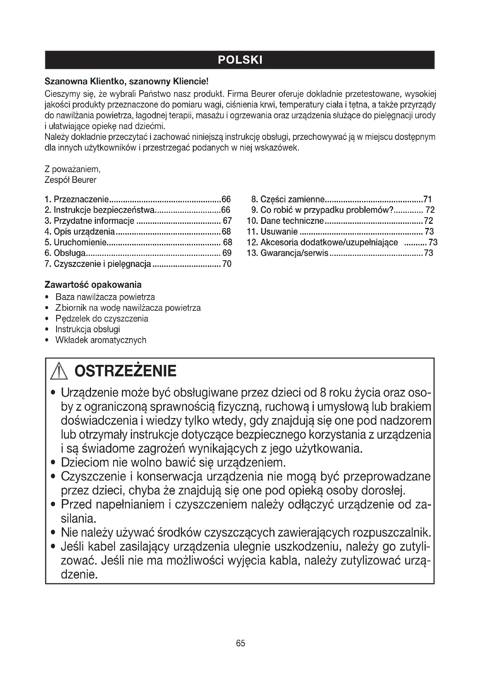 Более подробная информация по гарантии/сервису находится в гарантийном/сервисном талоне, который входит в комплект поставки. Возможны ошибки и изменения65 Szanowna Klientko, szanowny Kliencie! Cieszymy się, że wybrali Państwo nasz produkt. Firma Beurer oferuje dokładnie przetestowane, wysokiej jakości produkty przeznaczone do pomiaru wagi, ciśnienia krwi, temperatury ciała i tętna, a także przyrządy do nawilżania powietrza, łagodnej terapii, masażu i ogrzewania oraz urządzenia służące do pielęgnacji urody i ułatwiające opiekę nad dziećmi. Należy dokładnie przeczytać i zachować niniejszą instrukcję obsługi, przechowywać ją w miejscu dostępnym dla innych użytkowników i przestrzegać podanych w niej wskazówek. Z poważaniem, Zespół Beurer Zawartość opakowania
