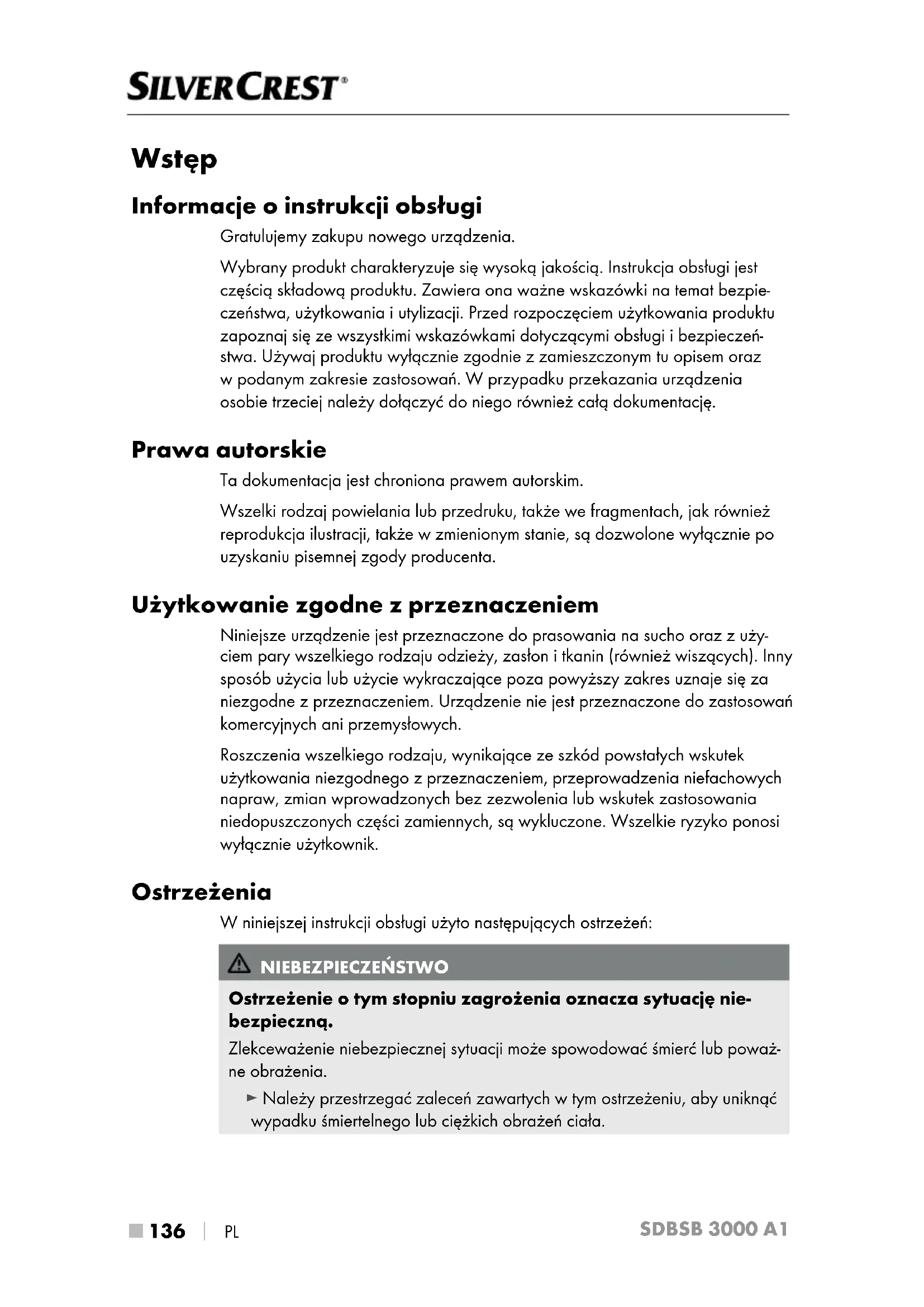 PL Wstęp Informacje oinstrukcji obsługi Gratulujemy zakupu nowego urządzenia. Wybrany produkt charakteryzuje się wysoką jakością. Instrukcja obsługi jest częścią składową produktu. Zawiera ona ważne wskazówki na temat bezpie- czeństwa, użytkowania iutylizacji. Przed rozpoczęciem użytkowania produktu zapoznaj się ze wszystkimi wskazówkami dotyczącymi obsługi ibezpieczeń- stwa. Używaj produktu wyłącznie zgodnie zzamieszczonym tu opisem oraz wpodanym zakresie zastosowań. Wprzypadku przekazania urządzenia osobie trzeciej należy dołączyć do niego również całą dokumentację. Prawa autorskie Ta dokumentacja jest chroniona prawem autorskim. Wszelki rodzaj powielania lub przedruku, także we fragmentach, jak również reprodukcja ilustracji, także wzmienionym stanie, są dozwolone wyłącznie po uzyskaniu pisemnej zgody producenta. Użytkowanie zgodne zprzeznaczeniem Niniejsze urządzenie jest przeznaczone do prasowania na sucho oraz z uży- ciem pary wszelkiego rodzaju odzieży, zasłon i tkanin (również wiszących). Inny sposób użycia lub użycie wykraczające poza powyższy zakres uznaje się za niezgodne zprzeznaczeniem. Urządzenie nie jest przeznaczone do zastosowań komercyjnych ani przemysłowych. Roszczenia wszelkiego rodzaju, wynikające ze szkód powstałych wskutek użytkowania niezgodnego zprzeznaczeniem, przeprowadzenia niefachowych napraw, zmian wprowadzonych bez zezwolenia lub wskutek zastosowania niedopuszczonych części zamiennych, są wykluczone. Wszelkie ryzyko ponosi wyłącznie użytkownik. Ostrzeżenia W niniejszej instrukcji obsługi użyto następujących ostrzeżeń: NIEBEZPIECZEŃSTWO Ostrzeżenie otym stopniu zagrożenia oznacza sytuację nie- bezpieczną. Zlekceważenie niebezpiecznej sytuacji może spowodować śmierć lub poważ- ne obrażenia. ► Należy przestrzegać zaleceń zawartych wtym ostrzeżeniu, aby uniknąć wypadku śmiertelnego lub ciężkich obrażeń ciała.SDBSB 3000 A1 PL
