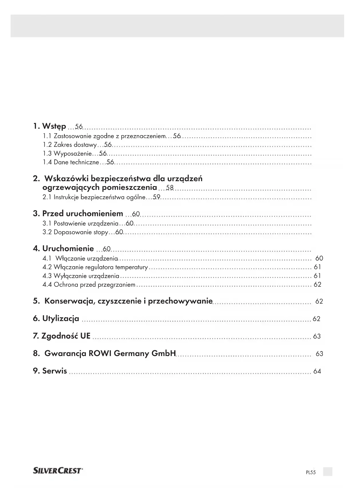 pomieszczenia Należy przeczytać wszystkie wskazówki bezpie- czeństwa i zalecenia. Nieprzestrzeganie wskazówek bezpieczeństwa i zaleceń może doprowadzić do ciężkich obrażeń i/lub szkód materialnych. Należy zachować wszystkie wskazówki bezpie-czeństwa i zalecenia do wykorzystania w przyszłości! OSTRZEŻENIE! Niebezpieczeństwo przegrzania! Aby zapobiec przegrzaniu urządzenia grzewczego, urządzenie grzewcze nie może być przykryte. Urządzenia grzewczego nie wolno umieszczać bezpośrednio pod gniazdem ściennym. Nie używać urządzenia grzewczego w bezpośrednim pobliżu wanny, prysznica bądź basenu kąpielowego. W przypadku uszkodzenia przewodu zasilającego urządzenia, w celu uniknięcia zagrożeń należy zlecić jego wymianę u producenta, w jego punkcie serwisowym lub u osoby posiadającej równorzędne kwalifikacje. OSTROŻNIE: Aby uniknąć niebezpieczeństwa związanego z nie- zamierzonym zresetowaniem ogranicznika temperatury , nie należy