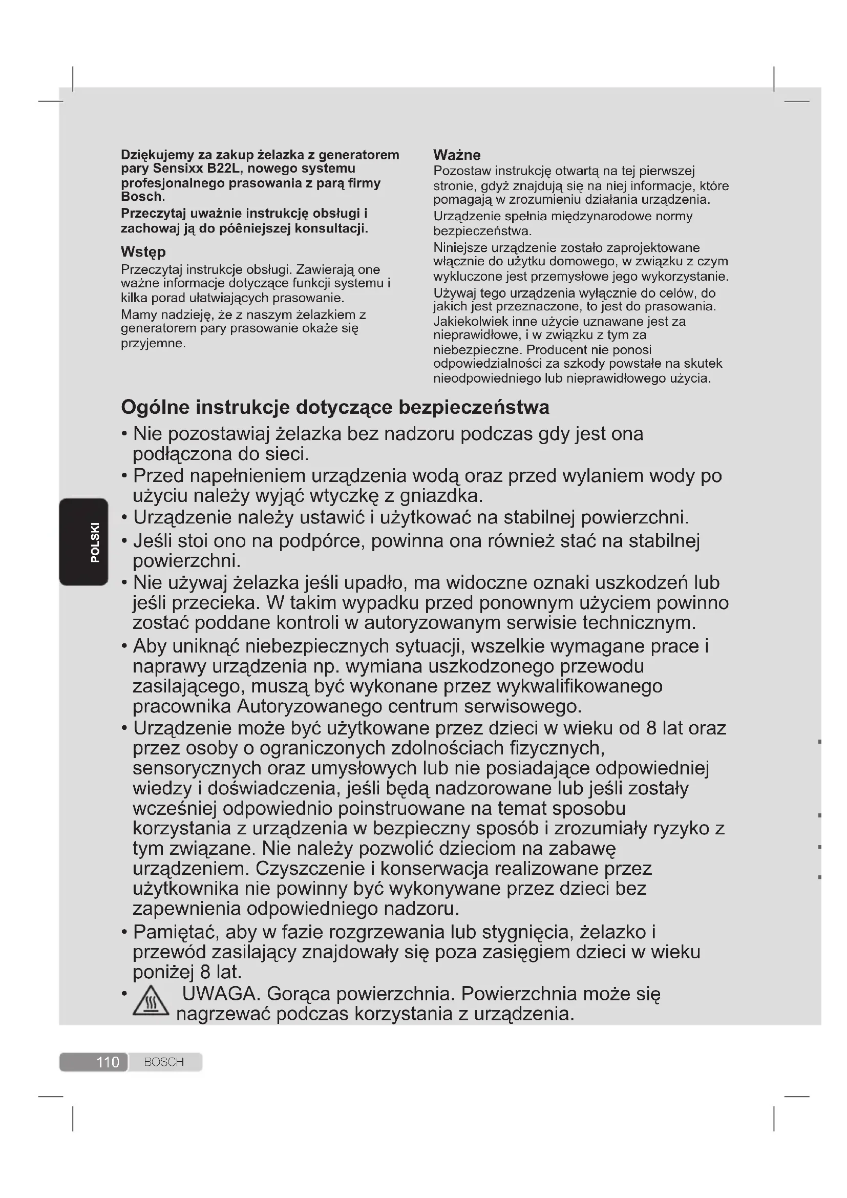 Podczas pracy urządzenie osiąga wysokie temperatury i generuje parę, co może być przyczyną oparzeń w przypadku niewłaściwego użycia. Przewód pary, stacja bazowa, metalowa płyta zdejmowanej podstawki żelazka (2) , a w szczególności samo żelazko mogą się mocno nagrzewać podczas używania. Jest to normalne. Nie kieruj strumienia pary w stronę osób lub zwierząt. Uważaj by kabel nie dotykał podstawy żelazka kiedy jest ono rozgrzane. Pamiętaj, że stacja prasująca może wydzielać parę jeszcze chwilę po zwolnieniu spustu pary. Jest prawidłowe działanie.111 B O S C H Pozostaw instrukcję otwartą na tej pierwszej stronie, gdyż znajdują się na niej informacje, które pomagają w zrozumieniu działania urządzenia.Urządzenie spełnia międzynarodowe normy bezpieczeństwa.Niniejsze urządzenie zostało zaprojektowane włącznie do użytku domowego, w związku z czym wykluczone jest przemysłowe jego wykorzystanie.Używaj tego urządzenia wyłącznie do celów, do jakich jest przeznaczone, to jest do prasowania. Jakiekolwiek inne użycie uznawane jest za nieprawidłowe, i w związku z tym za niebezpieczne. Producent nie ponosi odpowiedzialności za szkody powstałe na skutek nieodpowiedniego lub nieprawidłowego użycia.