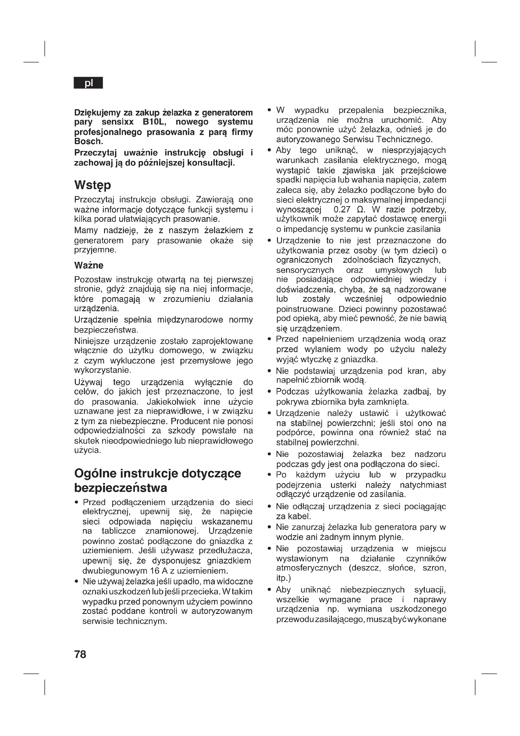 Dziękujemy za zakup żelazka z generatorem pary sensixx B10L, nowego systemu profesjonalnego prasowania z parą firmy Bosch. Przeczytaj uważnie instrukcję obsługi i zachowaj ją do póêniejszej konsultacji. Wstęp Przeczytaj instrukcje obsługi. Zawierają one ważne informacje dotyczące funkcji systemu i kilka porad ułatwiających prasowanie. Mamy nadzieję, że z naszym żelazkiem z generatorem pary prasowanie okaże się przyjemne. Ważne Pozostaw instrukcję otwartą na tej pierwszej stronie, gdyż znajdują się na niej informacje, które pomagają w zrozumieniu działania urządzenia. Urządzenie spełnia międzynarodowe normy bezpieczeństwa. Niniejsze urządzenie zostało zaprojektowane włącznie do użytku domowego, w związku z czym wykluczone jest przemysłowe jego wykorzystanie. Używaj tego urządzenia wyłącznie do celów, do jakich jest przeznaczone, to jest do prasowania. Jakiekolwiek inne użycie uznawane jest za nieprawidłowe, i w związku z tym za niebezpieczne. Producent nie ponosi odpowiedzialności za szkody powstałe na skutek nieodpowiedniego lub nieprawidłowego użycia. Ogólne instrukcje dotyczące bezpieczeństwa