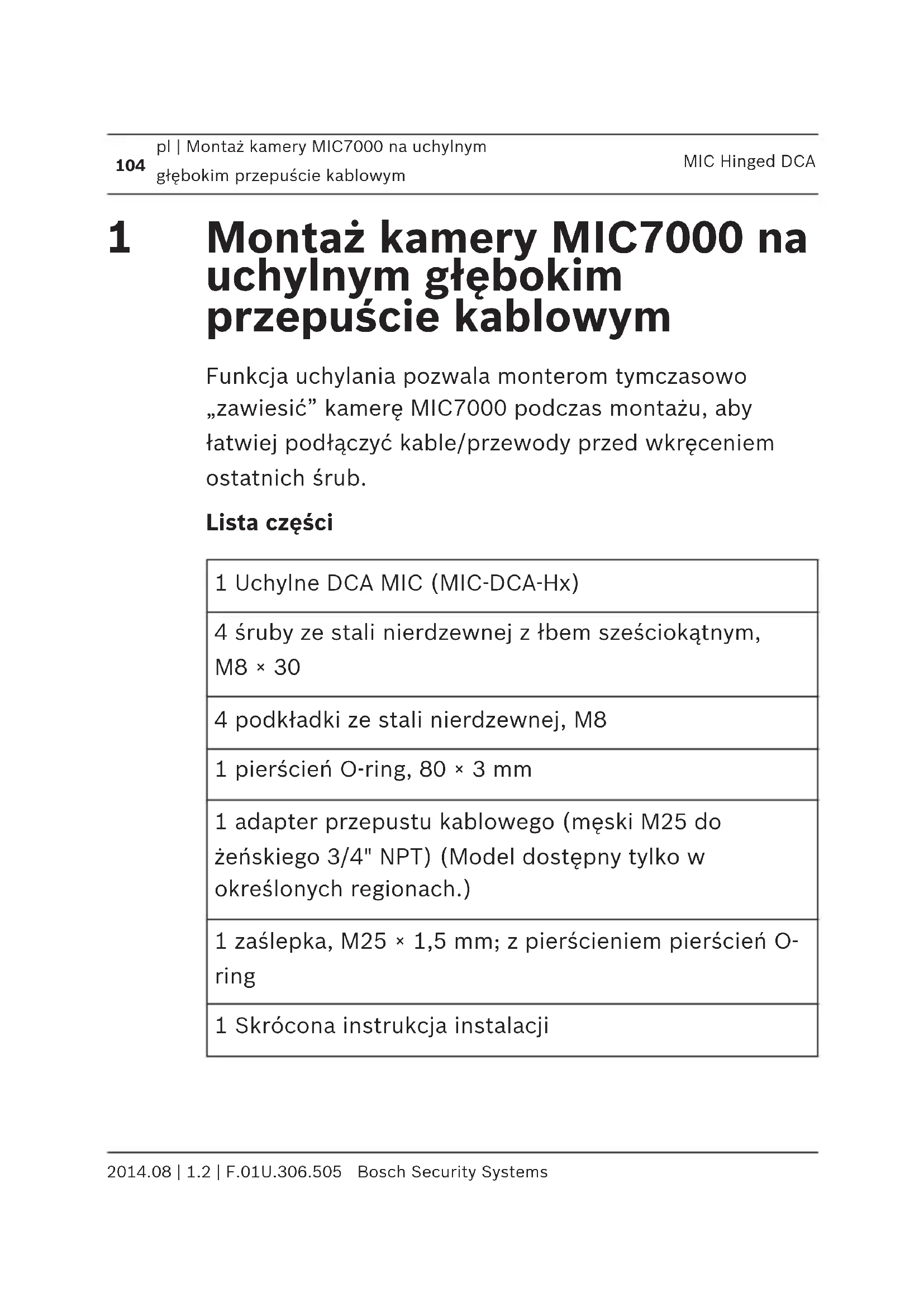 Bosch Security Systems 2014.08 | 1.2 | F.01U.306.505Montaż kamery MIC7000 na uchylnym głębokim przepuście kablowym Funkcja uchylania pozwala monterom tymczasowo „zawiesić” kamerę MIC7000 podczas montażu, aby łatwiej podłączyć kable/przewody przed wkręceniem ostatnich śrub. Lista części 1 Uchylne DCA MIC (MIC-DCA-Hx) 4 śruby ze stali nierdzewnej z łbem sześciokątnym, M8 × 30 4 podkładki ze stali nierdzewnej, M8 1 pierścień O-ring, 80 × 3 mm 1 adapter przepustu kablowego (męski M25 do żeńskiego 3/4" NPT) (Model dostępny tylko w określonych regionach.) 1 zaślepka, M25 × 1,5 mm; z pierścieniem pierścień O- ring 1 Skrócona instrukcja instalacji