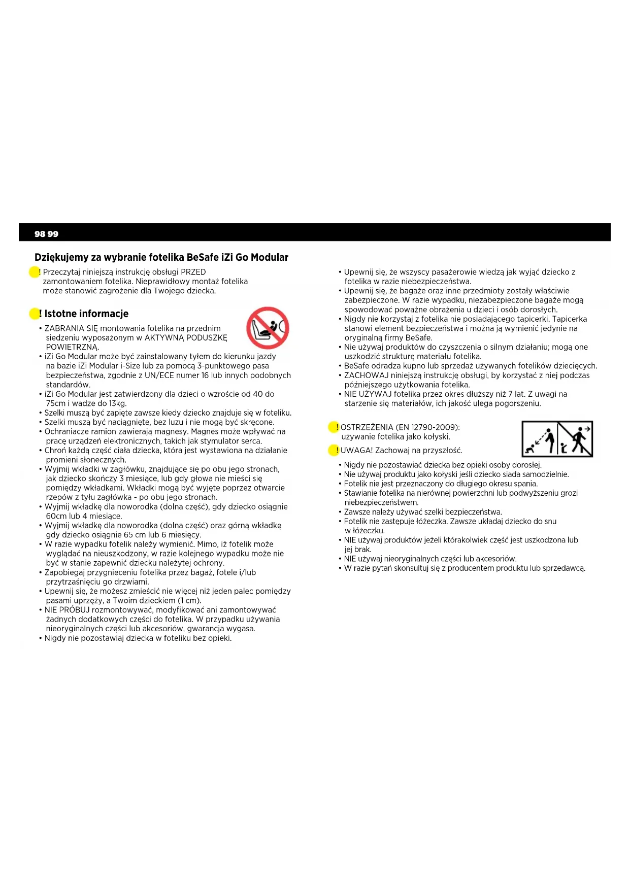 - Nigdy nie pozostawiaj dziecka w foteliku bez opieki. Dziękujemy za wybranie fotelika BeSafe iZi Go Modular ! Przeczytaj niniejszą instrukcję obsługi PRZED zamontowaniem fotelika. Nieprawidłowy montaż fotelika może stanowić zagrożenie dla Twojego dziecka.