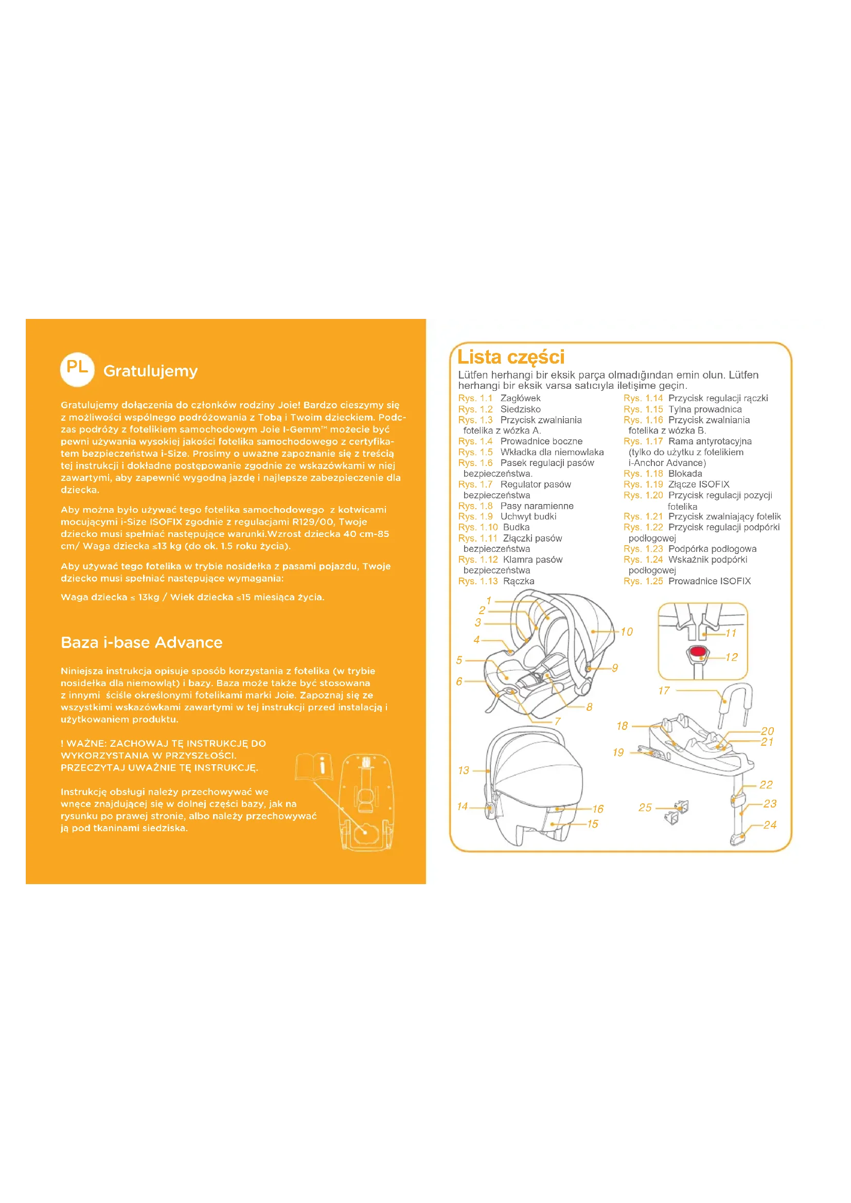 Lista części Lütfen herhangi bir eksik parça olmadığından emin olun. Lütfen herhangi bir eksik varsa satıcıyla iletişime geçin. Rys. 1.1 ZagłówekRys. 1.2 SiedziskoRys. 1.3 Przycisk zwalniania fotelika z wózka A.Rys. 1.4 Prowadnice boczneRys. 1.5 Wkładka dla niemowlakaRys. 1.6 Pasek regulacji pasów bezpieczeństwa.Rys. 1.7 Regulator pasów bezpieczeństwaRys. 1.8 Pasy naramienneRys. 1.9 Uchwyt budkiRys. 1.10 BudkaRys. 1.11 Złączki pasów bezpieczeństwaRys. 1.12 Klamra pasów bezpieczeństwaRys. 1.13 RączkaRys. 1.14 Przycisk regulacji rączkiRys. 1.15 Tylna prowadnicaRys. 1.16 Przycisk zwalniania fotelika z wózka B.Rys. 1.17 Rama antyrotacyjna (tylko do użytku z fotelikiem i-Anchor Advance)Rys. 1.18 BlokadaRys. 1.19 Złącze ISOFIXRys. 1.20 Przycisk regulacji pozycji fotelikaRys. 1.21 Przycisk zwalniający fotelikRys. 1.22 Przycisk regulacji podpórki podłogowejRys. 1.23 Podpórka podłogowaRys. 1.24 Wskaźnik podpórki podłogowejRys. 1.25 Prowadnice ISOFIX111 112 OSTRZEŻENIA