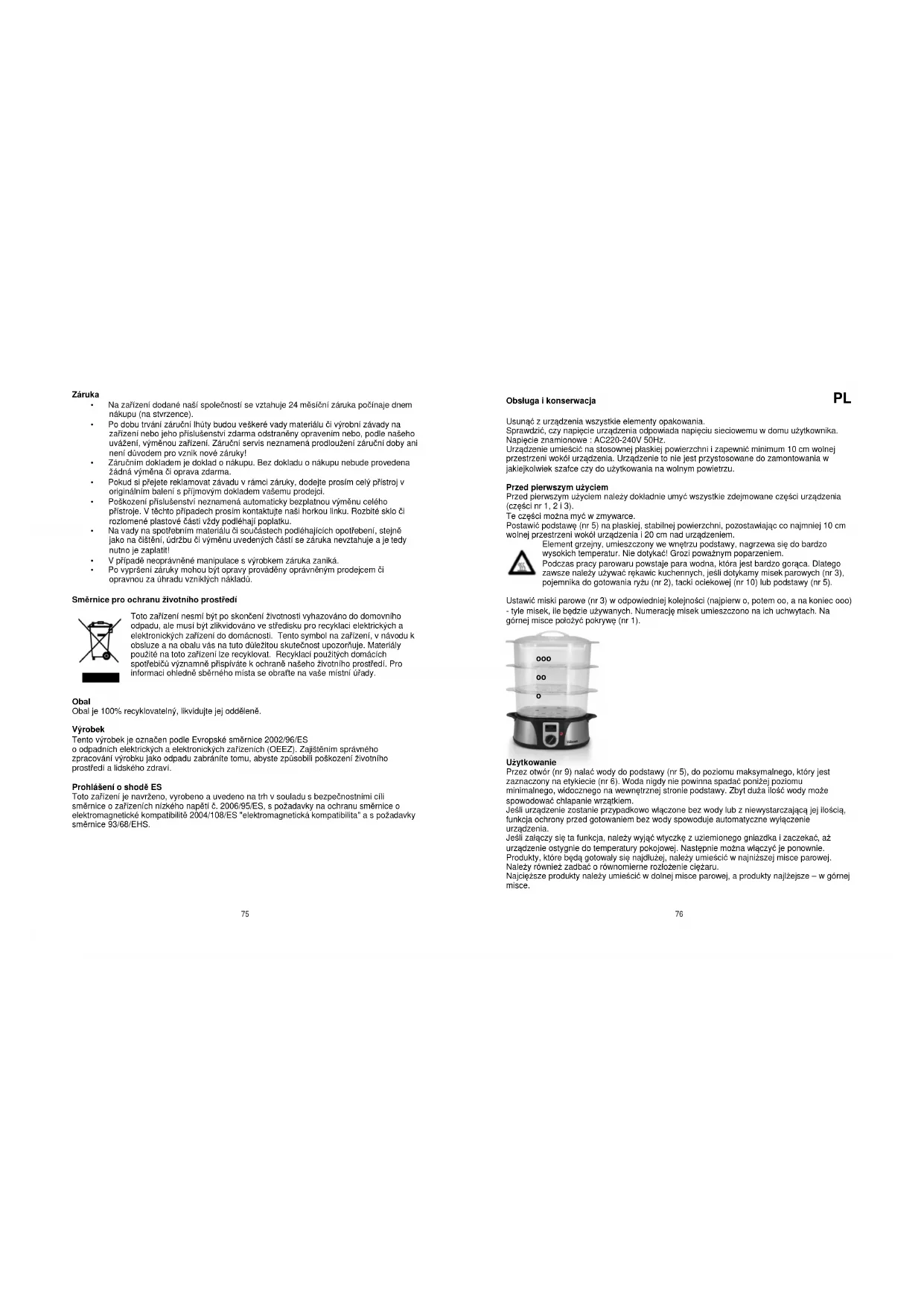 Wskazany powyżej czas gotowania można modyfikować odpowiednio do swoich potrzeb. Czyszczenie urządzenia Wyjąć wtyczkę z gniazdka i pozostawić do ostygnięcia. Umyć miski parowe (nr 3), pojemnik do gotowania ryżu (nr 2), pokrywę (nr 1) oraz tackę ociekową (nr 10) w ciepłej wodzie z detergentem. Te części można również myć w zmywarce. Nie należy zanurzać podstawy w wodzie ani w żadnym innym płynie. Podstawy (nr 5) nie należy myć w zmywarce – czyścić zwilżoną szmatką. Nie stosować ostrych i ścierających środków czyszczących ani szorowaków – grozi uszkodzeniem urządzenia. Urządzenie należy regularnie odkamieniać. Do zbiornika w podstawie wlać około 0,7 litra octu i ustawić na niej pierwszą miskę parową z pokrywą. Włączyć urządzenie i pozostawić je na około 20 minut. Następnie dokładnie wypłukać części, do zbiornika wlać wodę, włączyć urządzenie i pozostawić na około 10 minut. Dokładnie wypłukać zdejmowane części oraz podstawę czystą wodą, a następnie wysuszyć.79 WAŻNE UWAGI DOTYCZĄCE BEZPIECZEŃSTWA