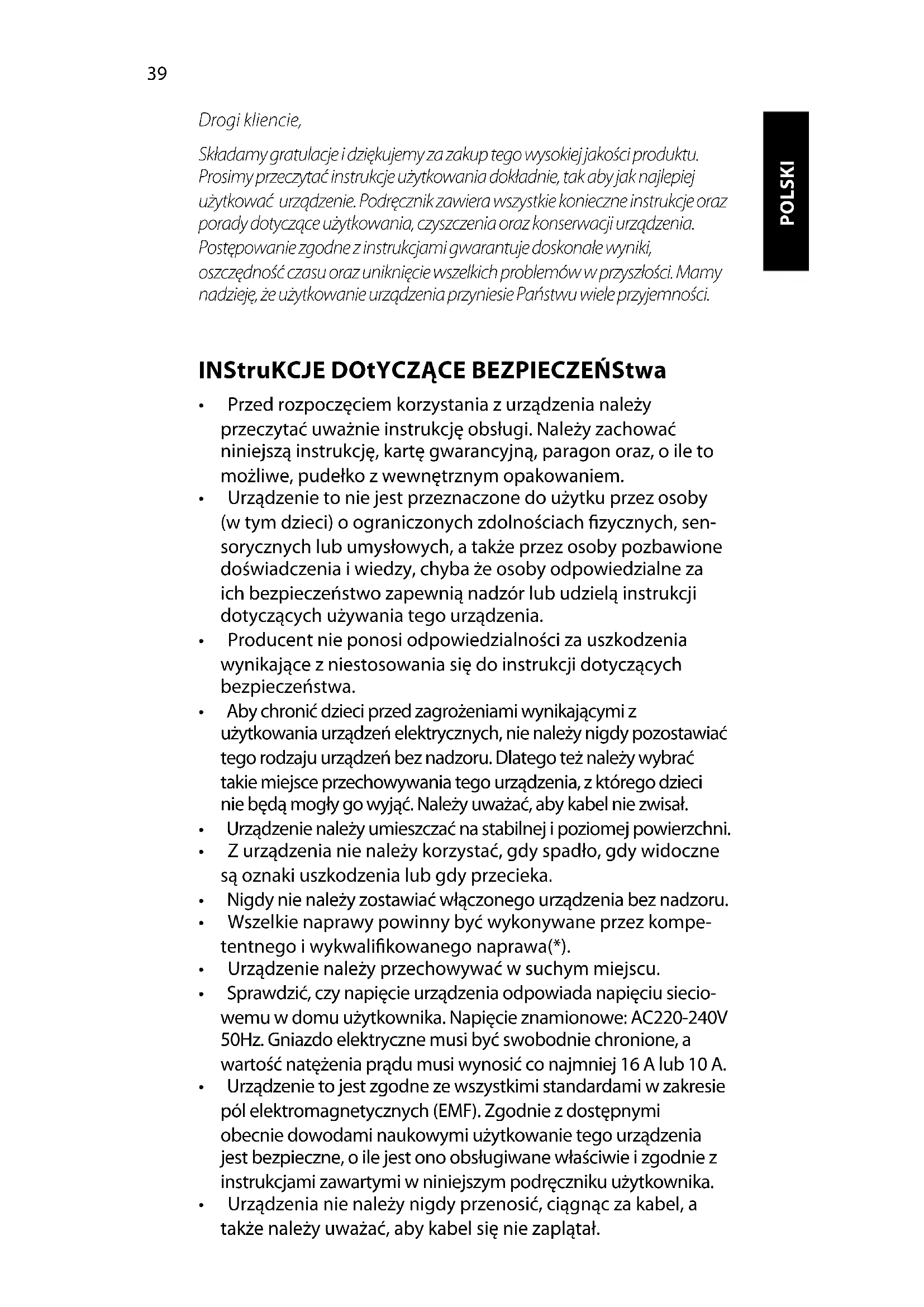 - Przed rozpoczęciem korzystania z urządzenia należy przeczytać uważnie instrukcję obsługi. Należy zachować niniejszą instrukcję, kartę gwarancyjną, paragon oraz, o ile to możliwe, pudełko z wewnętrznym opakowaniem.