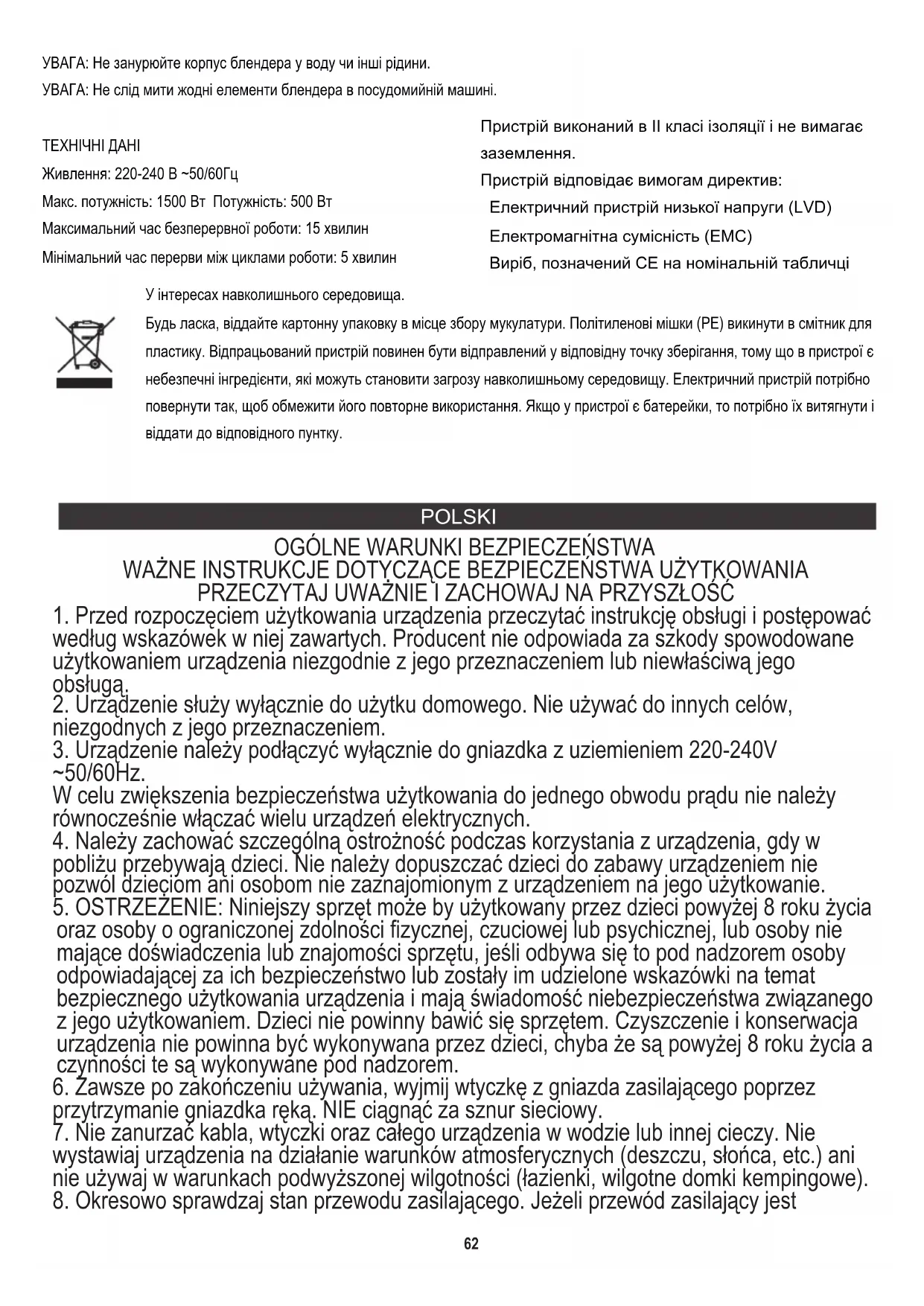 Upewnij się, że blender jest odłączony od prądu. 1.Kubki, pokrywki i noże myć w wodzie z dodatkiem płynu do mycia naczyń. W celu dokładnego umycia kubka można do niego wlać wodę z dodatkiem płynu do mycia naczyń, podłączyć blender do prądu i uruchomić go na krótką chwilę w trybie “pulse”. Następnie wylej z niego wodę, dokładnie wypłucz i osusz. 2.Zabrudzony korpus (1D) przetrzyj wilgotną szmatką, następnie wytrzyj do sucha. UWAGA: Nie zanurzaj korpusu blendera w wodzie ani innych cieczach. UWAGA: Nie należy myć żadnych części blendera w zmywarce. DANE TECHNICZNE Zasilanie: 220-240V ~50/60Hz Moc maks.: 1500W Moc: 500W Maksymalny czas pracy ciągłej: 15 minut Minimalny czas przerwy pomiędzy cyklami pracy: 5 minut Urządzenie jest wykonane w II klasie izolacji i nie wymaga uziemienia. Urządzenie jest zgodne z wymaganiami dyrektyw: Urządzenie elektryczne niskonapięciowe (LVD) Kompatybilność elektromagnetyczna (EMC) Wyrób oznaczony CE na tabliczce znamionowej