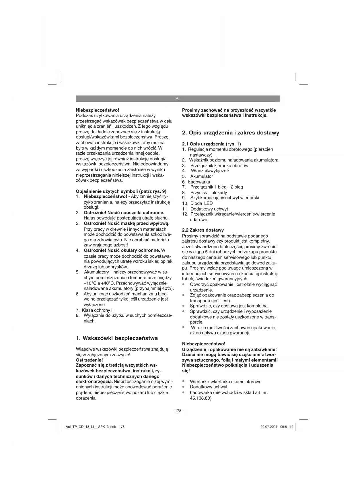 Urządzenie i wyposażenie dodatkowe przechowywać w miejscu ciemnym, suchym i wolnym od przemarzania, zabezpieczyć przed dziećmi. Optymalna temperatura przechowywani 5 do 30˚C. Przechowywać urządzenie w oryginal- nym opakowaniu. Anl_TP_CD_18_Li_i_SPK13.indb 182Anl_TP_CD_18_Li_i_SPK13.indb 182 20.07.2021 09:51:1320.07.2021 09:51:13PL