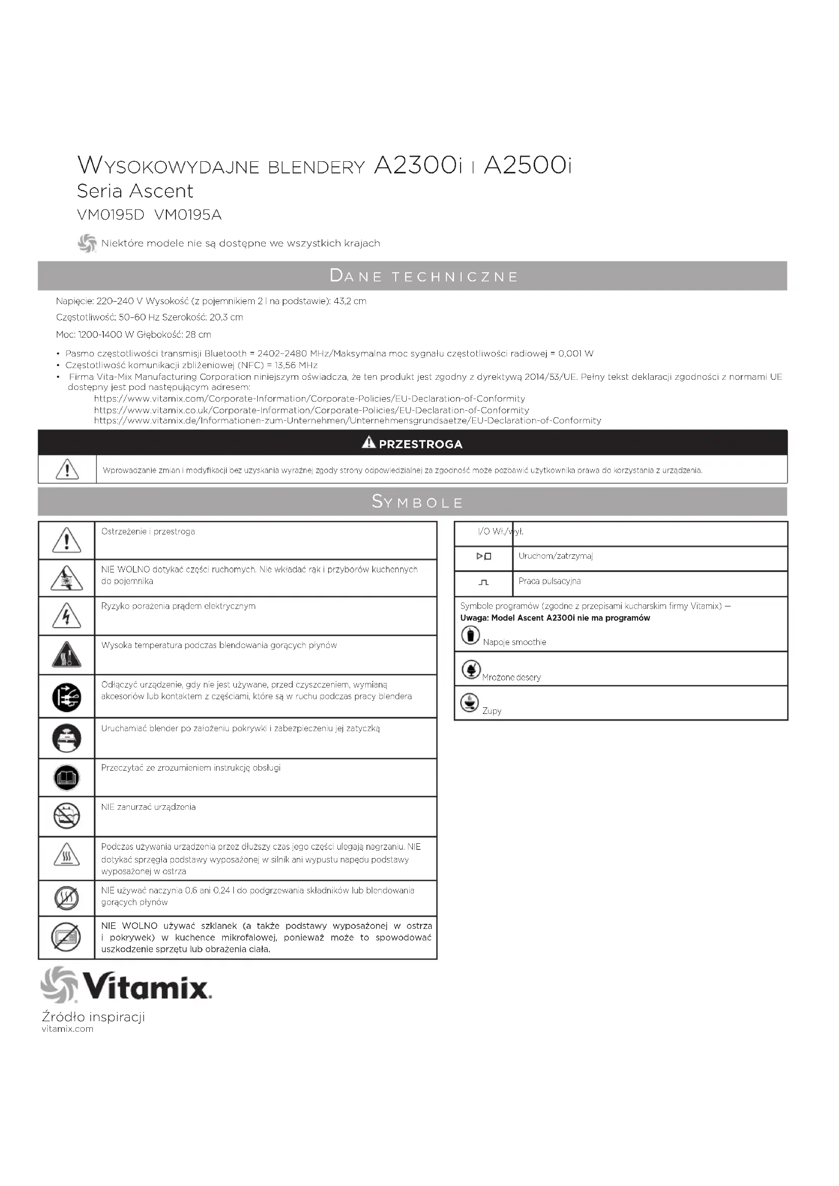 - Firma Vita-Mix Manufacturing Corporation niniejszym oświadcza, że ten produkt jest zgodny z dyrektywą 2014/53/UE. Pełny tekst deklaracji zgodności z normami UE dostępny jest pod następującym adresem: https://www.vitamix.com/Corporate-Information/Corporate-Policies/EU-Declaration-of-Conformity https://www.vitamix.co.uk/Corporate-Information/Corporate-Policies/EU-Declaration-of-Conformity https://www.vitamix.de/Informationen-zum-Unternehmen/Unternehmensgrundsaetze/EU-Declaration-of-Conformity I/O Wł./wył. Uruchom/zatrzymajPraca pulsacyjnaSymbole programów (zgodne z przepisami kucharskim firmy Vitamix) — Uwaga: Model Ascent A2300i nie ma programów Napoje smoothie Mrożone desery Zupy VM0195D VM0195A Niektóre modele nie są dostępne we wszystkich krajach Źródło inspiracji vitamix.com PRZESTROGA Wprowadzanie zmian i modyfikacji bez uzyskania wyraźnej zgody strony odpowiedzialnej za zgodność może pozbawić użytkownika prawa do korzystania z urządzenia.122 Ważne inStrukcje dot yc z ące bezpiecznego korzyStania z urządzenia OSTRZEŻENIE: Aby zapobiec odniesieniu poważnych obrażeń, podczas korzystania z blendera Vitamix® należy przestrzegać podstawowych środków ostrożności, w tym tych przedstawionych poniżej. PRZED URUCHOMIENIEM BLENDERA NALEŻY PRZECZYTAĆ WSZYSTKIE INSTRUKCJE, ZASADY BEZPIECZNEGO UŻYTKOWANIA I OSTRZEŻENIA. WAŻNE INSTRUKCJE DOTYCZĄCE BEZPIECZNEGO KORZYSTANIA ZURZĄDZENIA Niniejszy produkt jest przeznaczony WYŁĄCZNIE DO UŻYTKU DOMOWEGO. Nie wolno używać go do zastosowań komercyjnych. Nie wolno pozostawiać blendera Vitamix bez nadzoru. Wszelkie naprawy, prace serwisowe i wymiany części mogą być realizowane tylko przez firmę Vitamix lub przedstawiciela autoryzowanego serwisu. UWAGA: NIEPRZESTRZEGANIE ISTOTNYCH ZASAD BEZPIECZEŃSTWA ORAZ INSTRUKCJI BEZPIECZNEGO UŻYTKOWANIA JEST PRZEJAWEM NIEPRAWIDŁOWEGO WYKORZYSTANIA BLENDERA VITAMIX I MOŻE SPOWODOWAĆ UTRATĘ GWARANCJI ORAZ RYZYKO POWSTANIA POWAŻNYCH OBRAŻEŃ.