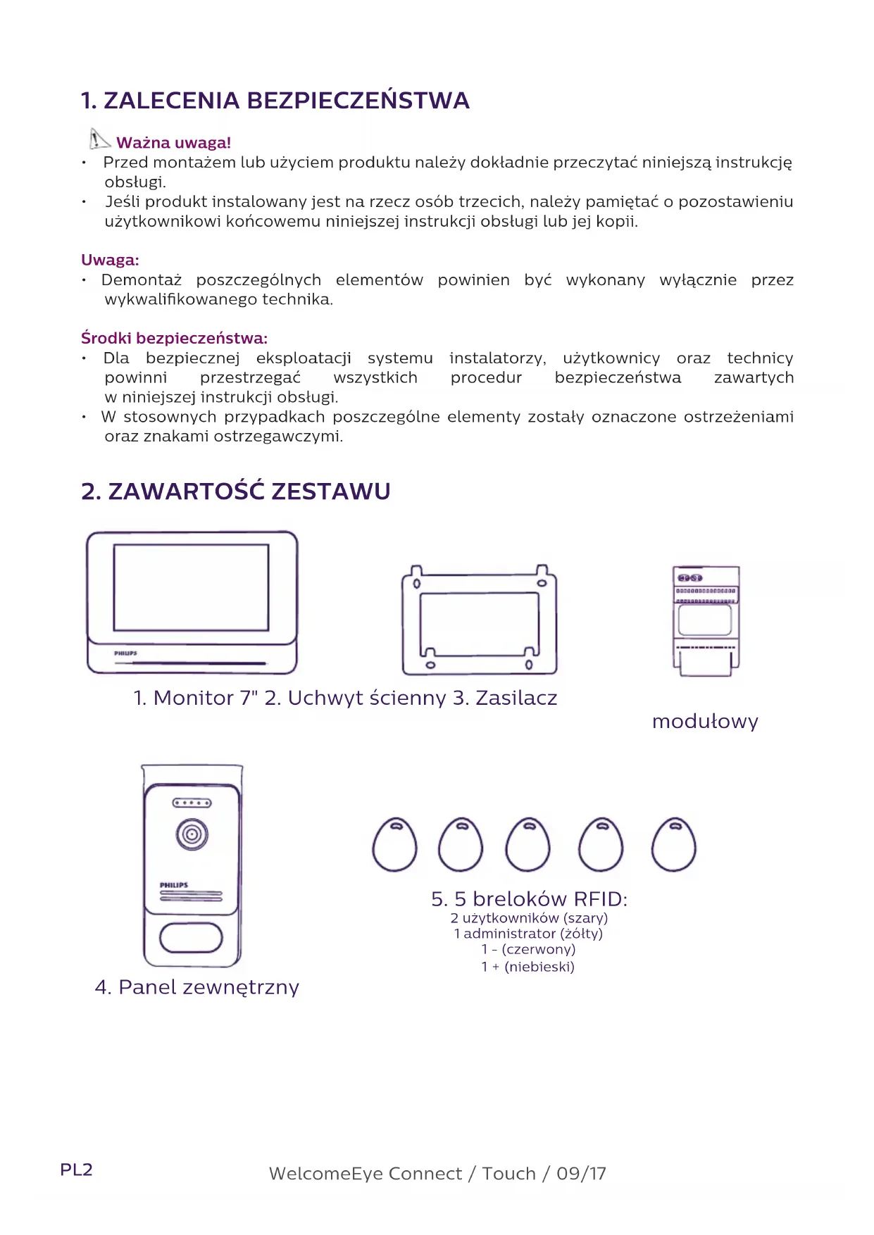 - Czyścić delikatną szmatką bez użycia rozpuszczalników. Gwarancja wygasa w przypadku samodzielnego demontażu części urządzenia. Przed czyszczeniem należy odłączyć urządzenie od zasilania.PL28 WelcomeEye Connect / Touch / 09/17 Uwaga: Nie używać karboksylowanych produktów ani benzyny czyszczącej, a także alkoholi czy produktów pochodnych. Opary tych substancji nie tylko mogą uszkodzić urządzenie, ale też są niebezpieczne dla zdrowia i mogą grozić wybuchem. Podczas prac konserwacyjnych nie korzystać z narzędzi przewodzących prąd elektryczny (metalowa szczotka, ostro zakończone narzędzie itp.). Paragon skalny lub faktura stanowią dowód zakupu. Numery kontaktowe oraz godziny otwarcia naszych centrów obsługi znajdują się na stronie www.philips.com. KARTA GWARANCYJNA Pan / Pani : Numer telefonu : Adres : E-mail : Data zakupu : / / (Dd / mm / rok) Sprzedawca : Telefon handlowiec : Adres dealera : Numer seryjny PHI/1031/ Ważny : Proszę zachować tę kartę gwarancyjną i dowód zakupu. Nazwa Philips oraz emblemat tarczy Philips są objętymi licencją znakami towarowymi rmy Koninklijke Philips N.V. Ten produkt został wytworzony i jest sprzedawany na odpowiedzialność rmy CFI Extel SAS, która jest jedynym gwarantem w odniesieniu do tego produktu.