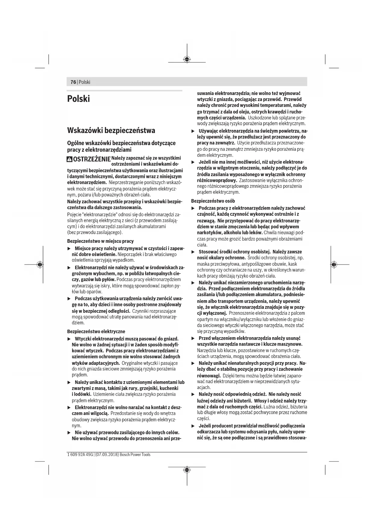 oranında bir kılavuz delik açmalısınız. Bakım ve servis Bakım ve temizlik u Elektrikli el aletinde bir çalışma yapmadan önce (örneğin bakım, uç değiştirme vb.), aleti taşırken ve saklarken her defasında aküyü elektrikli el aletinden çıkarın.Aletin açma/kapama şalterine yanlışlıkla basıldığında yaralanmalar ortaya çıkabilir. u İyi ve güvenli çalışabilmek için elektrikli el aletini ve havalandırma aralıklarını temiz tutun. Dikkatli biçimde yürütülen üretim ve test yöntemlerine rağmen elektrikli el aleti arıza yapacak olursa, onarım Bosch elektrikli el aletleri için yetkili bir serviste yapılmalıdır. Müşteri servisi ve uygulama danışmanlığı Müşteri servisleri ürününüzün onarım ve bakımı ile yedek parçalarına ait sorularınızı yanıtlandırır. Demonte görünüşleri ve yedek parçalara ait bilgileri şu sayfada da bulabilirsiniz: www.bosch-pt.com Bosch uygulama danışma ekibi ürünlerimiz ve aksesuarları hakkındaki sorularınızda sizlere memnuniyetle yardımcı olur. Bütün başvuru ve yedek parça siparişlerinizde ürünün tip etiketi üzerindeki 10 haneli ürün kodunu mutlaka belirtin. Sadece Türkiye için geçerlidir: Bosch genel olarak yedek parçaları 7 yıl hazır tutar. Türkçe Bosch Sanayi ve Ticaret A.Ş. Elektrikli El Aletleri Aydınevler Mah. İnönü Cad. No: 20 Küçükyalı Ofis Park A Blok 34854 Maltepe-İstanbul Tel.: 444 80 10 Fax: +90 216 432 00 82 E-mail: iletisim@bosch.com.tr www.bosch.com.tr Bulsan Elektrik İstanbul Cad. Devrez Sok. İstanbul Çarşısı No: 48/29 İskitler Ankara Tel.: +90 312 3415142 Tel.: +90 312 3410302 Fax: +90 312 3410203 E-mail: bulsanbobinaj@gmail.com Faz Makine Bobinaj Cumhuriyet Mah. Sanayi Sitesi Motor İşleri Bölümü 663 Sk. No:18 Antalya Tel.: +90 242 3465876Tel.: +90 242 3462885 Fax: +90 242 3341980 E-mail: info@fazmakina.com.tr Körfez Elektrik Karaağaç Mah. Sümerbank Cad. No:18/2 Erzincan Tel.: +90 446 2230959 Fax: +90 446 2240132 E-mail: bilgi@korfezelektrik.com.tr Değer İş Bobinaj İsmetpaşa Mah. İlk Belediye Başkan Cad. 5/C Şahinbey/Gaziantep Tel.: +90 342 2316432 Fax: +90 342 2305871 E-mail: degerisbobinaj@hotmail.com Tek Çözüm Bobinaj Küsget San.Sit.A Blok 11Nolu Cd.No:49/A Şehitkamil/Gaziantep Tel.: +90 342 2351507 Fax: +90 342 2351508 E-mail: cozumbobinaj2@hotmail.com Günşah Otomotiv Beylikdüzü Sanayi Sit. No: 210 Beylikdüzü İstanbul Tel.: +90 212 8720066 Fax: +90 212 8724111 E-mail: gunsahelektrik@ttmail.com Aygem 10021 Sok. No: 11 AOSB Çiğli İzmir Tel.: +90232 3768074 Fax: +90 232 3768075 E-mail: boschservis@aygem.com.tr Sezmen Bobinaj Ege İş Merkezi 1201/4 Sok. No: 4/B Yenişehir İzmir Tel.: +90 232 4571465 Tel.: +90 232 4584480 Fax: +90 232 4573719 E-mail: info@sezmenbobinaj.com.tr Ankaralı Elektrik Eski Sanayi Bölgesi 3. Cad. No: 43 Kocasinan Kayseri Tel.: +90 352 3364216 Tel.: +90 352 3206241 Fax: +90 352 3206242 E-mail: gunay@ankarali.com.tr Asal Bobinaj Eski Sanayi Sitesi Barbaros Cad. No: 24/C Samsun Tel.: +90 362 2289090 Fax: +90 362 2289090 E-mail: bpsasalbobinaj@hotmail.com Üstündağ Elektrikli Aletler Nusretiye Mah. Boyacılar Aralığı No: 9 Tekirdağ Tel.: +90 282 6512884 Fax: +90 282 6521966 E-mail: info@ustundagsogutma.com Marmara Elektrik Tersane cd. Zencefil Sok.No:6 Karaköy İstanbul Tel.: +90 212 2974320 Fax: +90 212 2507200 E-mail: info@marmarabps.com Bağrıaçıklar Oto Elektrik Motorlu Sanayi Çarşısı Doğruer Sk. No:9 Selçuklu Konya Tel.: +90 332 2354576 Tel.: +90 332 2331952 Fax: +90 332 2363492 E-mail: bagriaciklarotoelektrik@gmail.com Ermenistan, Azerbaycan, Gürcistan, Kırgızistan, Moğolistan, Tacikistan, Türkmenistan, Özbekistan TOO “Robert Bosch” Power Tools, Satış Sonrası Servis Rayimbek Cad., 169/1 050050, Almatı, Kazakistan Servis E-posta: service.pt.ka@bosch.com Resmi İnternet Sitesi: www.bosch.com, www.bosch-pt.com Nakliye Alet içindeki lityum iyon (Li-Ionen) aküler tehlikeli madde taşıma yönetmeliği hükümlerine tabidir. Aküler başka bir yükümlülük olmaksızın kullanıcı tarafından caddeler üzerinde taşınabilir. Üçüncü kişiler eliyle yollanma durumunda (örneğin hava yolu ile veya nakliye şirketleri ile) paketleme ve etiketlemeye ilişkin özel hükümlere uyulmalıdır. Gönderi paketlenirken bir tehlikeli madde uzmanından yardım alınmalıdır. Aküleri sadece ve ancak gövdelerinde hasar yoksa gönderin. Açık kontakları kapatın ve aküyü ambalaj içinde hareket etmeyecek biçimde paketleyin. Lütfen olası ek ulusal yönetmelik hükümlerine de uyun. Tasfiye Elektrikli el aletleri, aküler, aksesuar ve ambalaj malzemesi çevre dostu tasfiye amacıyla bir geri dönüşüm merkezine yollanmalıdır. Elektrikli el aletlerini ve aküleri/bataryaları evsel çöplerin içine atmayın! Sadece AB ülkeleri için: 2012/19/EU yönetmeliği uyarınca kullanım ömrünü tamamlamış elektrikli el aletleri ve 2006/66/EC yönetmeliği uyarınca arızalı veya kullanım ömrünü tamamlamış aküler/ bataryalar ayrı ayrı toplanmak ve çevre dostu tasfiye için bir geri dönüşüm merkezine yollanmak zorundadır. Aküler/bataryalar: Lityum iyon: Lütfen nakliye bölümündeki talimata uyun (Bakınız „Nakliye“, Sayfa75). Türkçe | 75 Bosch Power Tools 1 609 92A 49G | (07.09.2018)76 | Polski 1 609 92A 49G | (07.09.2018) Bosch Power Tools Polski Wskazówki bezpieczeństwa Ogólne wskazówki bezpieczeństwa dotyczące pracy z elektronarzędziami OSTRZEŻENIE Należy zapoznać się ze wszystkimi ostrzeżeniami i wskazówkami do- tyczącymi bezpieczeństwa użytkowania oraz ilustracjami i danymi technicznymi, dostarczonymi wraz z niniejszym elektronarzędziem. Nieprzestrzeganie poniższych wskazó- wek może stać się przyczyną porażenia prądem elektrycz- nym, pożaru i/lub poważnych obrażeń ciała. Należy zachować wszystkie przepisy i wskazówki bezpie- czeństwa dla dalszego zastosowania. Pojęcie "elektronarz