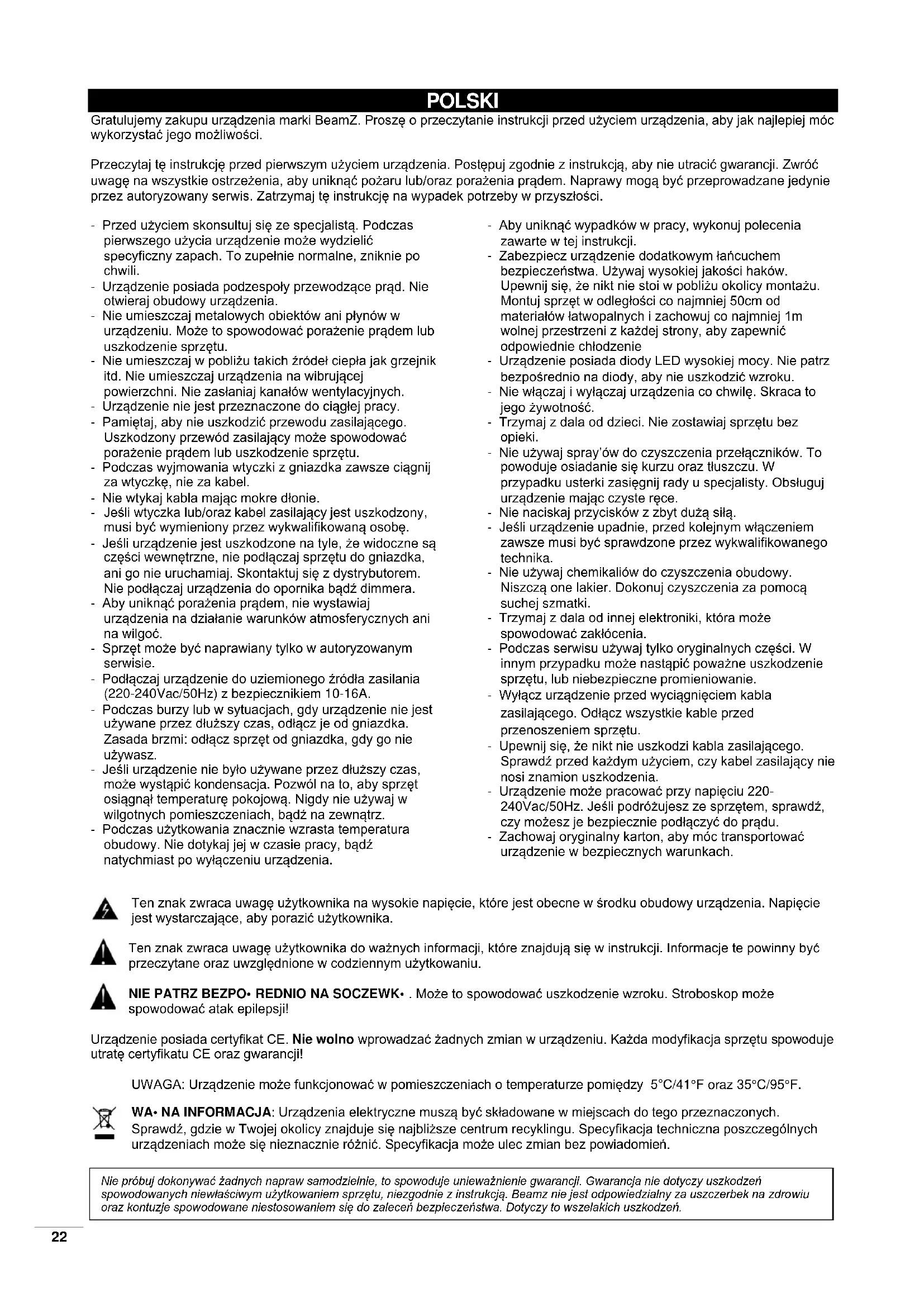 ATTENTION : Nous recommandons fortement que le nettoyage intérieur soit fait par un technicien qualifié.22 POLSKI Gratulujemy zakupu urządzenia marki BeamZ. Proszę o przeczytanie instrukcji przed użyciem urządzenia, aby jak najlepiej móc wykorzystać jego możliwości. Przeczytaj tę instrukcję przed pierwszym użyciem urządzenia. Postępuj zgodnie z instrukcją, aby nie utracić gwarancji. Zwróć uwagę na wszystkie ostrzeżenia, aby uniknąć pożaru lub/oraz porażenia prądem. Naprawy mogą być przeprowadzane jedynie przez autoryzowany serwis. Zatrzymaj tę instrukcję na wypadek potrzeby w przyszłości. - Przed użyciem skonsultuj się ze specjalistą. Podczas pierwszego użycia urządzenie może wydzielić specyficzny zapach. To zupełnie normalne, zniknie po chwili. - Urządzenie posiada podzespoły przewodzące prąd. Nie otwieraj obudowy urządzenia. - Nie umieszczaj metalowych obiektów ani płynów w urządzeniu. Może to spowodować porażenie prądem lub uszkodzenie sprzętu. - Nie umieszczaj w pobliżu takich źródeł ciepła jak grzejnik itd. Nie umieszczaj urządzenia na wibrującej powierzchni. Nie zasłaniaj kanałów wentylacyjnych. - Urządzenie nie jest przeznaczone do ciągłej pracy. - Pamiętaj, aby nie uszkodzić przewodu zasilającego. Uszkodzony przewód zasilający może spowodować porażenie prądem lub uszkodzenie sprzętu. - Podczas wyjmowania wtyczki z gniazdka zawsze ciągnij za wtyczkę, nie za kabel. - Nie wtykaj kabla mając mokre dłonie. - Jeśli wtyczka lub/oraz kabel zasilający jest uszkodzony, musi być wymieniony przez wykwalifikowaną osobę. - Jeśli urządzenie jest uszkodzone na tyle, że widoczne są części wewnętrzne, nie podłączaj sprzętu do gniazdka, ani go nie uruchamiaj. Skontaktuj się z dystrybutorem. Nie podłączaj urządzenia do opornika bądź dimmera. - Aby uniknąć porażenia prądem, nie wystawiaj urządzenia na działanie warunków atmosferycznych ani na wilgoć. - Sprzęt może być naprawiany tylko w autoryzowanym serwisie. - Podłączaj urządzenie do uziemionego źródła zasilania (220-240Vac/50Hz) z bezpiecznikiem 10-16A. - Podczas burzy lub w sytuacjach, gdy urządzenie nie jest używane przez dłuższy czas, odłącz je od gniazdka. Zasada brzmi: odłącz sprzęt od gniazdka, gdy go nie używasz. - Jeśli urządzenie nie było używane przez dłuższy czas, może wystąpić kondensacja. Pozwól na to, aby sprzęt osiągnął temperaturę pokojową. Nigdy nie używaj w wilgotnych pomieszczeniach, bądź na zewnątrz. - Podczas użytkowania znacznie wzrasta temperatura obudowy. Nie dotykaj jej w czasie pracy, bądź natychmiast po wyłączeniu urządzenia. - Aby uniknąć wypadków w pracy, wykonuj polecenia zawarte w tej instrukcji. - Zabezpiecz urządzenie dodatkowym łańcuchem bezpieczeństwa. Używaj wysokiej jakości haków. Upewnij się, że nikt nie stoi w pobliżu okolicy montażu. Montuj sprzęt w odległości co najmniej 50cm od materiałów łatwopalnych i zachowuj co najmniej 1m wolnej przestrzeni z każdej strony, aby zapewnić odpowiednie chłodzenie - Urządzenie posiada diody LED wysokiej mocy. Nie patrz bezpośrednio na diody, aby nie uszkodzić wzroku. - Nie włączaj i wyłączaj urządzenia co chwilę. Skraca to jego żywotność. - Trzymaj z dala od dzieci. Nie zostawiaj sprzętu bez opieki. - Nie używaj spray’ów do czyszczenia przełączników. To powoduje osiadanie się kurzu oraz tłuszczu. W przypadku usterki zasięgnij rady u specjalisty. Obsługuj urządzenie mając czyste ręce. - Nie naciskaj przycisków z zbyt dużą siłą. - Jeśli urządzenie upadnie, przed kolejnym włączeniem zawsze musi być sprawdzone przez wykwalifikowanego technika. - Nie używaj chemikaliów do czyszczenia obudowy. Niszczą one lakier. Dokonuj czyszczenia za pomocą suchej szmatki. - Trzymaj z dala od innej elektroniki, która może spowodować zakłócenia. - Podczas serwisu używaj tylko oryginalnych części. W innym przypadku może nastąpić poważne uszkodzenie sprzętu, lub niebezpieczne promieniowanie. - Wyłącz urządzenie przed wyciągnięciem kabla zasilającego. Odłącz wszystkie kable przed przenoszeniem sprzętu. - Upewnij się, że nikt nie uszkodzi kabla zasilającego. Sprawdź przed każdym użyciem, czy kabel zasilający nie nosi znamion uszkodzenia. - Urządzenie może pracować przy napięciu 220- 240Vac/50Hz. Jeśli podróżujesz ze sprzętem, sprawdź, czy możesz je bezpiecznie podłączyć do prądu. - Zachowaj oryginalny karton, aby móc transportować urządzenie w bezpiecznych warunkach. Ten znak zwraca uwagę użytkownika na wysokie napięcie, które jest obecne w środku obudowy urządzenia. Napięcie jest wystarczające, aby porazić użytkownika. Ten znak zwraca uwagę użytkownika do ważnych informacji, które znajdują się w instrukcji. Informacje te powinny być przeczytane oraz uwzględnione w codziennym użytkowaniu. NIE PATRZ BEZPO• REDNIO NA SOCZEWK• . Może to spowodować uszkodzenie wzroku. Stroboskop może spowodować atak epilepsji! Urządzenie posiada certyfikat CE. Nie wolno wprowadzać żadnych zmian w urządzeniu. Każda modyfikacja sprzętu spowoduje utratę certyfikatu CE oraz gwarancji! UWAGA: Urządzenie może funkcjonować w pomieszczeniach o temperaturze pomiędzy 5°C/41°F oraz 35°C/95°F. WA• NA INFORMACJA: Urządzenia elektryczne muszą być składowane w miejscach do tego przeznaczonych. Sprawdź, gdzie w Twojej okolicy znajduje się najbliższe centrum recyklingu. Specyfikacja techniczna poszczególnych urządzeniach może się nieznacznie różnić. Specyfikacja może ulec zmian bez powiadomień. Nie próbuj dokonywać żadnych napraw samodzielnie, to spowoduje unieważnienie gwarancji. Gwarancja nie dotyczy uszkodzeń spowodowanych niewłaściwym użytkowaniem sprzętu, niezgodnie z instrukcją. Beamz nie jest odpowiedzialny za uszczerbek na zdrowiu oraz kontuzje spowodowane niestosowaniem się do zaleceń bezpieczeń