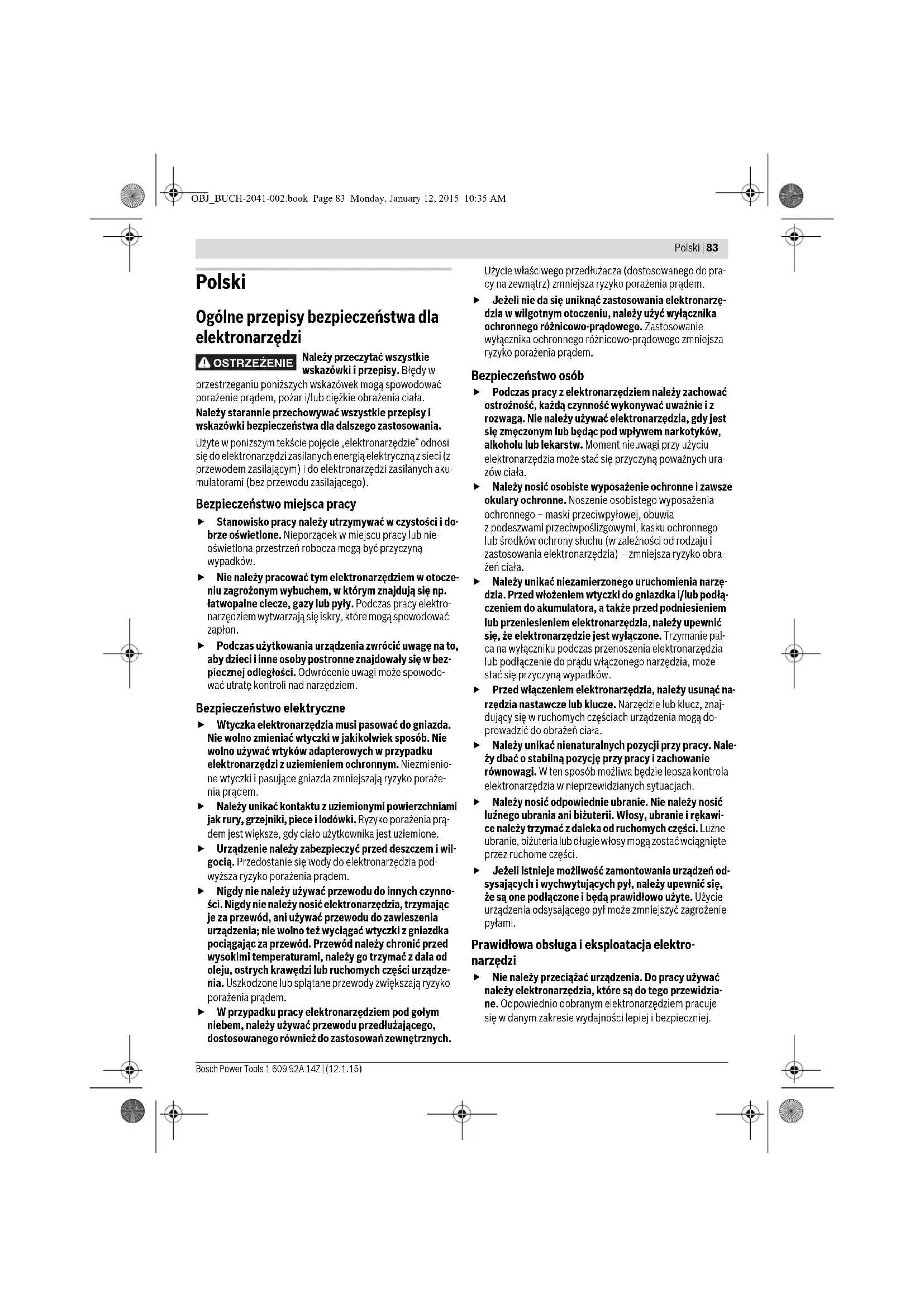 Denizli Tel.: 0258 2620666 Bulut Elektrik İstasyon Cad. No: 52/B Devlet Tiyatrosu Karşısı Elazığ Tel.: 0424 2183559 Körfez Elektrik Sanayi Çarşısı 770 Sok. No: 71 Erzincan Tel.: 0446 2230959 Ege Elektrik İnönü Bulvaro No: 135 Muğla Makasarası Fethiye Fethiye Tel.: 0252 6145701 Değer İş Bobinaj İsmetpaşa Mah. İlk Belediye Başkan Cad. 5/C Şahinbey Gaziantep Tel.: 0342 2316432 Çözüm Bobinaj İsmetpaşa Mah. Eski Şahinbey Belediyesi altı Cad. No: 3/C Gaziantep Tel.: 0342 2319500 Onarım Bobinaj Raifpaşa Cad. No: 67 İskenderun Hatay Tel.: 0326 6137546 Günşah Otomotiv Beylikdüzü Sanayi Sit. No: 210 Beylikdüzü İstanbul Tel.: 0212 8720066 Aygem 10021 Sok. No: 11 AOSB Çiğli İzmir Tel.: 0232 3768074 Sezmen Bobinaj Ege İş Merkezi 1201/4 Sok. No: 4/B Yenişehir İzmir Tel.: 0232 4571465 Ankaralı Elektrik Eski Sanayi Bölgesi 3. Cad. No: 43 Kayseri Tel.: 0352 3364216 Asal Bobinaj Eski Sanayi Sitesi Barbaros Cad. No: 24 Samsun Tel.: 0362 2289090 Üstündağ Elektrikli Aletler Nusretiye Mah. Boyacılar Aralığı No: 9 Tekirdağ Tel.: 0282 6512884 Nakliye Alet içindeki lityum iyon (Li-Ion) aküler tehlikeli madde taşıma yönetmeliği hükümlerine tabidir. Aküler başka bir yükümlülük olmaksızın kullanıcı tarafından caddeler üzerinde taşınabilir. Üçüncü kişiler eliyle yollanma durumunda (örneğin hava yolu ile veya nakliye şirketleri ile) paketleme ve etiketlemeye ilişkin özel hükümlere uyulmalıdır. Bu nedenle gönderi paketlenir- ken bir tehlikeli madde uzmanından yardım alınmalıdır. Aküleri sadece ve ancak gövdelerinde hasar yoksa gönderin. Açık kontakları kapatın ve aküyü ambalaj içinde hareket etme- yecek biçimde paketleyin. Lütfen olası ek ulusal yönetmelik hükümlerine de uyun. Tasfiye Elektrikli el aletleri, aküler, aksesuar ve ambalaj mal- zemesi çevre dostu yeniden kazanım merkezine gön- derilmek zorundadır. Elektrikli el aletlerini ve aküleri/bataryaları evsel çöplerin içine atmayın! Sadece AB üyesi ülkeler için: 2012/19/EU yönetmeliği uyarınca kullanım ömrünü tamamlamış elektrikli el aletleri ve 2006/66/EC yönetmeliği uyarınca arızalı ve- ya kullanım ömrünü tamamlamış aküler/ ba- taryalar ayrı ayrı toplanmak ve çevre dostu tasfiye için bir geri dönüşüm merkezine yol- lanmak zorundadır. Değişiklik haklarımız saklıdır. OBJ_BUCH-2041-002.book Page 82 Monday, January 12, 2015 10:35 AMPolski | 83 Bosch Power Tools 1 609 92A 14Z | (12.1.15) Polski Ogólne przepisy bezpieczeństwa dla elektronarzędzi Należy przeczytać wszystkie wskazówki i przepisy. Błędy w przestrzeganiu poniższych wskazówek mogą spowodować porażenie prądem, pożar i/lub ciężkie obrażenia ciała. Należy starannie przechowywać wszystkie przepisy i wskazówki bezpieczeństwa dla dalszego zastosowania. Użyte w poniższym tekście pojęcie „elektronarzędzie“ odnosi się do elektronarzędzi zasilanych energią elektryczną z sieci (z przewodem zasilającym) i do elektronarzędzi zasilanych aku- mulatorami (bez przewodu zasilającego). Bezpieczeństwo miejsca pracy Stanowisko pracy należy utrzymywać w czystości i do- brze oświetlone. Nieporządek w miejscu pracy lub nie- oświetlona przestrzeń robocza mogą być przyczyną wypadków. Nie należy pracować tym elektronarzędziem w otocze- niu zagrożonym wybuchem, w którym znajdują się np. łatwopalne ciecze, gazy lub pyły. Podczas pracy elektro- narzędziem wytwarzają się iskry, które mogą spowodować zapłon. Podczas użytkowania urządzenia zwrócić uwagę na to, aby dzieci i inne osoby postronne znajdowały się w bez- piecznej odległości. Odwrócenie uwagi może spowodo- wać utratę kontroli nad narzędziem. Bezpieczeństwo elektryczne Wtyczka elektronarzędzia musi pasować do gniazda. Nie wolno zmieniać wtyczki w jakikolwiek sposób. Nie wolno używać wtyków adapterowych w przypadku elektronarzędzi z uziemieniem ochronnym. Niezmienio- ne wtyczki i pasujące gniazda zmniejszają ryzyko poraże- nia prądem. Należy unikać kontaktu z uziemionymi powierzchniami jak rury, grzejniki, piece i lodówki. Ryzyko porażenia prą- dem jest większe, gdy ciało użytkownika jest uziemione. Urządzenie należy zabezpieczyć przed deszczem i wil- gocią. Przedostanie się wody do elektronarzędzia pod- wyższa ryzyko porażenia prądem. Nigdy nie należy używać przewodu do innych czynno- ści. Nigdy nie należy nosić elektronarzędzia, trzymając je za przewód, ani używać przewodu do zawieszenia urządzenia; nie wolno też wyciągać wtyczki z gniazdka pociągając za przewód. Przewód należy chronić przed wysokimi temperaturami, należy go trzymać z dala od oleju, ostrych krawędzi lub ruchomych części urządze- nia. Uszkodzone lub splątane przewody zwiększają ryzyko porażenia prądem. W przypadku pracy elektronarzędziem pod gołym niebem, należy używać przewodu przedłużającego, dostosowanego również do zastosowań zewnętrznych. Użycie właściwego przedłużacza (dostosowanego do pra- cy na zewnątrz) zmniejsza ryzyko porażenia prądem. Jeżeli nie da się uniknąć zastosowania elektronarzę- dzia w wilgotnym otoczeniu, należy użyć wyłącznika ochronnego różnicowo-prądowego. Zastosowanie wyłącznika ochronnego różnicowo-prądowego zmniejsza ryzyko porażenia prądem. Bezpieczeństwo osób Podczas pracy z elektronarzędziem należy zachować ostrożność, każdą czynność wykonywać uważnie i z rozwagą. Nie należy używać elektronarzędzia, gdy jest się zmęczonym lub będąc pod wpływem narkotyków, alkoholu lub lekarstw. Moment nieuwagi przy użyciu elektronarzędzia może stać się przyczyną poważnych ura- zów ciała. Należy nosić osobiste wyposażenie ochronne i zawsze okulary ochronne. Noszenie osobistego wyposażenia ochronnego – maski przeciwpyłowej, obuwia z podeszwami przeciwpoślizgowymi, kasku ochronnego lub środków ochrony słuchu (w zale