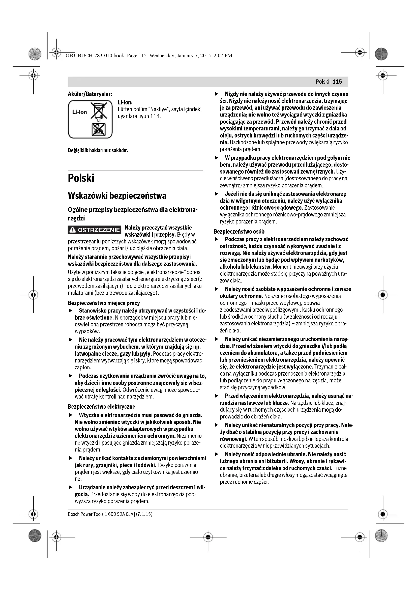 Denizli Tel.: 0258 2620666 Bulut Elektrik İstasyon Cad. No: 52/B Devlet Tiyatrosu Karşısı Elazığ Tel.: 0424 2183559 Körfez Elektrik Sanayi Çarşısı 770 Sok. No: 71 Erzincan Tel.: 0446 2230959 Ege Elektrik İnönü Bulvaro No: 135 Muğla Makasarası Fethiye Fethiye Tel.: 0252 6145701 Değer İş Bobinaj İsmetpaşa Mah. İlk Belediye Başkan Cad. 5/C Şahinbey Gaziantep Tel.: 0342 2316432 Çözüm Bobinaj İsmetpaşa Mah. Eski Şahinbey Belediyesi altı Cad. No: 3/C Gaziantep Tel.: 0342 2319500 Onarım Bobinaj Raifpaşa Cad. No: 67 İskenderun Hatay Tel.: 0326 6137546 Günşah Otomotiv Beylikdüzü Sanayi Sit. No: 210 Beylikdüzü İstanbul Tel.: 0212 8720066 Aygem 10021 Sok. No: 11 AOSB Çiğli İzmir Tel.: 0232 3768074 Sezmen Bobinaj Ege İş Merkezi 1201/4 Sok. No: 4/B Yenişehir İzmir Tel.: 0232 4571465 Ankaralı Elektrik Eski Sanayi Bölgesi 3. Cad. No: 43 Kayseri Tel.: 0352 3364216 Asal Bobinaj Eski Sanayi Sitesi Barbaros Cad. No: 24 Samsun Tel.: 0362 2289090 Üstündağ Elektrikli Aletler Nusretiye Mah. Boyacılar Aralığı No: 9 Tekirdağ Tel.: 0282 6512884 Nakliye Alet içindeki lityum iyon (Li-Ion) aküler tehlikeli madde taşıma yönetmeliği hükümlerine tabidir. Aküler başka bir yükümlülük olmaksızın kullanıcı tarafından caddeler üzerinde taşınabilir. Üçüncü kişiler eliyle yollanma durumunda (örneğin hava yolu ile veya nakliye şirketleri ile) paketleme ve etiketlemeye ilişkin özel hükümlere uyulmalıdır. Bu nedenle gönderi paketlenir- ken bir tehlikeli madde uzmanından yardım alınmalıdır. Aküleri sadece ve ancak gövdelerinde hasar yoksa gönderin. Açık kontakları kapatın ve aküyü ambalaj içinde hareket etme- yecek biçimde paketleyin. Lütfen olası ek ulusal yönetmelik hükümlerine de uyun. Tasfiye Elektrikli el aletleri, aküler, aksesuar ve ambalaj mal- zemesi çevre dostu yeniden kazanım merkezine gön- derilmek zorundadır. Elektrikli el aletlerini ve aküleri/bataryaları evsel çöplerin içine atmayın! Sadece AB üyesi ülkeler için: 2012/19/EU yönetmeliği uyarınca kullanım ömrünü tamamlamış elektrikli el aletleri ve 2006/66/EC yönetmeliği uyarınca arızalı veya kullanım ömrünü tamamlamış aküler/ bataryalar ayrı ayrı toplanmak ve çevre dos- tu tasfiye için bir geri dönüşüm merkezine gönderilmek zorundadır. OBJ_BUCH-283-010.book Page 114 Wednesday, January 7, 2015 2:07 PMPolski | 115 Bosch Power Tools 1 609 92A 0JA | (7.1.15) Aküler/Bataryalar: Li-Ion: Lütfen bölüm “Nakliye”, sayfa içindeki uyarılara uyun 114. Değişiklik haklarımız saklıdır. Polski Wskazówki bezpieczeństwa Ogólne przepisy bezpieczeństwa dla elektrona- rzędzi Należy przeczytać wszystkie wskazówki i przepisy. Błędy w przestrzeganiu poniższych wskazówek mogą spowodować porażenie prądem, pożar i/lub ciężkie obrażenia ciała. Należy starannie przechowywać wszystkie przepisy i wskazówki bezpieczeństwa dla dalszego zastosowania. Użyte w poniższym tekście pojęcie „elektronarzędzie“ odnosi się do elektronarzędzi zasilanych energią elektryczną z sieci (z przewodem zasilającym) i do elektronarzędzi zasilanych aku- mulatorami (bez przewodu zasilającego). Bezpieczeństwo miejsca pracy Stanowisko pracy należy utrzymywać w czystości i do- brze oświetlone. Nieporządek w miejscu pracy lub nie- oświetlona przestrzeń robocza mogą być przyczyną wypadków. Nie należy pracować tym elektronarzędziem w otocze- niu zagrożonym wybuchem, w którym znajdują się np. łatwopalne ciecze, gazy lub pyły. Podczas pracy elektro- narzędziem wytwarzają się iskry, które mogą spowodować zapłon. Podczas użytkowania urządzenia zwrócić uwagę na to, aby dzieci i inne osoby postronne znajdowały się w bez- piecznej odległości. Odwrócenie uwagi może spowodo- wać utratę kontroli nad narzędziem. Bezpieczeństwo elektryczne Wtyczka elektronarzędzia musi pasować do gniazda. Nie wolno zmieniać wtyczki w jakikolwiek sposób. Nie wolno używać wtyków adapterowych w przypadku elektronarzędzi z uziemieniem ochronnym. Niezmienio- ne wtyczki i pasujące gniazda zmniejszają ryzyko poraże- nia prądem. Należy unikać kontaktu z uziemionymi powierzchniami jak rury, grzejniki, piece i lodówki. Ryzyko porażenia prądem jest większe, gdy ciało użytkownika jest uziemio- ne. Urządzenie należy zabezpieczyć przed deszczem i wil- gocią. Przedostanie się wody do elektronarzędzia pod- wyższa ryzyko porażenia prądem. Nigdy nie należy używać przewodu do innych czynno- ści. Nigdy nie należy nosić elektronarzędzia, trzymając je za przewód, ani używać przewodu do zawieszenia urządzenia; nie wolno też wyciągać wtyczki z gniazdka pociągając za przewód. Przewód należy chronić przed wysokimi temperaturami, należy go trzymać z dala od oleju, ostrych krawędzi lub ruchomych części urządze- nia. Uszkodzone lub splątane przewody zwiększają ryzyko porażenia prądem. W przypadku pracy elektronarzędziem pod gołym nie- bem, należy używać przewodu przedłużającego, dosto- sowanego również do zastosowań zewnętrznych. Uży- cie właściwego przedłużacza (dostosowanego do pracy na zewnątrz) zmniejsza ryzyko porażenia prądem. Jeżeli nie da się uniknąć zastosowania elektronarzę- dzia w wilgotnym otoczeniu, należy użyć wyłącznika ochronnego różnicowo-prądowego. Zastosowanie wyłącznika ochronnego różnicowo-prądowego zmniejsza ryzyko porażenia prądem. Bezpieczeństwo osób Podczas pracy z elektronarzędziem należy zachować ostrożność, każdą czynność wykonywać uważnie i z rozwagą. Nie należy używać elektronarzędzia, gdy jest się zmęczonym lub będąc pod wpływem narkotyków, alkoholu lub lekarstw. Moment nieuwagi przy użyciu elektronarzędzia może stać się przyczyną poważnych ura- zów ciała. Należy nosić osobiste wyposażenie ochronne i zawsze okulary ochronne. Noszenie osobistego wyposażenia ochron