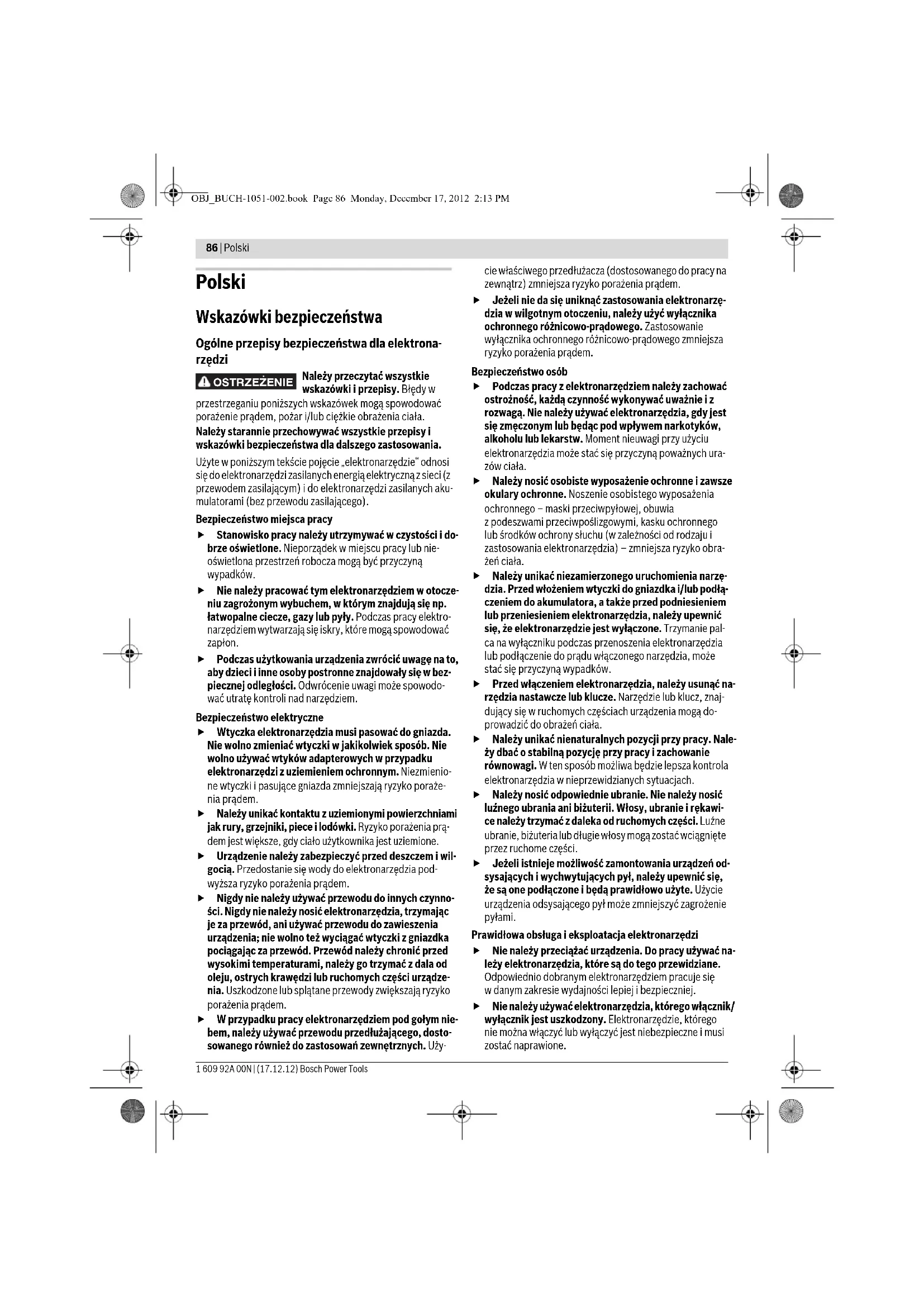 Denizli Tel.: 0258 2620666 Bulut Elektrik İstasyon Cad. No: 52/B Devlet Tiyatrosu Karşısı Elazığ Tel.: 0424 2183559 Körfez Elektrik Sanayi Çarşısı 770 Sok. No: 71 Erzincan Tel.: 0446 2230959 Ege Elektrik İnönü Bulvaro No: 135 Muğla Makasarası Fethiye Fethiye Tel.: 0252 6145701 Değer İş Bobinaj İsmetpaşa Mah. İlk Belediye Başkan Cad. 5/C Şahinbey Gaziantep Tel.: 0342 2316432 Çözüm Bobinaj İsmetpaşa Mah. Eski Şahinbey Belediyesi altı Cad. No: 3/C Gaziantep Tel.: 0342 2319500 Onarım Bobinaj Raifpaşa Cad. No: 67 İskenderun Hatay Tel.: 0326 6137546 Günşah Otomotiv Beylikdüzü Sanayi Sit. No: 210 Beylikdüzü İstanbul Tel.: 0212 8720066 Aygem 10021 Sok. No: 11 AOSB Çiğli İzmir Tel.: 0232 3768074 Sezmen Bobinaj Ege İş Merkezi 1201/4 Sok. No: 4/B Yenişehir İzmir Tel.: 0232 4571465 Ankaralı Elektrik Eski Sanayi Bölgesi 3. Cad. No: 43 Kayseri Tel.: 0352 3364216 Asal Bobinaj Eski Sanayi Sitesi Barbaros Cad. No: 24 Samsun Tel.: 0362 2289090 Üstündağ Elektrikli Aletler Nusretiye Mah. Boyacılar Aralığı No: 9 Tekirdağ Tel.: 0282 6512884 Nakliye Alet içindeki lityum iyon (Li-Ionen) aküler tehlikeli madde taşı- ma yönetmeliği hükümlerine tabidir. Aküler başka bir yüküm- lülük olmaksızın kullanıcı tarafından caddeler üzerinde taşına- bilir. Üçüncü kişiler eliyle yollanma durumunda (örneğin hava yolu ile veya nakliye şirketleri ile) paketleme ve etiketlemeye ilişkin özel hükümlere uyulmalıdır. Bu nedenle gönderi paketlenir- ken bir tehlikeli madde uzmanından yardım alınmalıdır. Aküleri sadece ve ancak gövdelerinde hasar yoksa gönderin. Açık kontakları kapatın ve aküyü ambalaj içinde hareket etme- yecek biçimde paketleyin. Lütfen olası ek ulusal yönetmelik hükümlerine de uyun. Tasfiye Elektrikli el aletleri, aküler, aksesuar ve ambalaj mal- zemesi çevre dostu yeniden kazanım merkezine gön- derilmek zorundadır. Elektrikli el aletlerini ve aküleri/bataryaları evsel çöplerin içine atmayın! Sadece AB üyesi ülkeler için: 2002/96/AT yönetmeliği uyarınca kullanım ömrünü tamamlamış elektrikli el aletleri ve 2006/66/AT yönetmeliği uyarınca arızalı veya kullanım ömrünü tamamlamış aküler/ bataryalar ayrı ayrı toplanmak ve çevre dos- tu tasfiye için bir geri dönüşüm merkezine yollanmak zorundadır. Aküler/Bataryalar: Li-Ion: Lütfen bölüm “Nakliye”, sayfa içindeki uyarılara uyun 85. Değişiklik haklarımız saklıdır. OBJ_BUCH-1051-002.book Page 85 Monday, December 17, 2012 2:13 PM86 | Polski 1 609 92A 00N | (17.12.12) Bosch Power Tools Polski Wskazówki bezpieczeństwa Ogólne przepisy bezpieczeństwa dla elektrona- rzędzi Należy przeczytać wszystkie wskazówki i przepisy. Błędy w przestrzeganiu poniższych wskazówek mogą spowodować porażenie prądem, pożar i/lub ciężkie obrażenia ciała. Należy starannie przechowywać wszystkie przepisy i wskazówki bezpieczeństwa dla dalszego zastosowania. Użyte w poniższym tekście pojęcie „elektronarzędzie“ odnosi się do elektronarzędzi zasilanych energią elektryczną z sieci (z przewodem zasilającym) i do elektronarzędzi zasilanych aku- mulatorami (bez przewodu zasilającego). Bezpieczeństwo miejsca pracy Stanowisko pracy należy utrzymywać w czystości i do- brze oświetlone. Nieporządek w miejscu pracy lub nie- oświetlona przestrzeń robocza mogą być przyczyną wypadków. Nie należy pracować tym elektronarzędziem w otocze- niu zagrożonym wybuchem, w którym znajdują się np. łatwopalne ciecze, gazy lub pyły. Podczas pracy elektro- narzędziem wytwarzają się iskry, które mogą spowodować zapłon. Podczas użytkowania urządzenia zwrócić uwagę na to, aby dzieci i inne osoby postronne znajdowały się w bez- piecznej odległości. Odwrócenie uwagi może spowodo- wać utratę kontroli nad narzędziem. Bezpieczeństwo elektryczne Wtyczka elektronarzędzia musi pasować do gniazda. Nie wolno zmieniać wtyczki w jakikolwiek sposób. Nie wolno używać wtyków adapterowych w przypadku elektronarzędzi z uziemieniem ochronnym. Niezmienio- ne wtyczki i pasujące gniazda zmniejszają ryzyko poraże- nia prądem. Należy unikać kontaktu z uziemionymi powierzchniami jak rury, grzejniki, piece i lodówki. Ryzyko porażenia prą- dem jest większe, gdy ciało użytkownika jest uziemione. Urządzenie należy zabezpieczyć przed deszczem i wil- gocią. Przedostanie się wody do elektronarzędzia pod- wyższa ryzyko porażenia prądem. Nigdy nie należy używać przewodu do innych czynno- ści. Nigdy nie należy nosić elektronarzędzia, trzymając je za przewód, ani używać przewodu do zawieszenia urządzenia; nie wolno też wyciągać wtyczki z gniazdka pociągając za przewód. Przewód należy chronić przed wysokimi temperaturami, należy go trzymać z dala od oleju, ostrych krawędzi lub ruchomych części urządze- nia. Uszkodzone lub splątane przewody zwiększają ryzyko porażenia prądem. W przypadku pracy elektronarzędziem pod gołym nie- bem, należy używać przewodu przedłużającego, dosto- sowanego również do zastosowań zewnętrznych. Uży- cie właściwego przedłużacza (dostosowanego do pracy na zewnątrz) zmniejsza ryzyko porażenia prądem. Jeżeli nie da się uniknąć zastosowania elektronarzę- dzia w wilgotnym otoczeniu, należy użyć wyłącznika ochronnego różnicowo-prądowego. Zastosowanie wyłącznika ochronnego różnicowo-prądowego zmniejsza ryzyko porażenia prądem. Bezpieczeństwo osób Podczas pracy z elektronarzędziem należy zachować ostrożność, każdą czynność wykonywać uważnie i z rozwagą. Nie należy używać elektronarzędzia, gdy jest się zmęczonym lub będąc pod wpływem narkotyków, alkoholu lub lekarstw. Moment nieuwagi przy użyciu elektronarzędzia może stać się przyczyną poważnych ura- zów ciała. Należy nosić osobiste wyposażenie ochronne i zawsze okulary ochronne. Noszenie osobistego wyposażenia oc