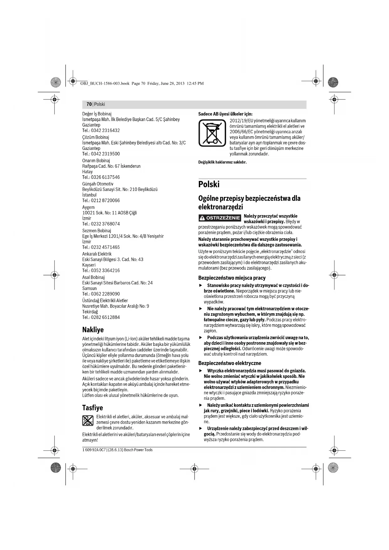 Denizli Tel.: 0258 2620666 Bulut Elektrik İstasyon Cad. No: 52/B Devlet Tiyatrosu Karşısı Elazığ Tel.: 0424 2183559 Körfez Elektrik Sanayi Çarşısı 770 Sok. No: 71 Erzincan Tel.: 0446 2230959 Ege Elektrik İnönü Bulvaro No: 135 Muğla Makasarası Fethiye Fethiye Tel.: 0252 6145701 Delme konumunun seçilmesi 6 158 Mekanik vites seçimi 7 158 Açma/kapama 8 158 Aksesuar seçimi – 159 İşlemin amacı Şekil Dikkat edin Sayfa OBJ_BUCH-1586-003.book Page 69 Friday, June 28, 2013 12:45 PM70 | Polski 1 609 92A 0C7 | (28.6.13) Bosch Power Tools Değer İş Bobinaj İsmetpaşa Mah. İlk Belediye Başkan Cad. 5/C Şahinbey Gaziantep Tel.: 0342 2316432 Çözüm Bobinaj İsmetpaşa Mah. Eski Şahinbey Belediyesi altı Cad. No: 3/C Gaziantep Tel.: 0342 2319500 Onarım Bobinaj Raifpaşa Cad. No: 67 İskenderun Hatay Tel.: 0326 6137546 Günşah Otomotiv Beylikdüzü Sanayi Sit. No: 210 Beylikdüzü İstanbul Tel.: 0212 8720066 Aygem 10021 Sok. No: 11 AOSB Çiğli İzmir Tel.: 0232 3768074 Sezmen Bobinaj Ege İş Merkezi 1201/4 Sok. No: 4/B Yenişehir İzmir Tel.: 0232 4571465 Ankaralı Elektrik Eski Sanayi Bölgesi 3. Cad. No: 43 Kayseri Tel.: 0352 3364216 Asal Bobinaj Eski Sanayi Sitesi Barbaros Cad. No: 24 Samsun Tel.: 0362 2289090 Üstündağ Elektrikli Aletler Nusretiye Mah. Boyacılar Aralığı No: 9 Tekirdağ Tel.: 0282 6512884 Nakliye Alet içindeki lityum iyon (Li-Ion) aküler tehlikeli madde taşıma yönetmeliği hükümlerine tabidir. Aküler başka bir yükümlülük olmaksızın kullanıcı tarafından caddeler üzerinde taşınabilir. Üçüncü kişiler eliyle yollanma durumunda (örneğin hava yolu ile veya nakliye şirketleri ile) paketleme ve etiketlemeye ilişkin özel hükümlere uyulmalıdır. Bu nedenle gönderi paketlenir- ken bir tehlikeli madde uzmanından yardım alınmalıdır. Aküleri sadece ve ancak gövdelerinde hasar yoksa gönderin. Açık kontakları kapatın ve aküyü ambalaj içinde hareket etme- yecek biçimde paketleyin. Lütfen olası ek ulusal yönetmelik hükümlerine de uyun. Tasfiye Elektrikli el aletleri, aküler, aksesuar ve ambalaj mal- zemesi çevre dostu yeniden kazanım merkezine gön- derilmek zorundadır. Elektrikli el aletlerini ve aküleri/bataryaları evsel çöplerin içine atmayın! Sadece AB üyesi ülkeler için: 2012/19/EU yönetmeliği uyarınca kullanım ömrünü tamamlamış elektrikli el aletleri ve 2006/66/EC yönetmeliği uyarınca arızalı veya kullanım ömrünü tamamlamış aküler/ bataryalar ayrı ayrı toplanmak ve çevre dos- tu tasfiye için bir geri dönüşüm merkezine yollanmak zorundadır. Değişiklik haklarımız saklıdır. Polski Ogólne przepisy bezpieczeństwa dla elektronarzędzi Należy przeczytać wszystkie wskazówki i przepisy. Błędy w przestrzeganiu poniższych wskazówek mogą spowodować porażenie prądem, pożar i/lub ciężkie obrażenia ciała. Należy starannie przechowywać wszystkie przepisy i wskazówki bezpieczeństwa dla dalszego zastosowania. Użyte w poniższym tekście pojęcie „elektronarzędzie“ odnosi się do elektronarzędzi zasilanych energią elektryczną z sieci (z przewodem zasilającym) i do elektronarzędzi zasilanych aku- mulatorami (bez przewodu zasilającego). Bezpieczeństwo miejsca pracy Stanowisko pracy należy utrzymywać w czystości i do- brze oświetlone. Nieporządek w miejscu pracy lub nie- oświetlona przestrzeń robocza mogą być przyczyną wypadków. Nie należy pracować tym elektronarzędziem w otocze- niu zagrożonym wybuchem, w którym znajdują się np. łatwopalne ciecze, gazy lub pyły. Podczas pracy elektro- narzędziem wytwarzają się iskry, które mogą spowodować zapłon. Podczas użytkowania urządzenia zwrócić uwagę na to, aby dzieci i inne osoby postronne znajdowały się w bez- piecznej odległości. Odwrócenie uwagi może spowodo- wać utratę kontroli nad narzędziem. Bezpieczeństwo elektryczne Wtyczka elektronarzędzia musi pasować do gniazda. Nie wolno zmieniać wtyczki w jakikolwiek sposób. Nie wolno używać wtyków adapterowych w przypadku elektronarzędzi z uziemieniem ochronnym. Niezmienio- ne wtyczki i pasujące gniazda zmniejszają ryzyko poraże- nia prądem. Należy unikać kontaktu z uziemionymi powierzchniami jak rury, grzejniki, piece i lodówki. Ryzyko porażenia prądem jest większe, gdy ciało użytkownika jest uziemio- ne. Urządzenie należy zabezpieczyć przed deszczem i wil- gocią. Przedostanie się wody do elektronarzędzia pod- wyższa ryzyko porażenia prądem. OSTRZEZENIE OBJ_BUCH-1586-003.book Page 70 Friday, June 28, 2013 12:45 PMPolski | 71 Bosch Power Tools 1 609 92A 0C7 | (28.6.13) Nigdy nie należy używać przewodu do innych czynno- ści. Nigdy nie należy nosić elektronarzędzia, trzymając je za przewód, ani używać przewodu do zawieszenia urządzenia; nie wolno też wyciągać wtyczki z gniazdka pociągając za przewód. Przewód należy chronić przed wysokimi temperaturami, należy go trzymać z dala od oleju, ostrych krawędzi lub ruchomych części urządze- nia. Uszkodzone lub splątane przewody zwiększają ryzyko porażenia prądem. W przypadku pracy elektronarzędziem pod gołym nie- bem, należy używać przewodu przedłużającego, dosto- sowanego również do zastosowań zewnętrznych. Uży- cie właściwego przedłużacza (dostosowanego do pracy na zewnątrz) zmniejsza ryzyko porażenia prądem. Jeżeli nie da się uniknąć zastosowania elektronarzę- dzia w wilgotnym otoczeniu, należy użyć wyłącznika ochronnego różnicowo-prądowego. Zastosowanie wyłącznika ochronnego różnicowo-prądowego zmniejsza ryzyko porażenia prądem. Bezpieczeństwo osób Podczas pracy z elektronarzędziem należy zachować ostrożność, każdą czynność wykonywać uważnie i z rozwagą. Nie należy używać elektronarzędzia, gdy jest się zmęczonym lub będąc pod wpływem narkotyków, alkoholu lub lekarstw. Moment nieuwagi przy użyciu elektronarzędzia może stać się przyczyn