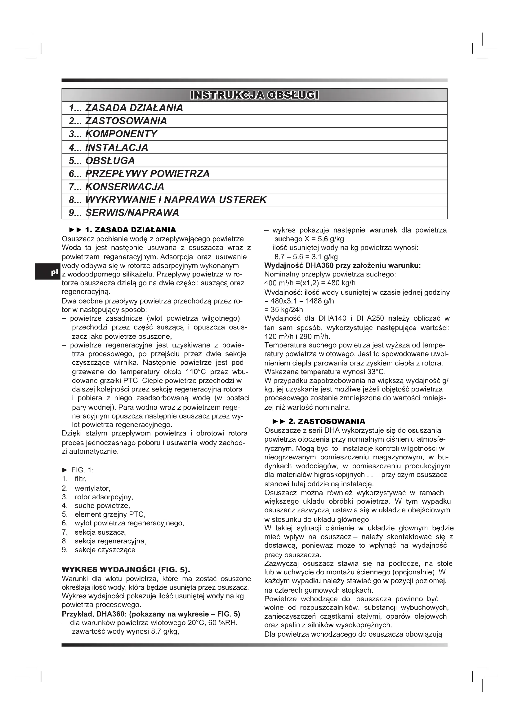 Uwaga: DHA140 nie posiada zainstalowanego am- peromierza tablicowego. W przypadku tego urządzenia wartość natężenia prądu należy mierzyć za pomocą am- peromierza. WAŻNE: Przepływ powietrza regeneracyjnego musi być zawsze kontrolowany. Należy sprawdzić przewód umożliwiający swobodny przepływ powietrza regeneracyjnego. Należy również upewnić się, czy przewód powietrza regeneracyjnego posiada odprowadzenie kondensa- tu z osuszacza. W PRZYPADKU DHA360: URUCHAMIANIE GRZAŁEK: Obie grzałki E1 i E2 uruchamiane są przekaźnikiem z opóźnieniem E1 wynoszącym 30 sekund. Na amperomierzu zostanie to wskazane w następujący sposób: – gdy osuszacz jest włączony, amperomierz wskazuje wartość 10A w ciągu ok. 5 sek., a następnie wartość ta zmniejsza się do 5A. – po 30 sek. włącza się grzałka E1, a amperomierz wskazuje wartość ok. 18A przez 5 sek., a następnie wartość ta spada do 8A przy prawidłowo wyregulo- wanym przepływie powietrza regeneracyjnego. Po wyregulowaniu ustawień elektrycznych oraz przepływów powietrza, osuszacz będzie kontynuował pracę automatycznie przy pomocy wewnętrznych funk- cji sterowania i bezpieczeństwa, kontrolowanych przez zewnętrzny higrostat. ► 7. KONSERWACJA Osuszacze DHA wymagają konserwacji jedynie w nie- wielkim zakresie. Wszystkie elementy są bezobsługowe, co oznacza, że smarowanie lub regulacja nie są wyma- gane. W warunkach normalnej pracy należy sprawdzić jedynie trzy rzeczy: – ltr powietrza powinien być wymieniany przynajmniej co 2 miesiące, w przypadku instalacji stacjonarnej. Jeżeli urządzenie używane jest w wypożyczalni, po- ziom pyłu w obrabianym powietrzu może być wysoki. W takim przypadku ltr należy wymieniać z większą częstotliwością. Przy wymianie ltra należy również oczyścić obudowę oraz rotor. – obroty rotora należy kontrolować raz w miesiącu, – należy często sprawdzać zużycie energii przez grzałki elektryczne (odczyt na amperomierzu, z wyjątkiem DHA140). Obroty rotora można kontrolować poprzez wylot suchego powietrza, w przypadku gdy przewód nie jest podłączony. Rotor powinien obracać się w kierunku zgodnym z ruchem wskazówek zegara. Jeżeli rotor obraca się podczas pracy, a zużycie ener- gii grzałki elektrycznej wskazuje nominalną wartość natężenia prądu, można mieć pewność, że osus- zacz funkcjonuje w sposób optymalny. Niemniej jed- nak zalecamy okresową kontrolę całego osuszacza, aby przekonać się, czy wszystkie funkcje wewnętrzne działają prawidłowo. Zalecamy również sprawdzenie us- zczelek i części ruchomych pod kątem zużycia. Czynności te zapewnią maksymalną wydajność oraz uniemożliwią straty energii.