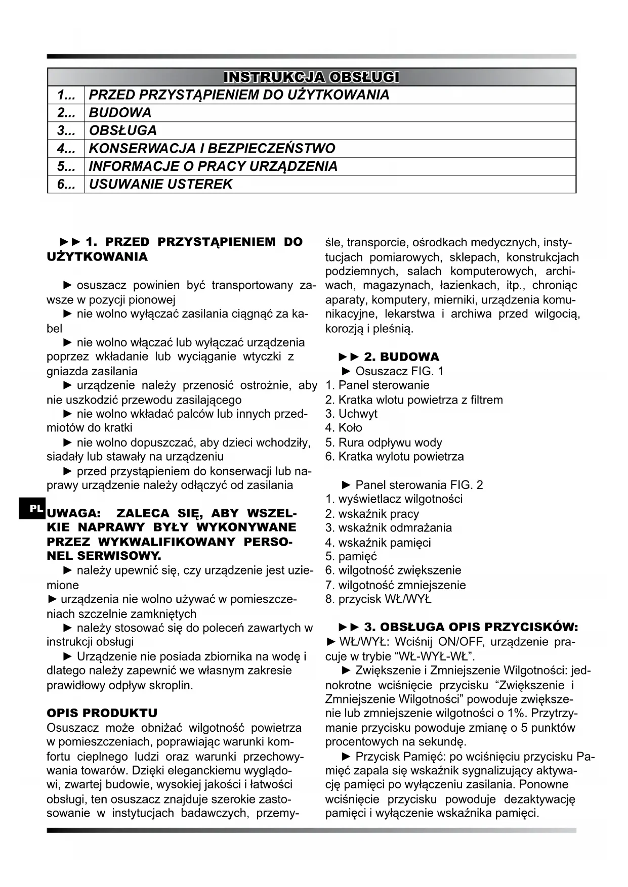 ► 3. ObSłUGA OPIS PRZYCISKów: ► WŁ/WYŁ: Wciśnij ON/OFF, urządzenie pra- cuje w trybie “WŁ-WYŁ-WŁ”. ► Zwiększenie i Zmniejszenie Wilgotności: jed- nokrotne wciśnięcie przycisku “Zwiększenie i Zmniejszenie Wilgotności” powoduje zwiększe- nie lub zmniejszenie wilgotności o 1%. Przytrzy- manie przycisku powoduje zmianę o 5 punktów procentowych na sekundę. ► Przycisk Pamięć: po wciśnięciu przycisku Pa- mięć zapala się wskaźnik sygnalizujący aktywa- cję pamięci po wyłączeniu zasilania. Ponowne wciśnięcie przycisku powoduje dezaktywację pamięci i wyłączenie wskaźnika pamięci. INSTRUKCJA ObSłUGI 1... PRZED PRZYSTąPIENIEM DO UŻYTKOWANIA 2... BUDOWA 3... OBSŁUGA 4... KONSERWACJA I BEZPIECZEńSTWO 5... INfORMACJE O PRACY URZąDZENIA 6... USUWANIE USTEREKBG
