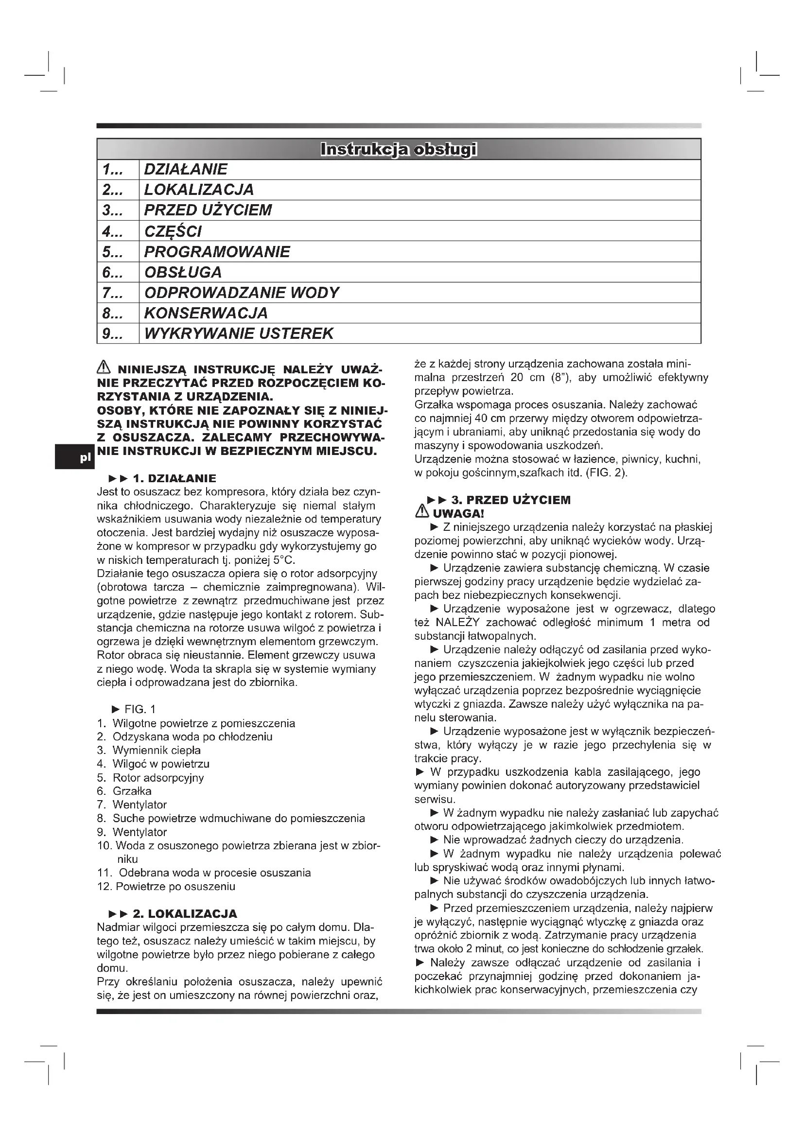 NIE INSTRUKCJI W BEZPIECZNYM MIEJSCU. ► 1. DZIAŁANIE Jest to osuszacz bez kompresora, który działa bez czyn- nika chłodniczego. Charakteryzuje się niemal stałym wskaźnikiem usuwania wody niezależnie od temperatury otoczenia. Jest bardziej wydajny niż osuszacze wyposa- żone w kompresor w przypadku gdy wykorzystujemy go w niskich temperaturach tj. poniżej 5°C. Działanie tego osuszacza opiera się o rotor adsorpcyjny (obrotowa tarcza – chemicznie zaimpregnowana). Wil- gotne powietrze z zewnątrz przedmuchiwane jest przez urządzenie, gdzie następuje jego kontakt z rotorem. Sub- stancja chemiczna na rotorze usuwa wilgoć z powietrza i ogrzewa je dzięki wewnętrznym elementom grzewczym. Rotor obraca się nieustannie. Element grzewczy usuwa z niego wodę. Woda ta skrapla się w systemie wymiany ciepła i odprowadzana jest do zbiornika. ► FIG. 1