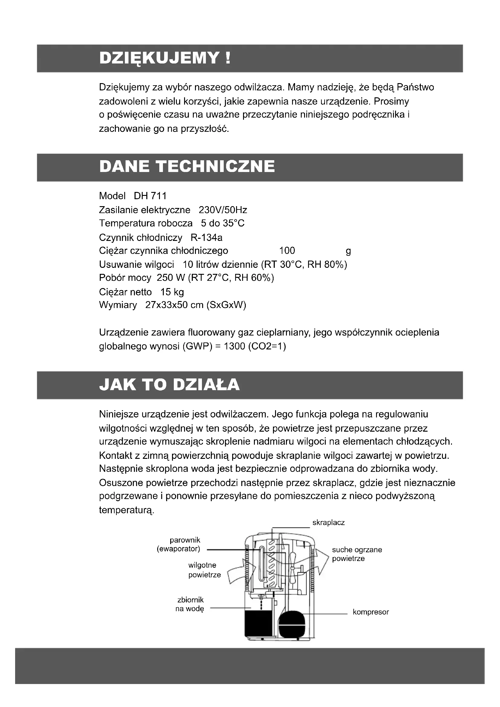 =1) Urządzenie zawiera fluorowany gaz cieplarniany, jego wspóáczynnik ocieplenia globalnego wynosi (GWP) = 1300 DZIĘKUJEMY ! Dziękujemy za wybór naszego odwilżacza. Mamy nadzieję, że będą Państwo zadowoleni z wielu korzyści, jakie zapewnia nasze urządzenie. Prosimy o poświęcenie czasu na uważne przeczytanie niniejszego podręcznika i zachowanie go na przyszłość. DANE TECHNICZNE Model DH 711 Zasilanie elektryczne 230V/50Hz Temperatura robocza 5 do 35°C Czynnik chłodniczy R-134a Ciężar czynnika chłodniczego 100 g Usuwanie wilgoci 10 litrów dziennie (RT 30°C, RH 80%) Pobór mocy 250 W (RT 27°C, RH 60%) Ciężar netto 15 kg Wymiary 27x33x50 cm (SxGxW) Urządzenie zawiera fl uorowany gaz cieplarniany, jego współczynnik ocieplenia globalnego wynosi (GWP) = 1300 (CO2=1)