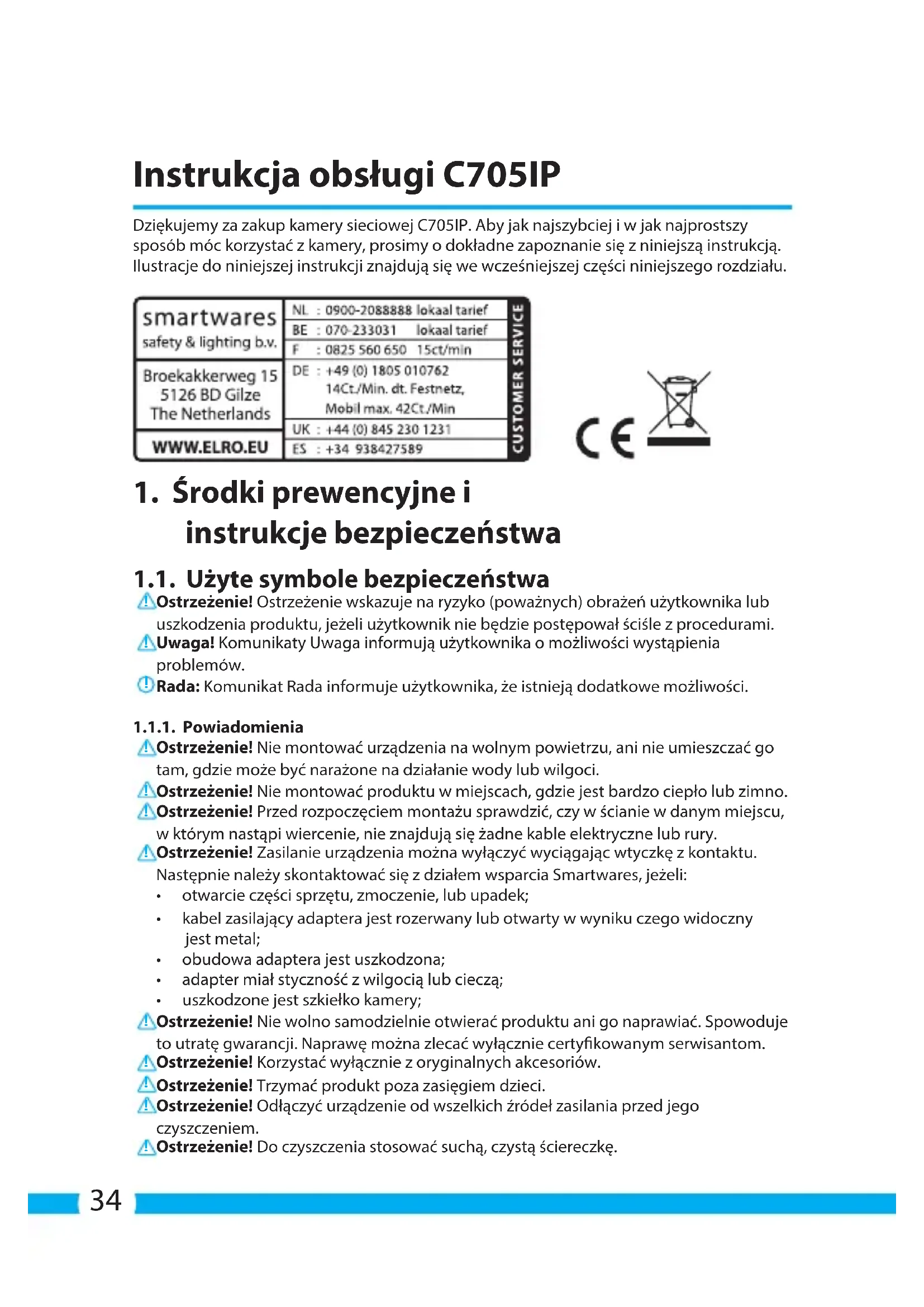 Für dieses Gerät gilt eine eingeschränkte Garantie von 3 Jahr(en). Die Garantiebedingungen nden Sie auf: www.elro.eu.34 Instrukcja obsługi C705IP Dziękujemy za zakup kamery sieciowej C705IP. Aby jak najszybciej i w jak najprostszy sposób móc korzystać z kamery, prosimy o dokładne zapoznanie się z niniejszą instrukcją. Ilustracje do niniejszej instrukcji znajdują się we wcześniejszej części niniejszego rozdziału.