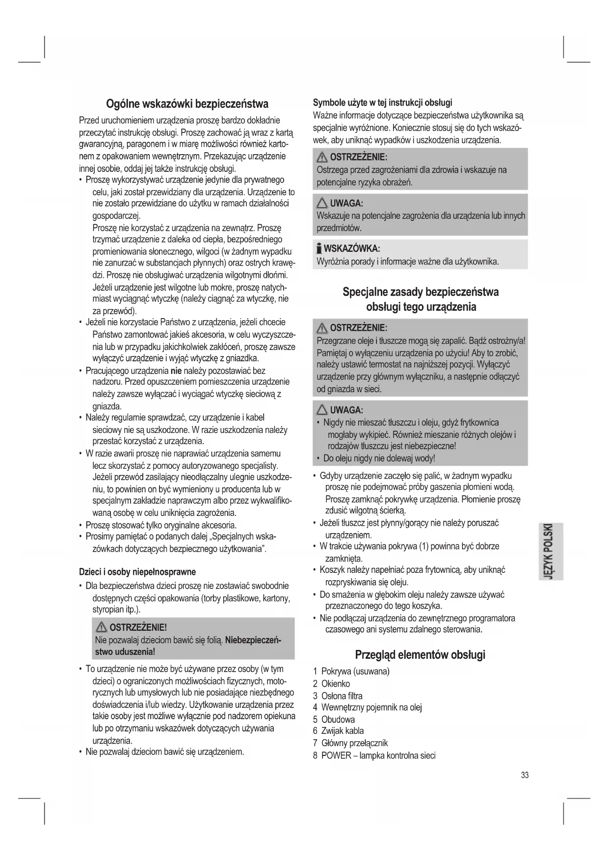 1 Pokrywa (usuwana) 2 Okienko 3 Osłona ltra 4 Wewnętrzny pojemnik na olej 5 Obudowa 6 Zwijak kabla 7 Główny przełącznik 8 POWER – lampka kontrolna sieci34 9 HEATING – lampka kontrolna temperatury 10 Regulator temperatury 11 Przycisk do otwierania pokrywy 12 Przycisk obniżania koszyka smażenia 13 Uchwyt 14 Koszyk do smażenia