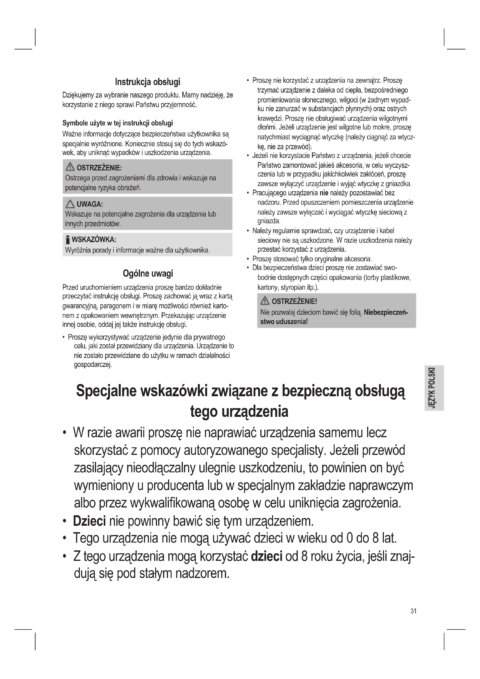 - Proszę wykorzystywać urządzenie jedynie dla prywatnego celu, jaki został przewidziany dla urządzenia. Urządzenie to nie zostało przewidziane do użytku w ramach działalności gospodarczej. Specjalne wskazówki związane z bezpieczną obsługą tego urządzenia