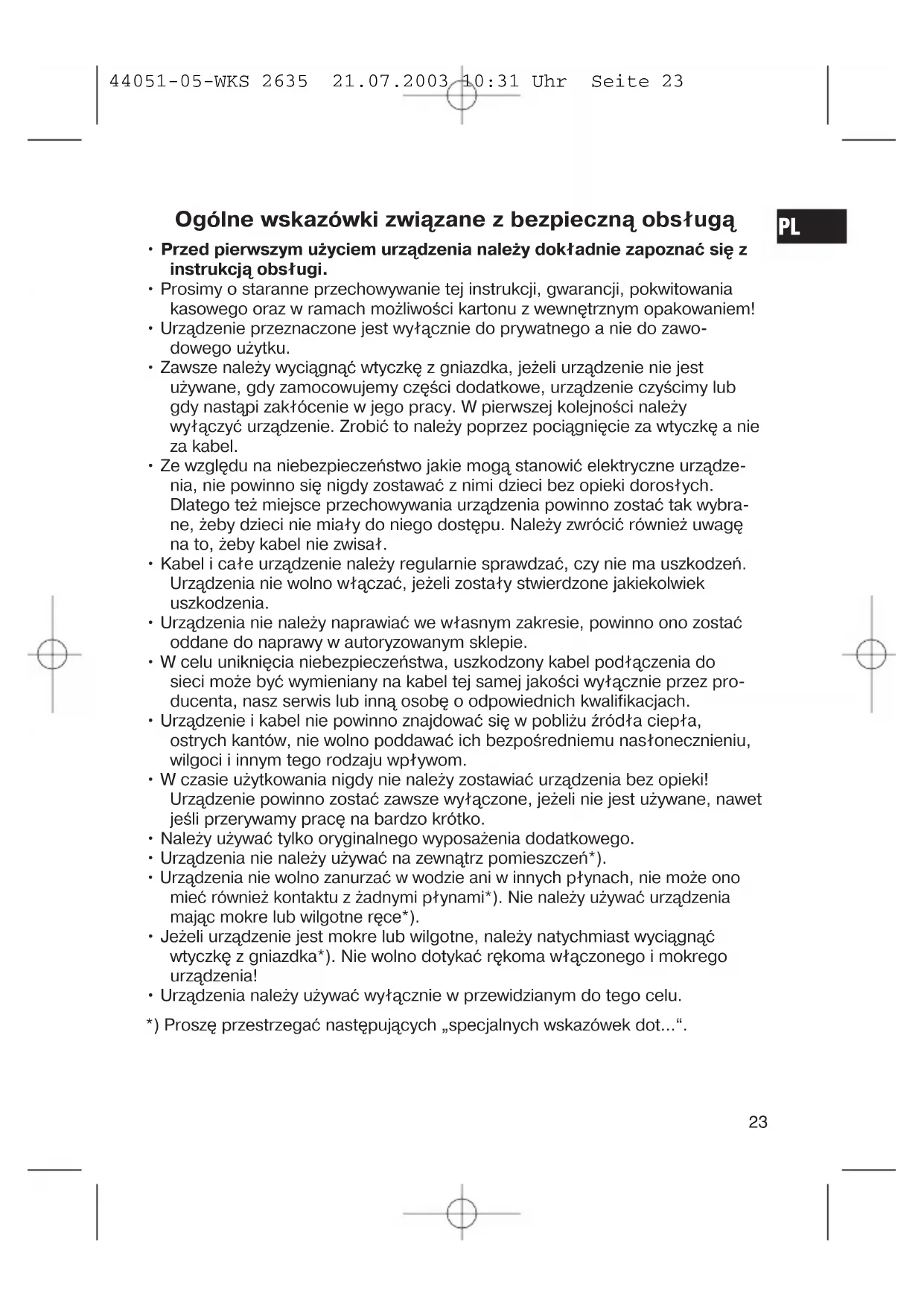 W czasie uzytkowania nigdy nie nalewy zostawiac urzadzenia bez opieki! Urzadzenia powinno zostac zawsze wyłaczone, jejeli nie jest uzywane, nawe ti przywamy prace na bardzo krótko. - Nalezy uzywać tylko oryginalnégo wyposañenia dodatkowej.