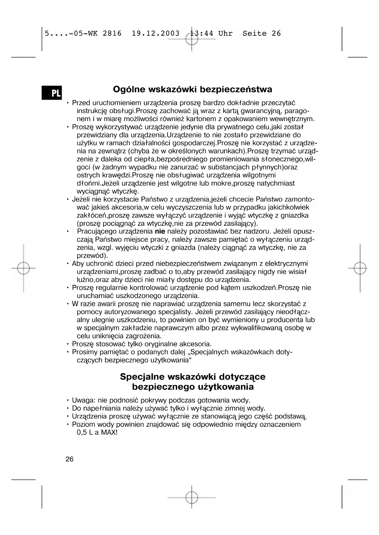 5....-05-WK 2816 19.12.2003 13:44 Uhr Seite 26• Proszę nie napełniać wody ponad linię oznaczającą poziom maksymalny, w przeciwnym razie wrząca woda może zacząć wypryskiwać z czajnika i spo- wodować oparzenia!