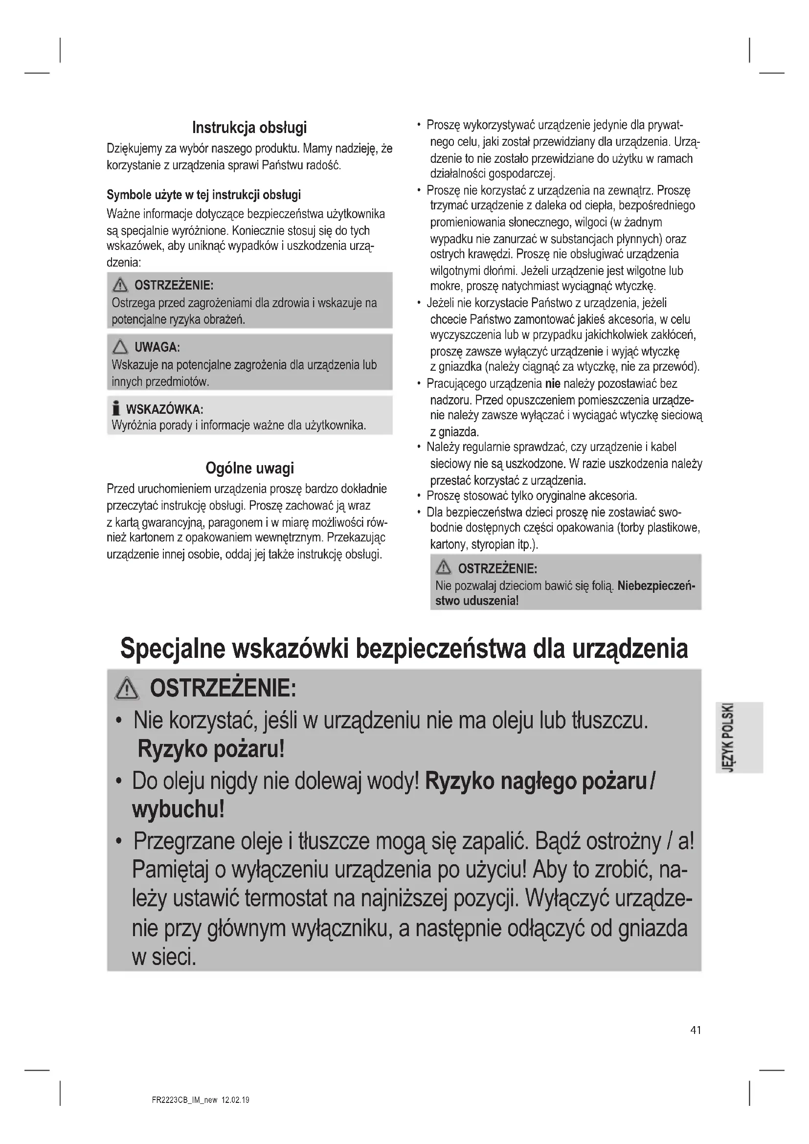 - Przegrzane oleje i tłuszcze mogą się zapalić. Bądź ostrożny / a! Pamiętaj o wyłączeniu urządzenia po użyciu! Aby to zrobić, na- leży ustawić termostat na najniższej pozycji. Wyłączyć urządze- nie przy głównym wyłączniku, a następnie odłączyć od gniazda w sieci.FR2223CB_IM_new 12.02.19