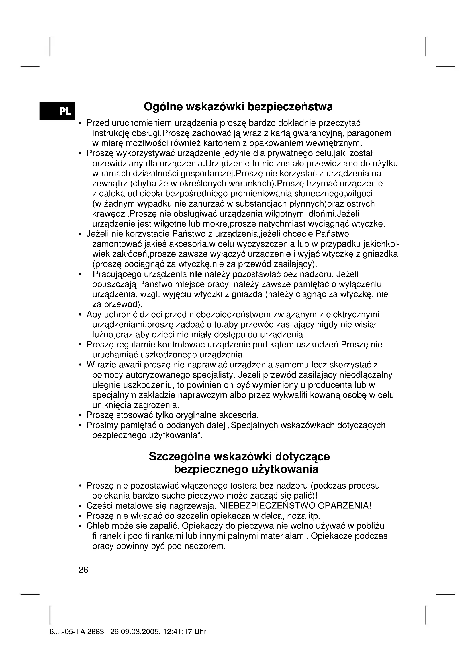 Prosze nie wiktadać do szczelin opiekacja widelca, noza itp. - Chlebmösiezapalić. Opiekacitydo pieczywa niewolno uzywac w povlizu fi ranek i pod fi rankami lub innymi palnymi materialami. Opiekacze podczas pracy powinny byc pod nadzorem.
