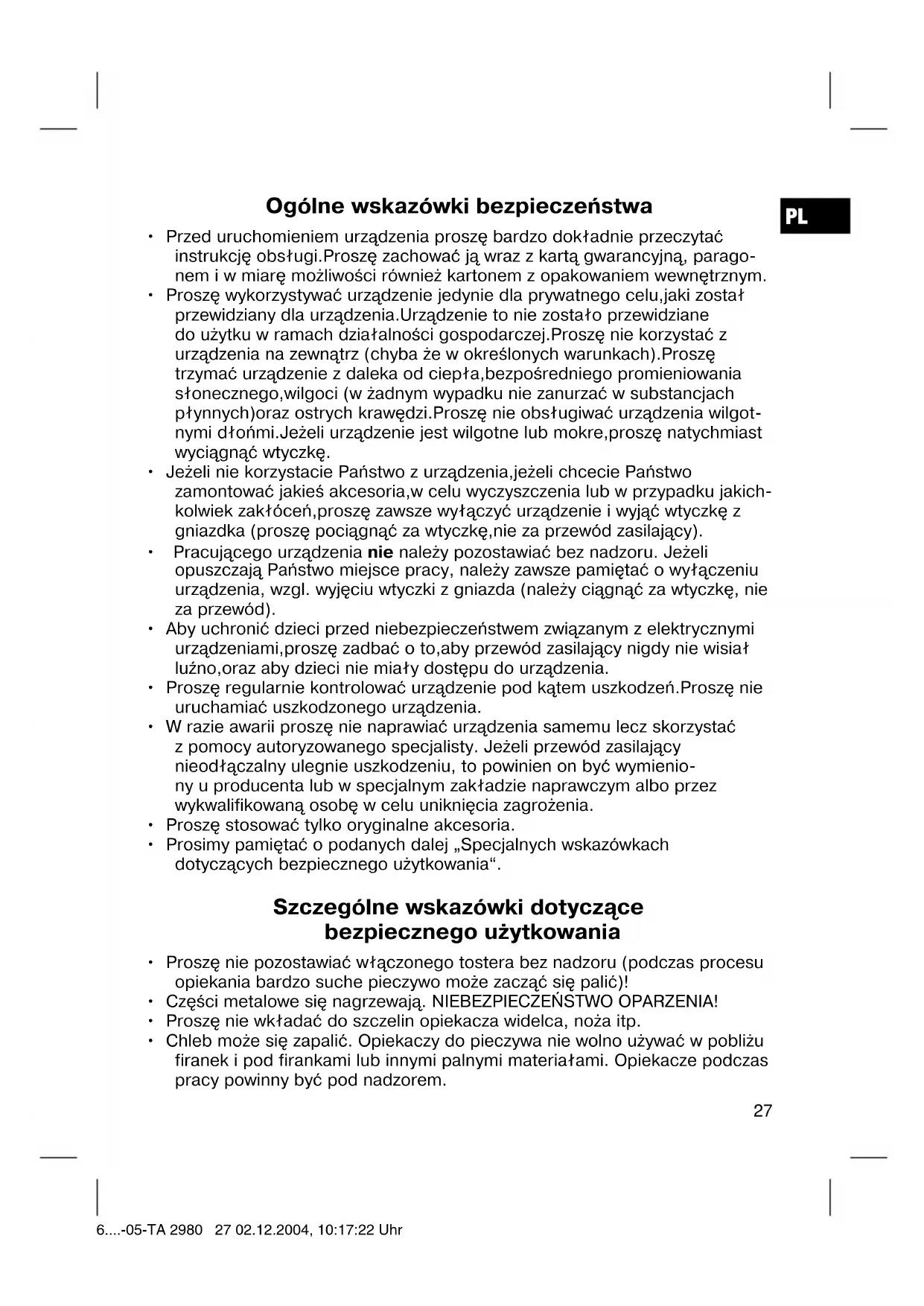 Prosze nie wiktadać do szczelin opiekacja widelca, noza itp. - Chleb要去 Zapalic. Opiekacity do pieczywa nie wolno uzywac w povlizu firanek i pod firankami lub innymi palnymi materiałami. Opiekacie podczas pracy powinny byc pod nadzorem.