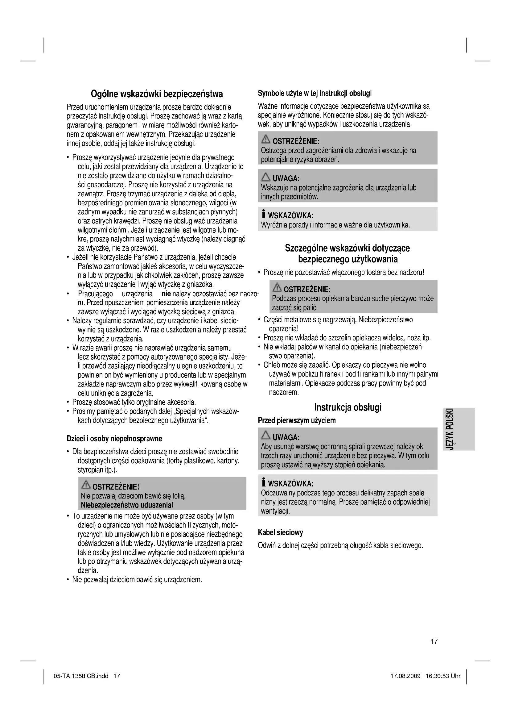 - Chleb要去zapalic. Opiekaczycdo pieczywa nie wolno uzywac w oblizu fi ranek i pod fi rankami lub innymi palnymi materialami. Opiekace podczas pracy powinny byc pod nadzorem.